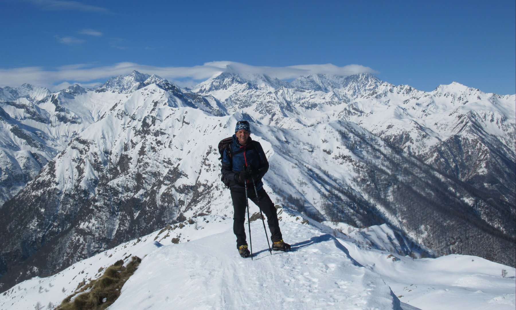 Escursione molto gettonata dagli scialpinisti ma ben fattibile anche con le ciaspole che si sviluppa ai margini del comprensorio sciistico di Domobianca all’Alpe Lusentino. La meta è una vetta molto panoramica che domina la sottostante piana di Villadossola e Domodossola ed offre viste spettacolari sulle alpi dal Rosa, ai vicini 4000 svizzeri, per poi perdersi a 360° su tutta la catena alpina. Trovato gelato nel tratto nel bosco ma saliti con le ciaspole, mentre dall’Alpe Casalvera abbiamo messo per sicurezza i ramponi vista la notevole pendenza e alcuni tratti esposti. Scesi dall’altro versante meno ripido con alcuni tratti a bordo pista. In compagnia di Pier Albino e Giorgio.