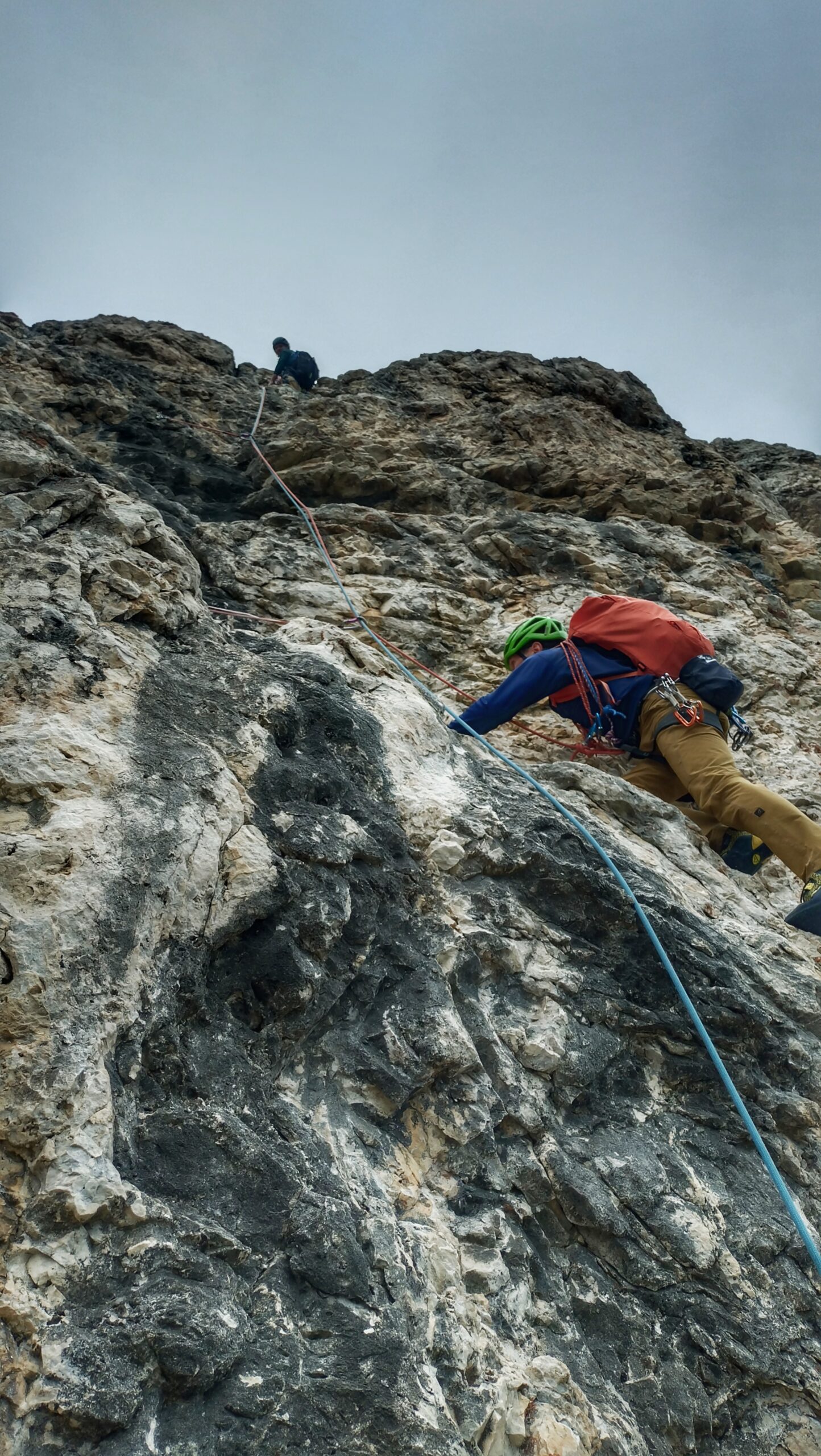 Chi opta per la discesa a piedi, come noi, non rimarrà deluso dagli incredibili paesaggi che circondano questo bastione dove si sviluppa questa bella via. Niente strade, poca gente, silenzio … La via poi non delude, la roccia è solida e bellissima, i tiri mai banali anche sul facile, la chiodatura fa “respirare” nei tratti più duri e infine le soste sono quasi tutte comode. Ti vien voglia di restare in parete …
