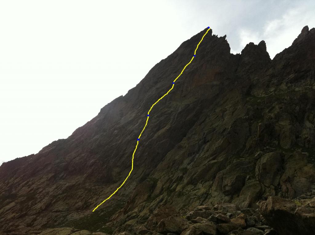 La via attacca nel punto più basso della parete ( spit visibile con cordino nero, consultare relazione dettagliata presso il rifugio)