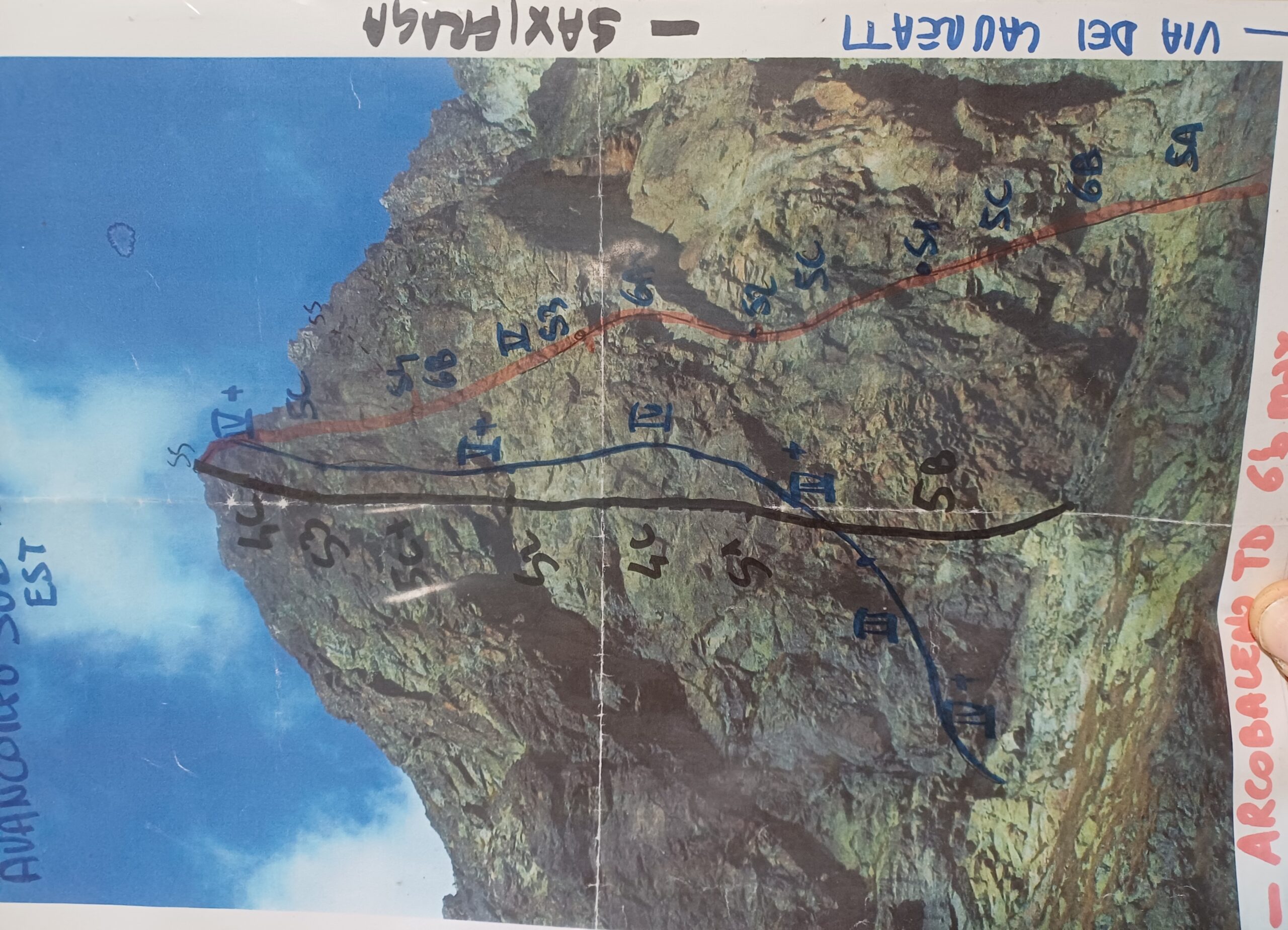 - L1 attaccare la facile placca(5a) fino a raggiungere lo strapiombo .Superarlo direttamente (6b) e con uscita verso sx proseguire su belle vaschette (5b) fino alla sosta. (50 m; 5 spit+2 di sosta).