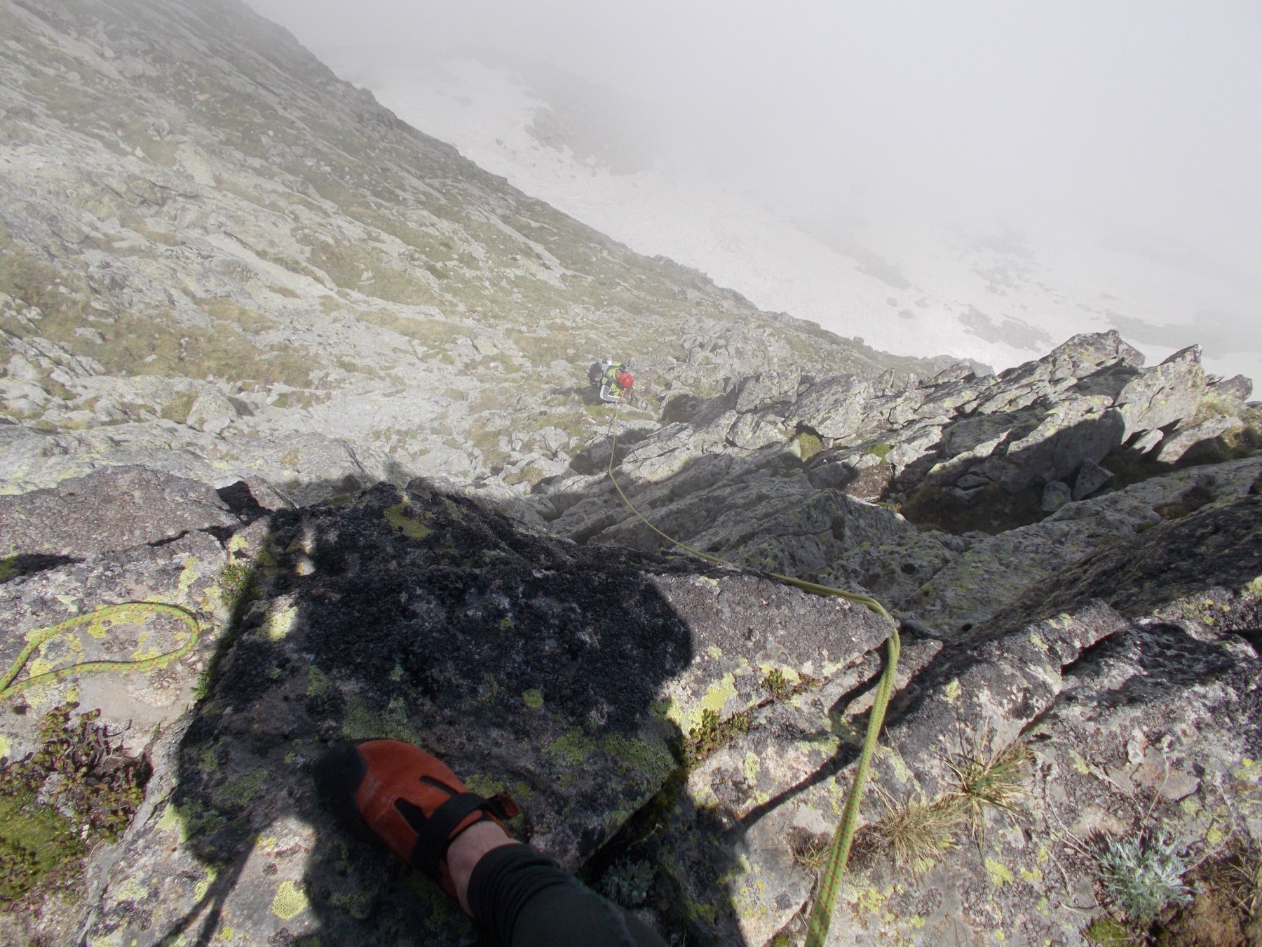 Utilizzata come via di discesa, al seguito della salita alla vetta per lo sperone sud. Mantenuto il filo aereo della cresta fedelmente, a tratti oltre che aerea ed affilata, anche molto lichenosa, e con qualche blocco che muoveva, fino dove una sosta attrezzata con fettuccia sfilacciata ai bordi, che abbiamo rinforzato con aggiunta di un cordino, ci ha consentito con una doppia di 20 m di guadagnare le ripide balze erbose della parete nord, e prendere con succesiva facile disarrampicata, la cengia che tutta in traverso, ci ha ricondotti al punto nodale, ormai fuori dalle difficolta’. Giornata perfetta come meteo voleva fosse da queste parti. Avvento solo di un po’ di nebbia lato nord a pregiudicare la vista sulle Aste e sull’Oriol all’opposto.