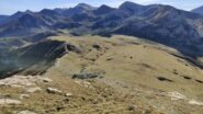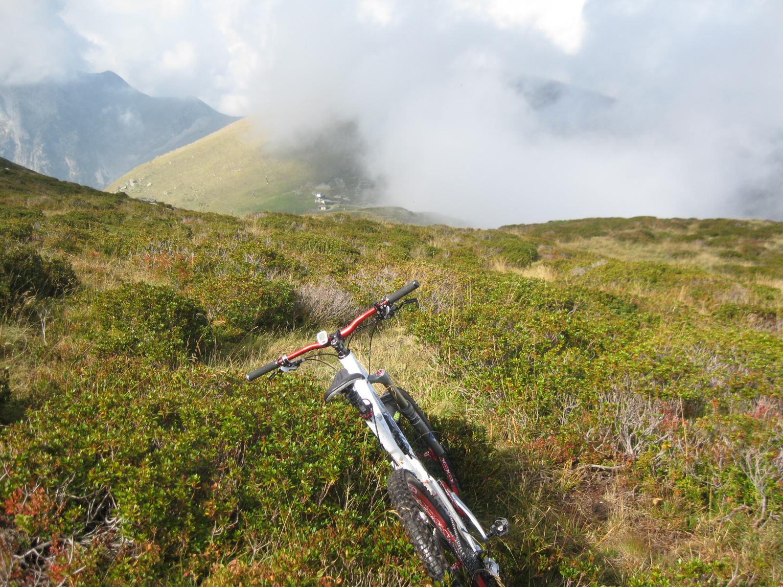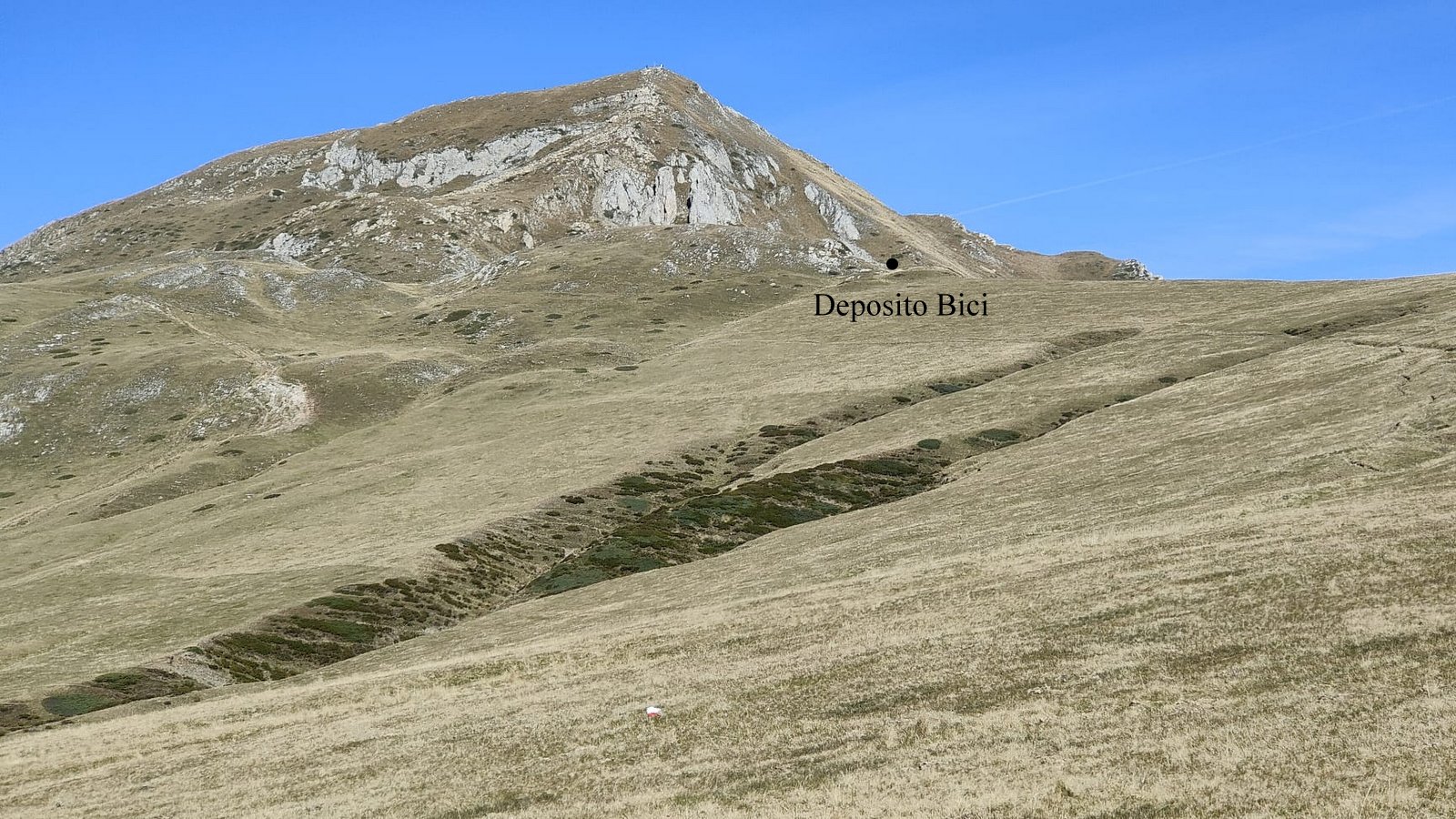 Da qui non ci reste che seguire l’enorme pratone che sale a destra verso la nostra meta ben visibile, seguendo una flebile traccia inerbita pedalando e spingendo fin quando la pendenza diventa eccessiva.