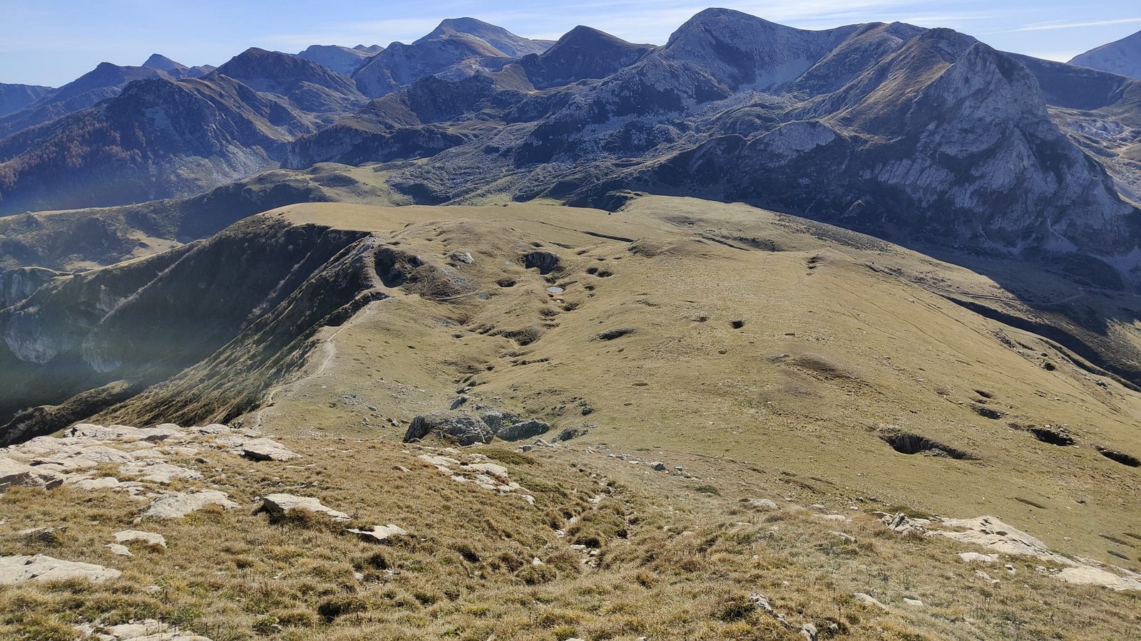 Caricarsi la bici a spalle e facendo un po’ di attenzione siamo in vetta. Per la discesa seguire il sentiero, molto tecnico ed esposto, che costeggia l’orlo della dolina e scende verso ovest.