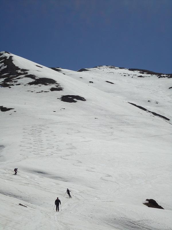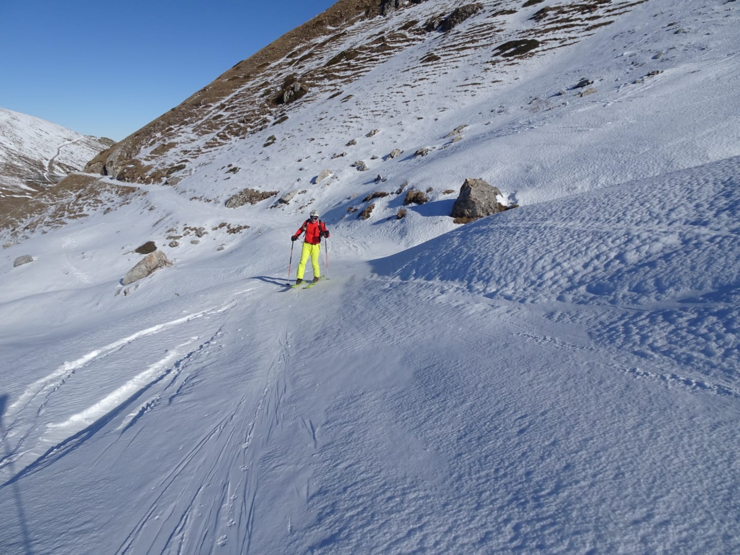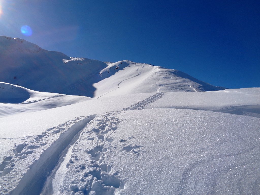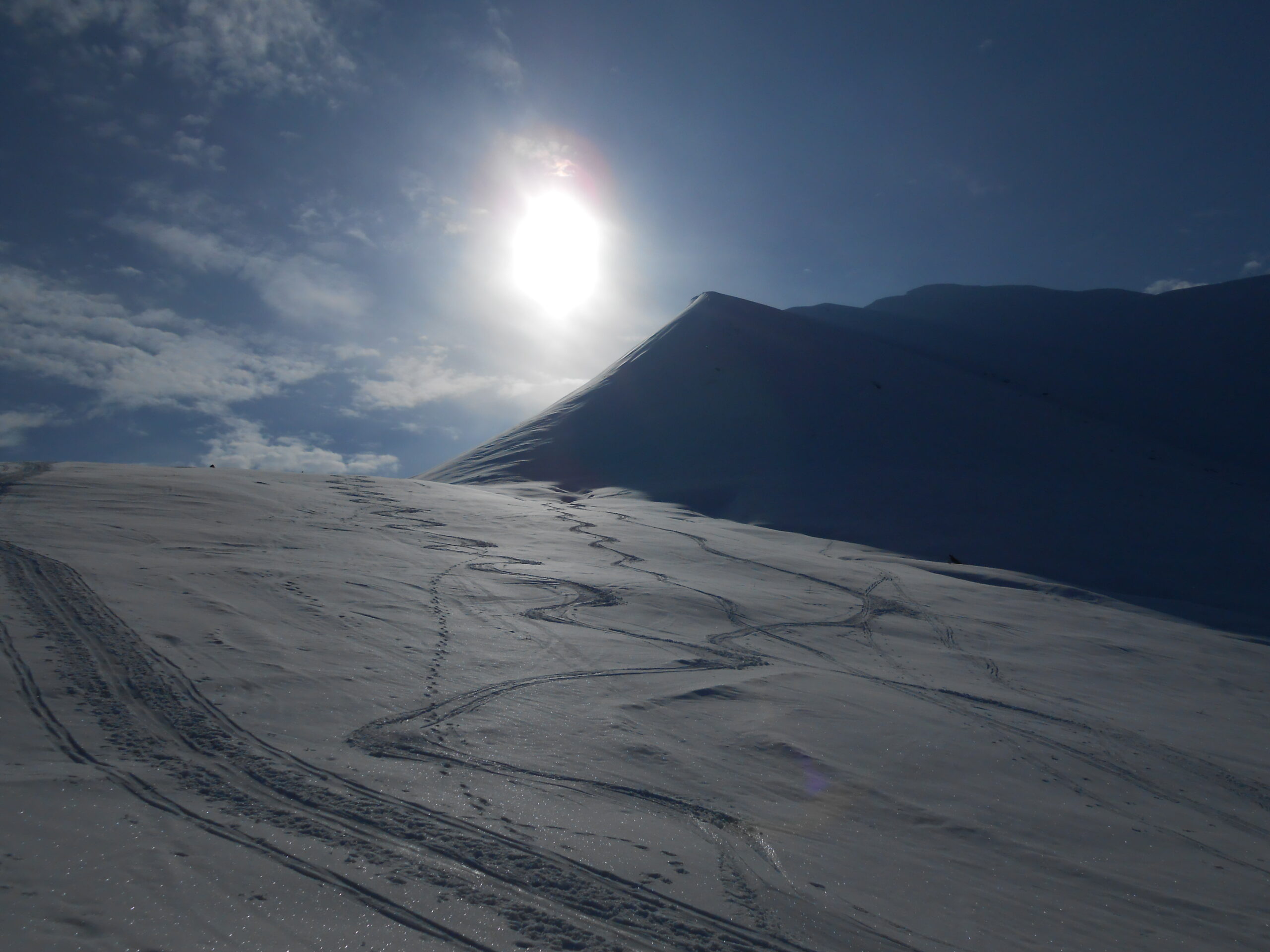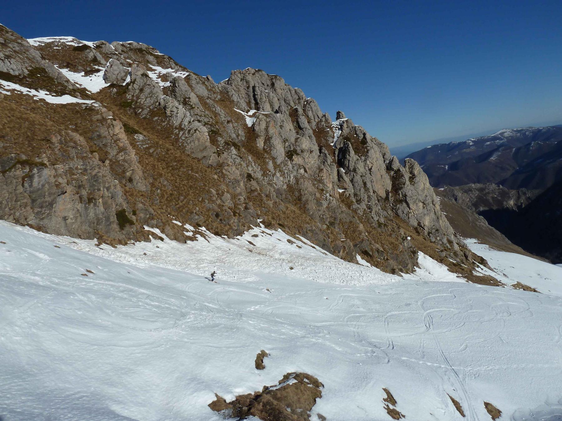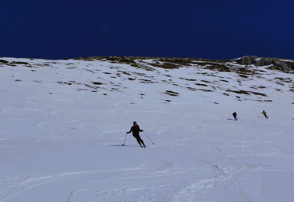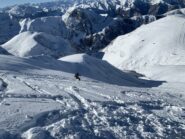 per la discesa ci sono molte varianti che vanno scelte in base all’assestamento del manto, il canalone e le varie dorsali alla sua destra o sinistra richiedono nevi ben assestate oppure si riscende dal versante di salita