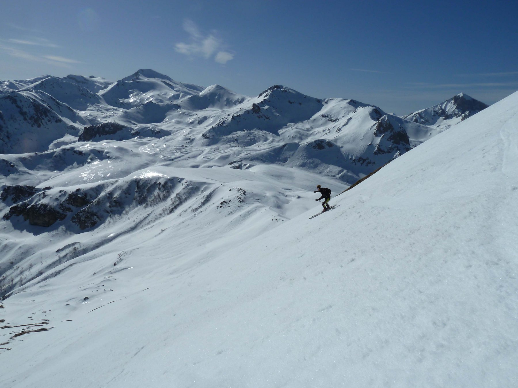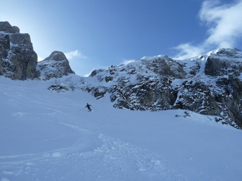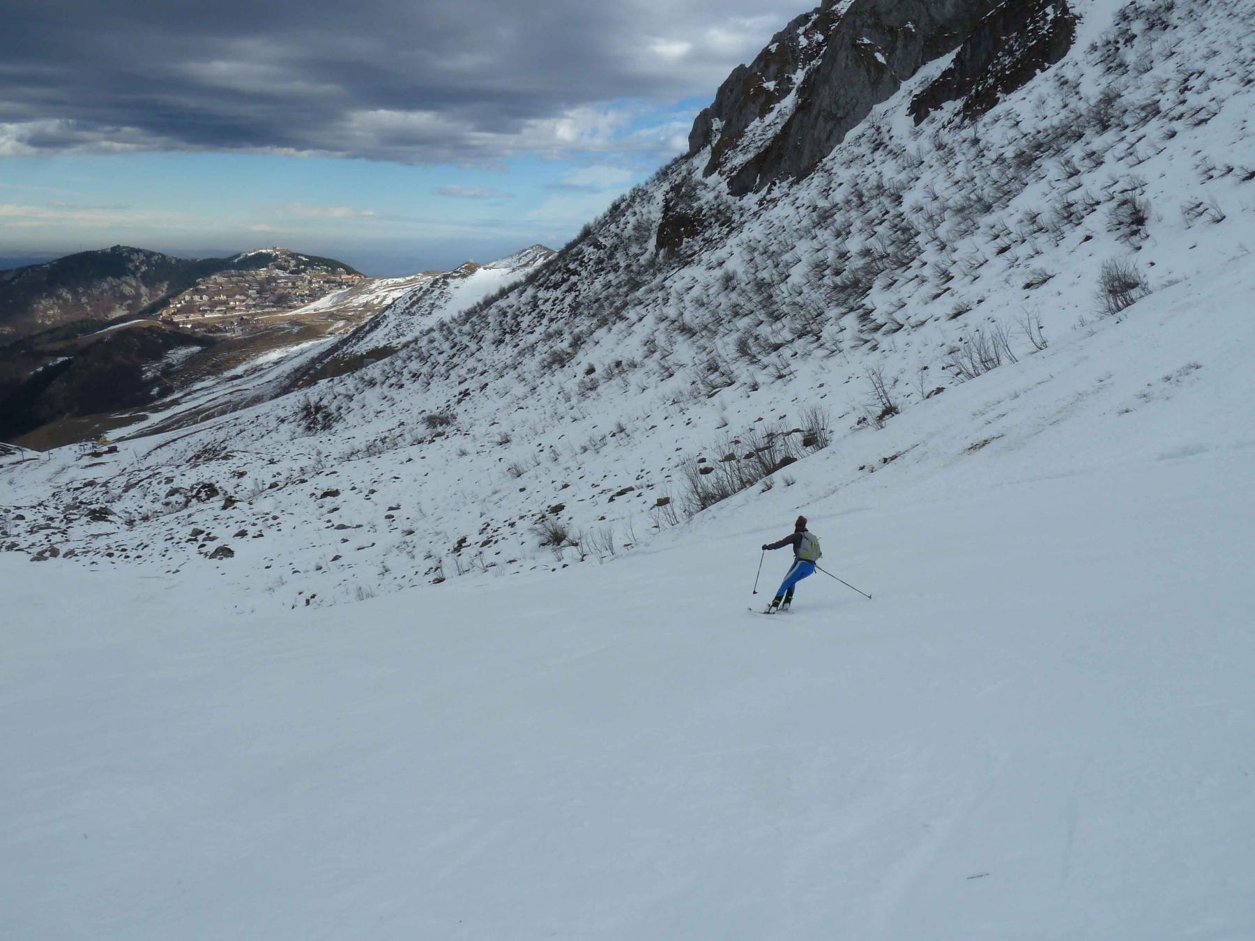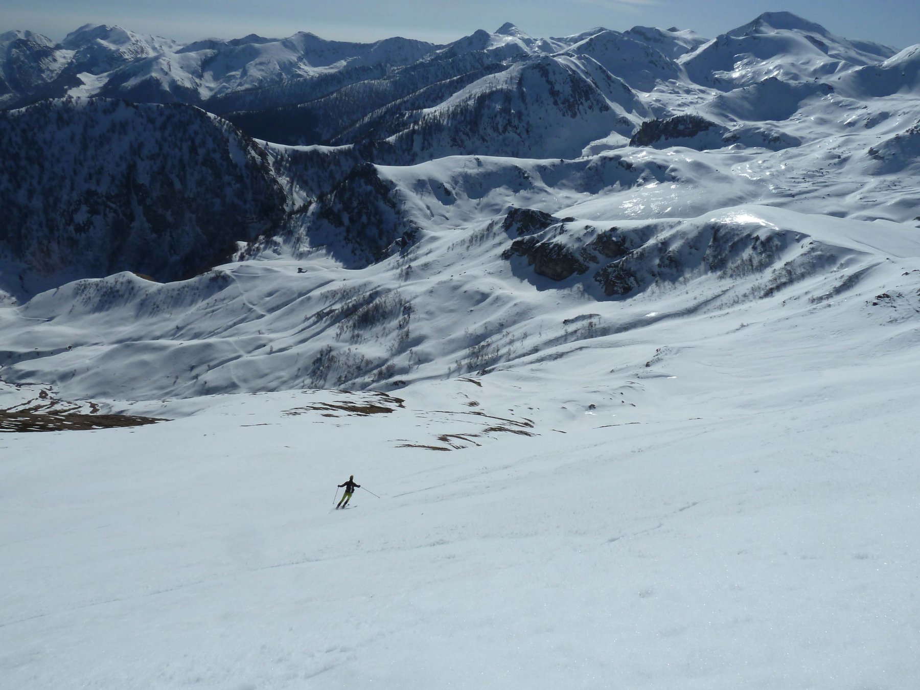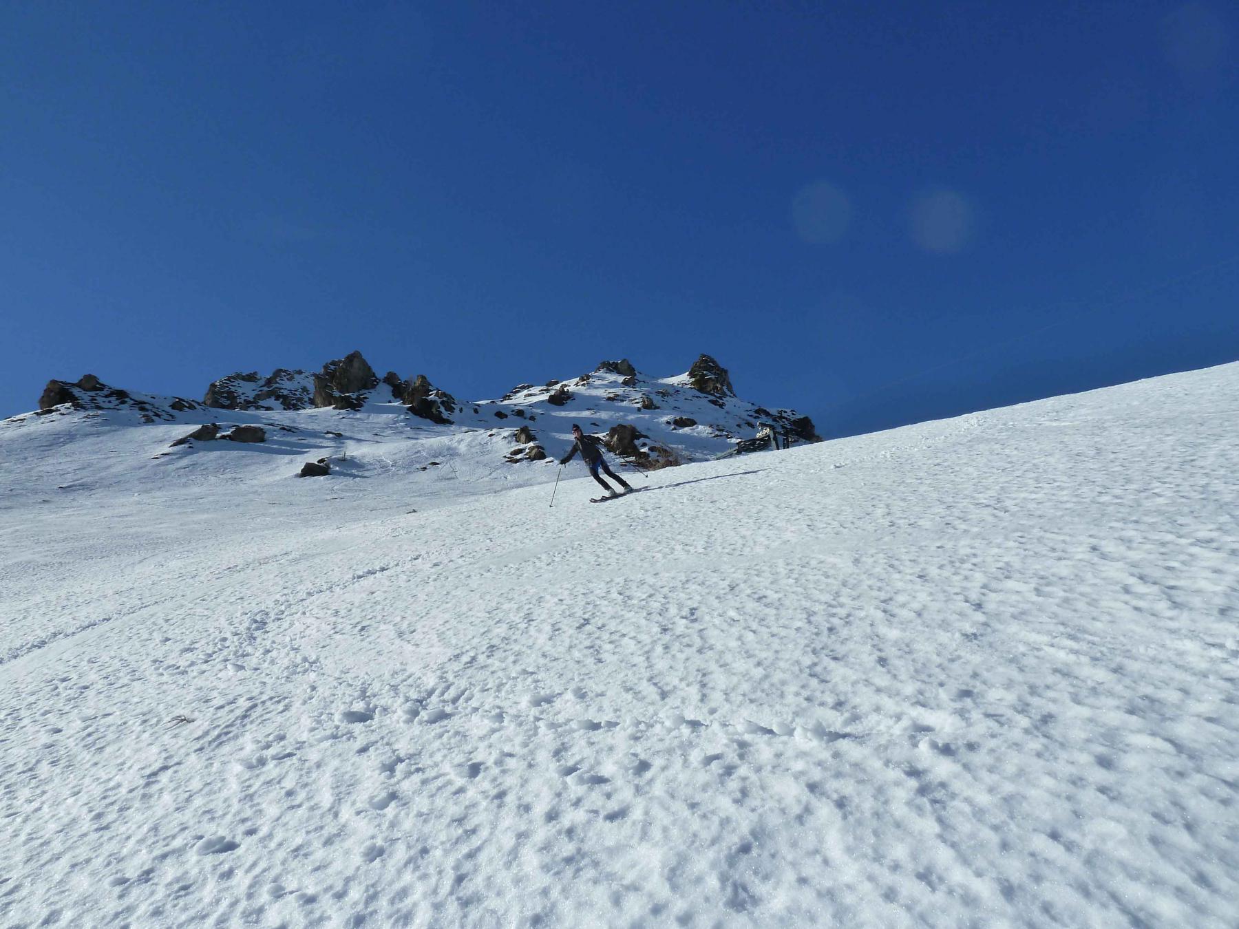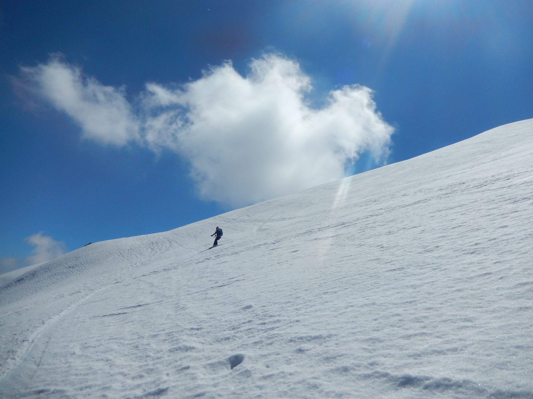 per la discesa ci sono molte varianti che vanno scelte in base all’assestamento del manto, il canalone e le varie dorsali alla sua destra o sinistra richiedono nevi ben assestate oppure si riscende dal versante di salita