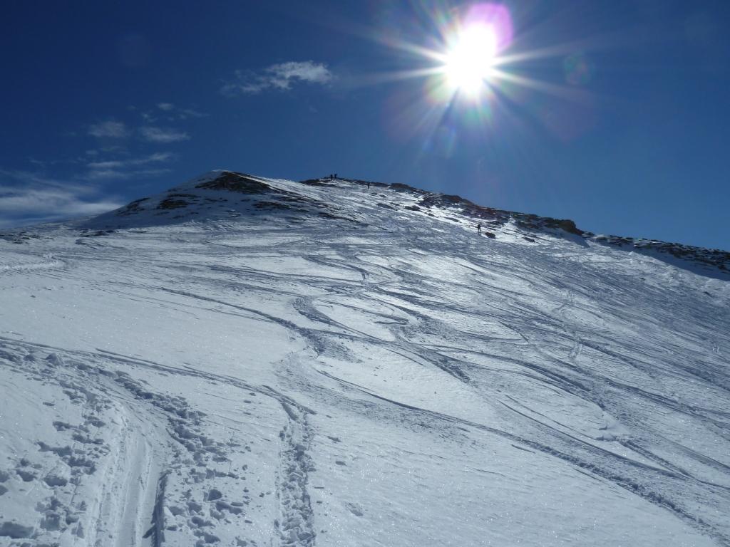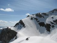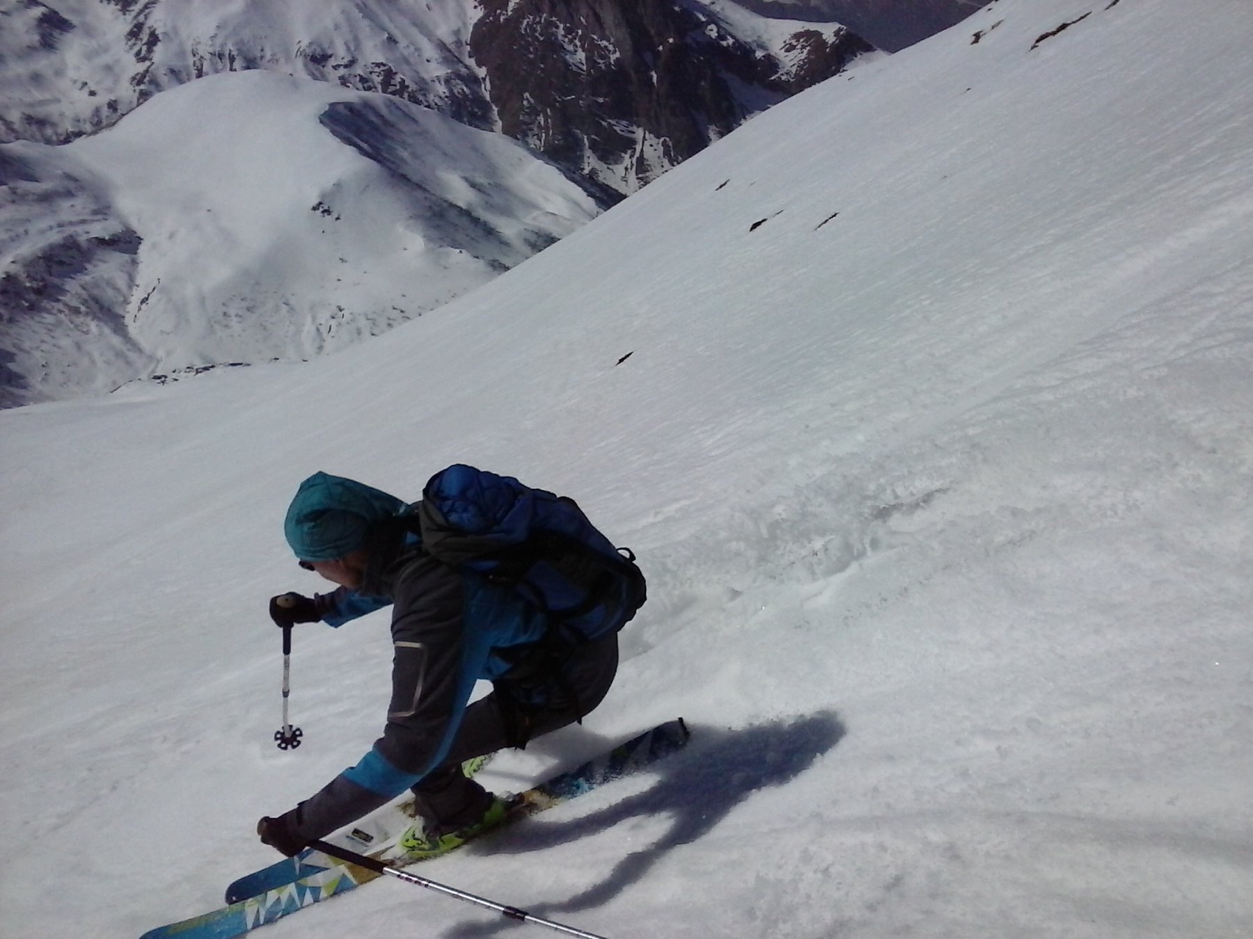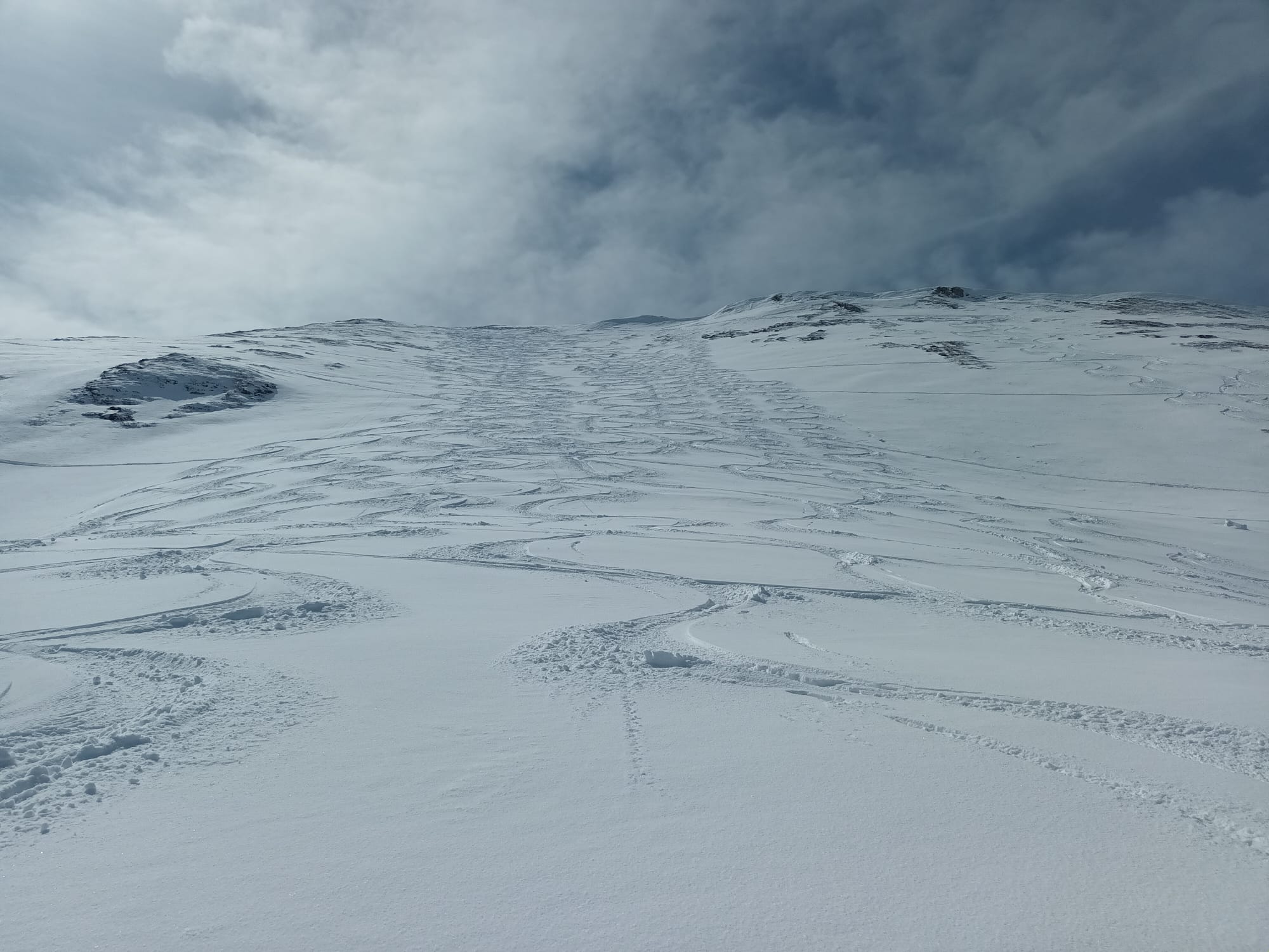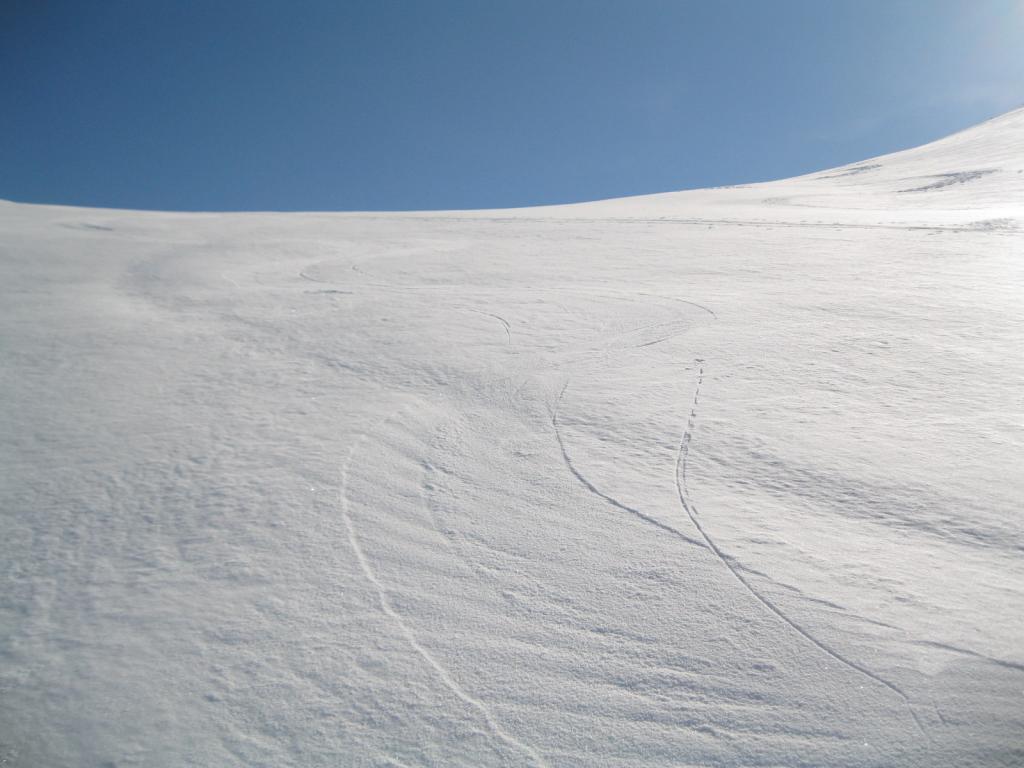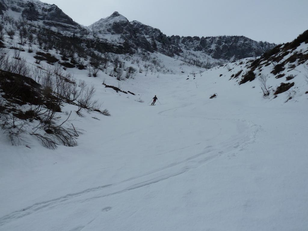 per la discesa ci sono molte varianti che vanno scelte in base all’assestamento del manto, il canalone e le varie dorsali alla sua destra o sinistra richiedono nevi ben assestate oppure si riscende dal versante di salita