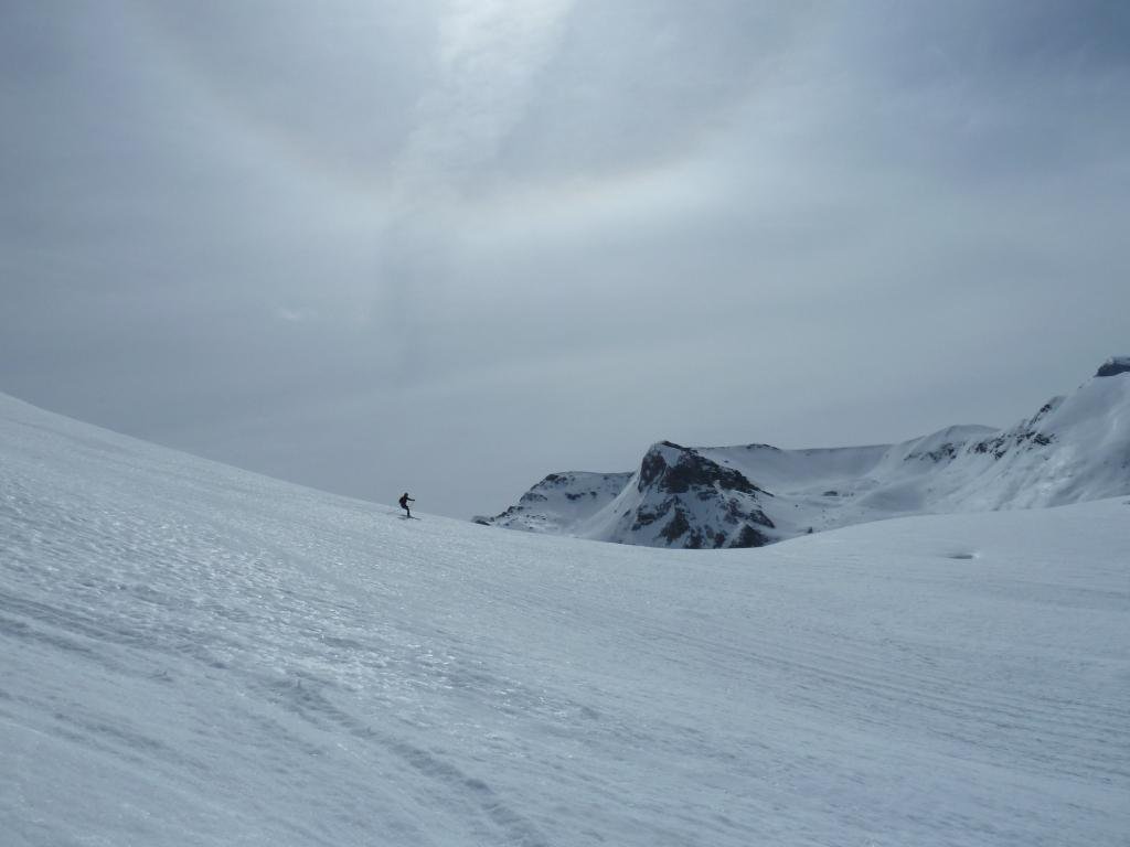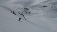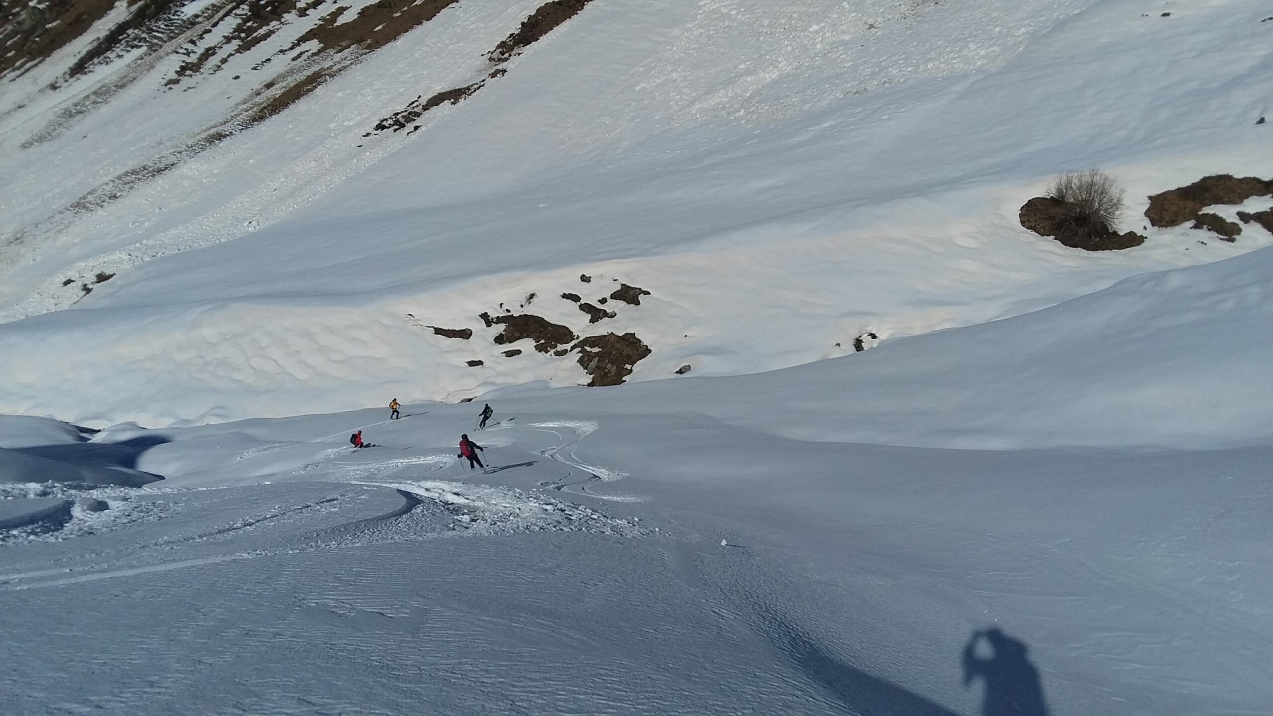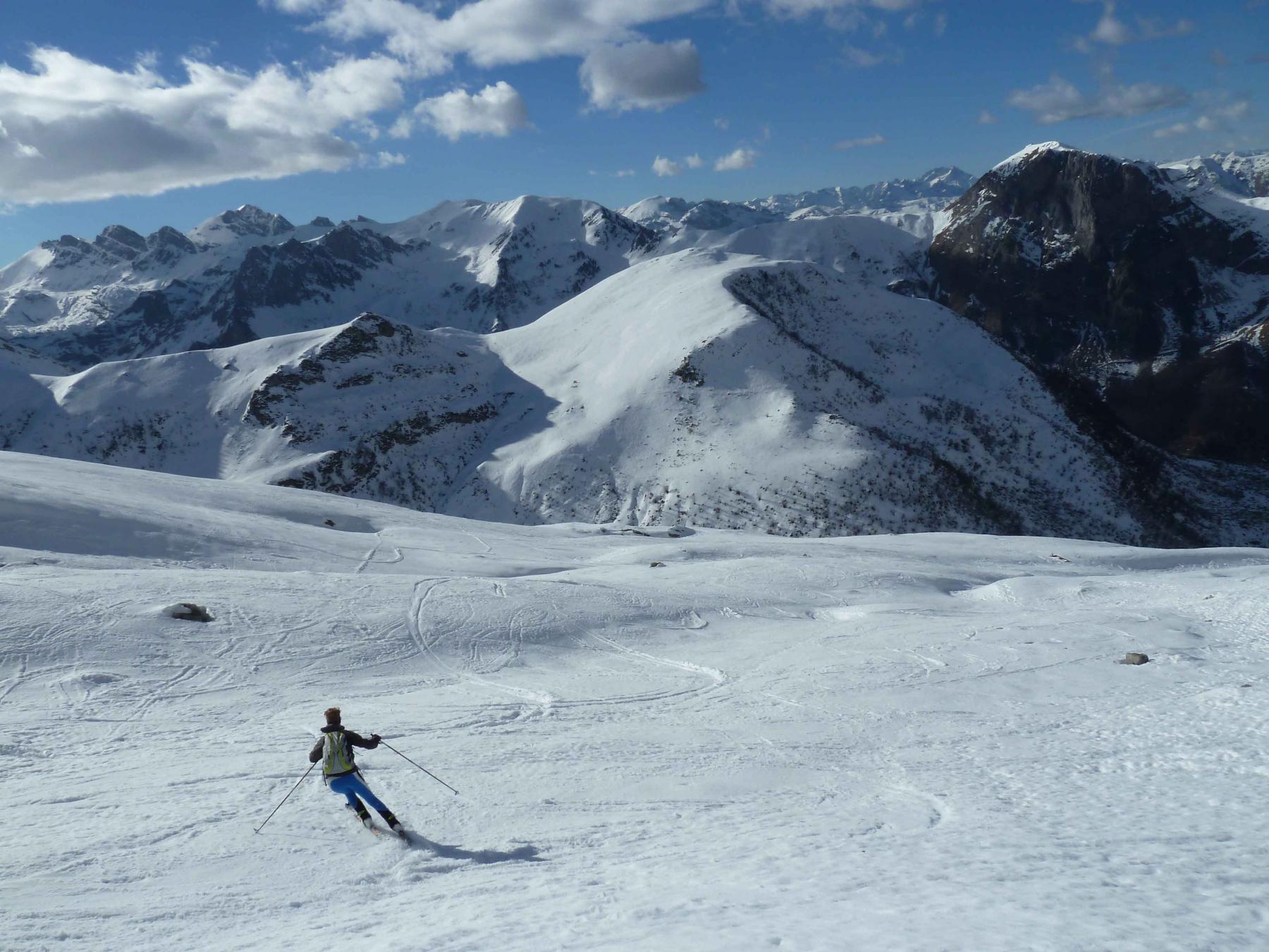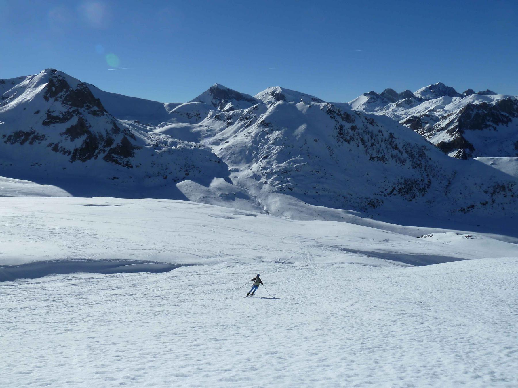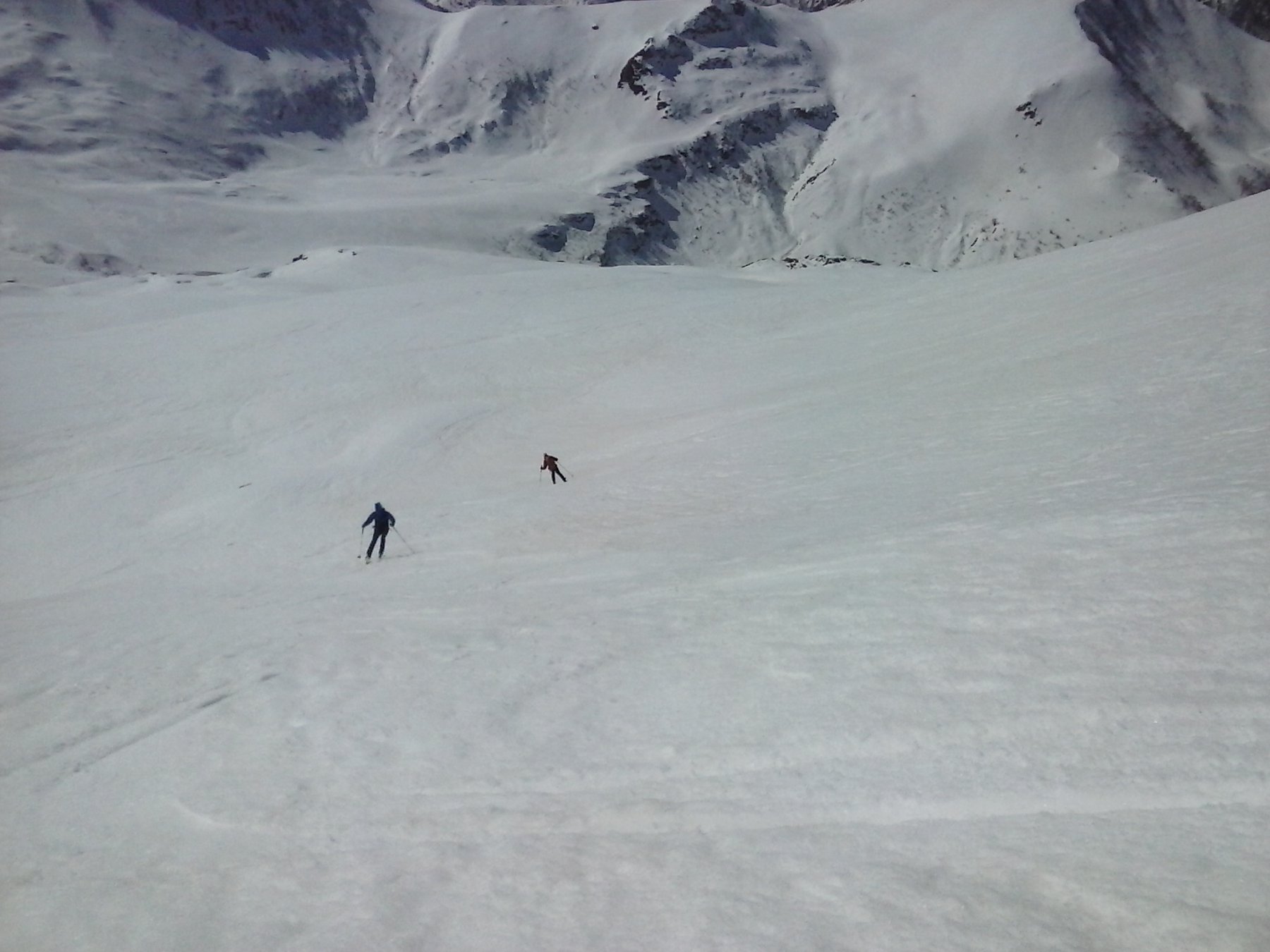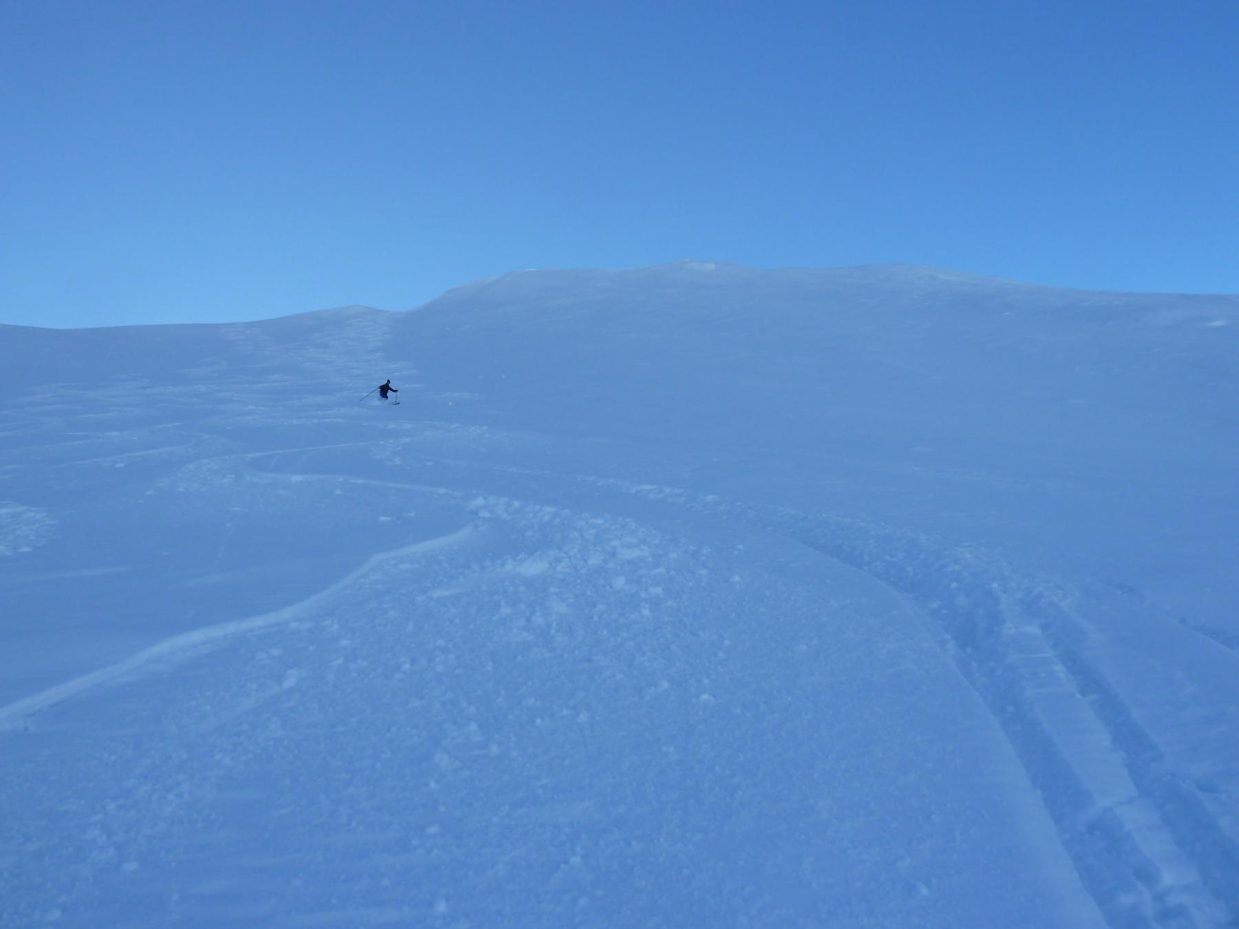 per la discesa ci sono molte varianti che vanno scelte in base all’assestamento del manto, il canalone e le varie dorsali alla sua destra o sinistra richiedono nevi ben assestate oppure si riscende dal versante di salita