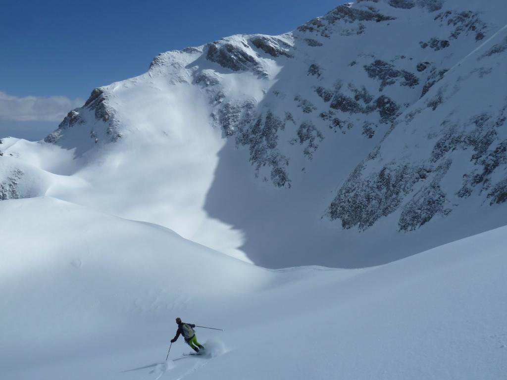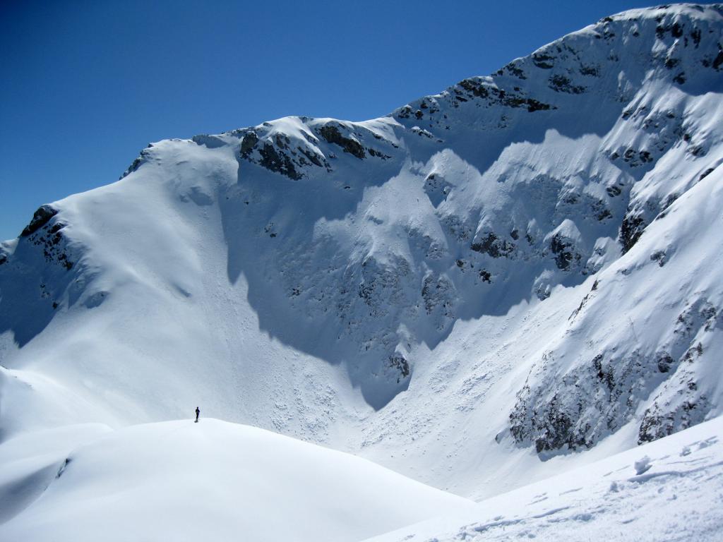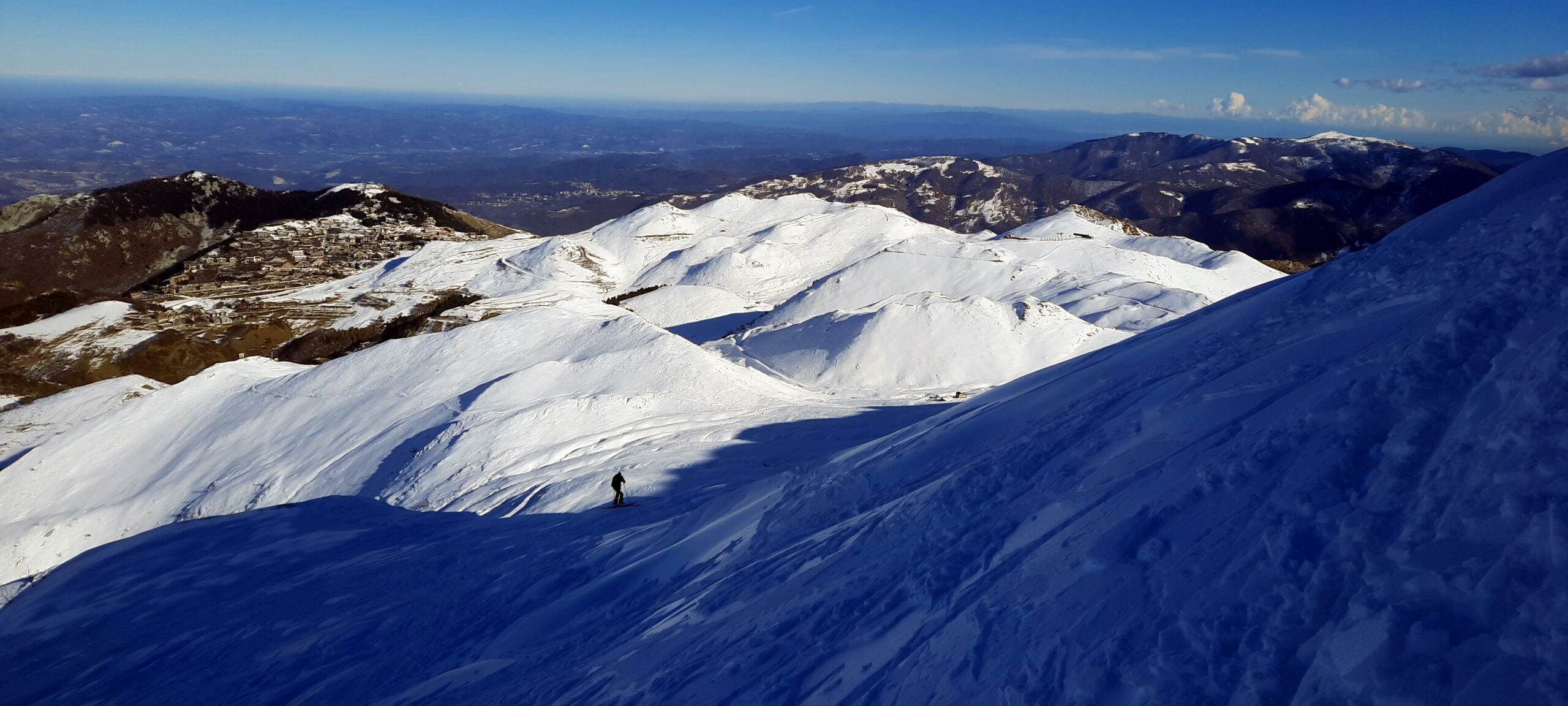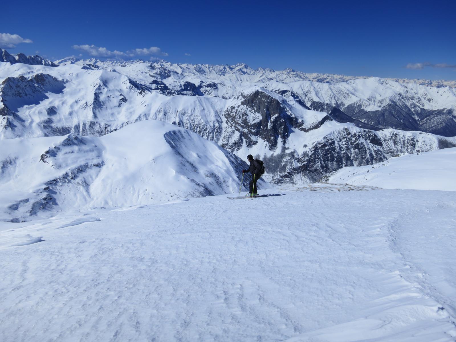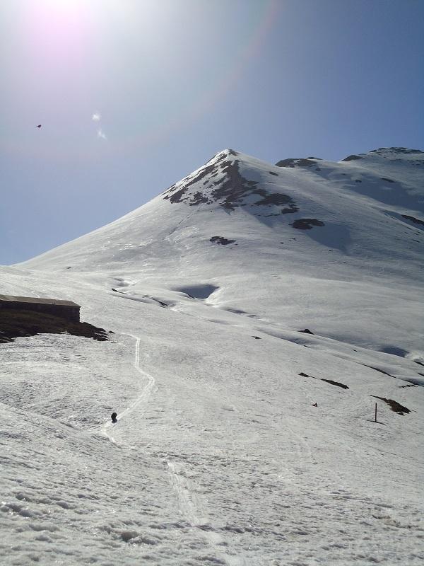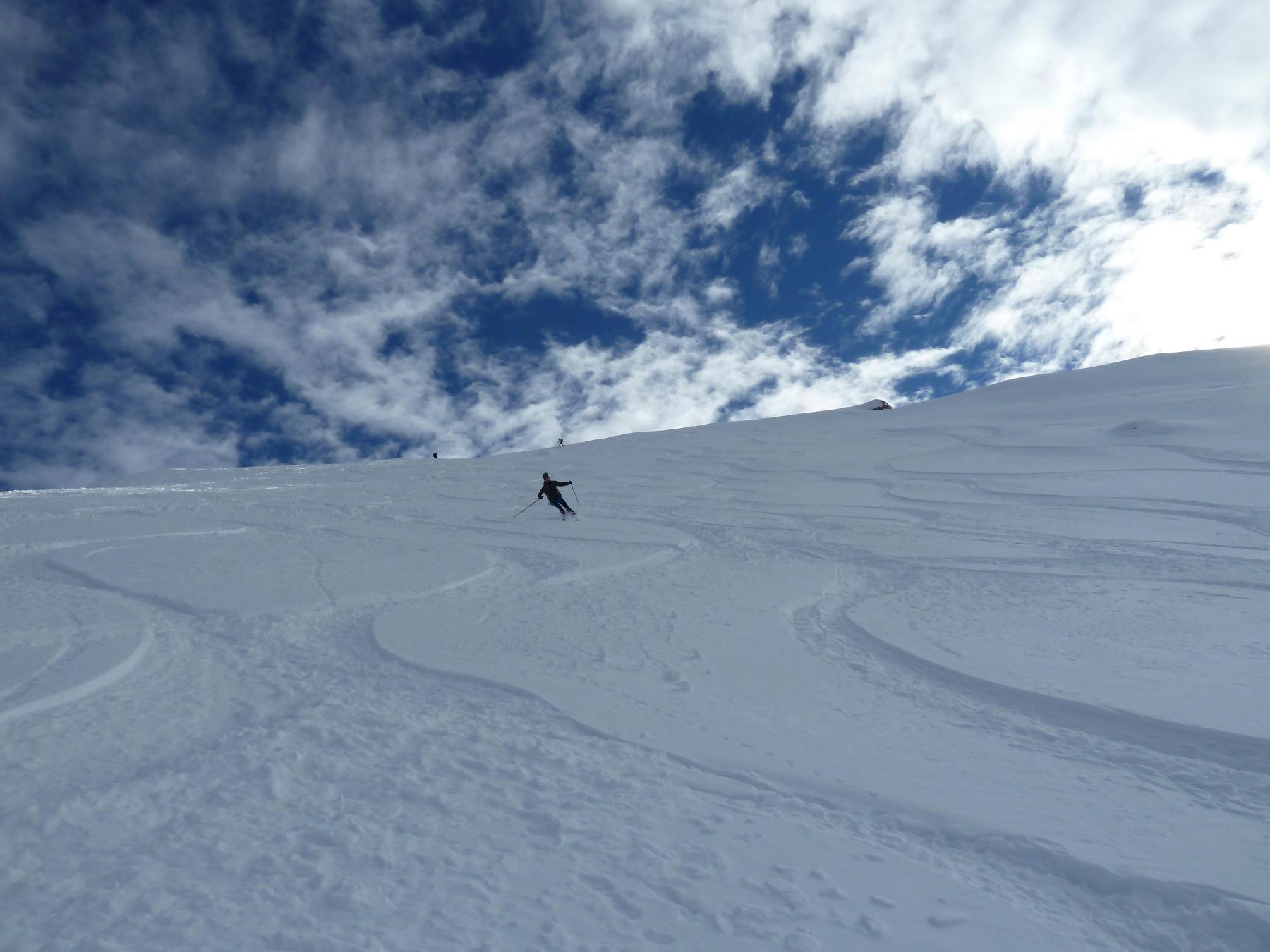 per la discesa ci sono molte varianti che vanno scelte in base all’assestamento del manto, il canalone e le varie dorsali alla sua destra o sinistra richiedono nevi ben assestate oppure si riscende dal versante di salita