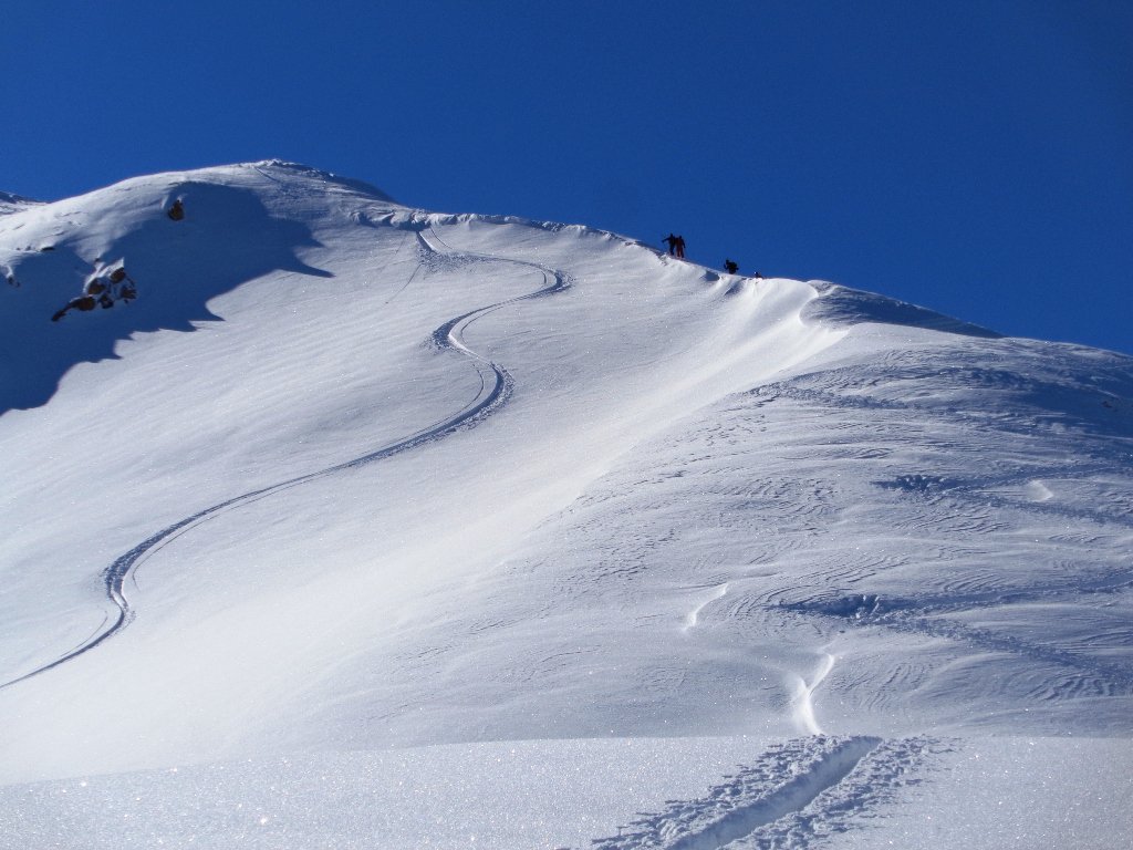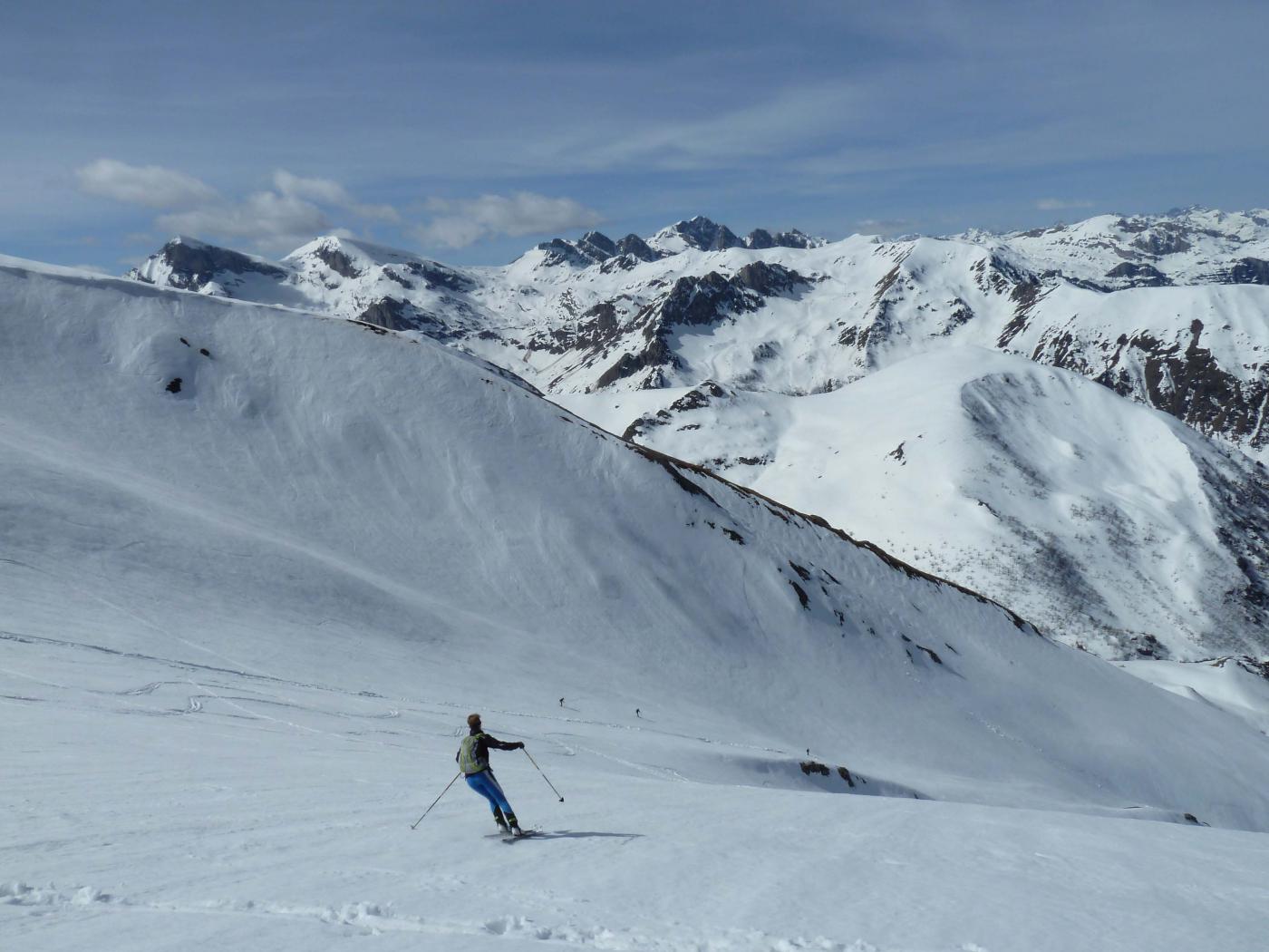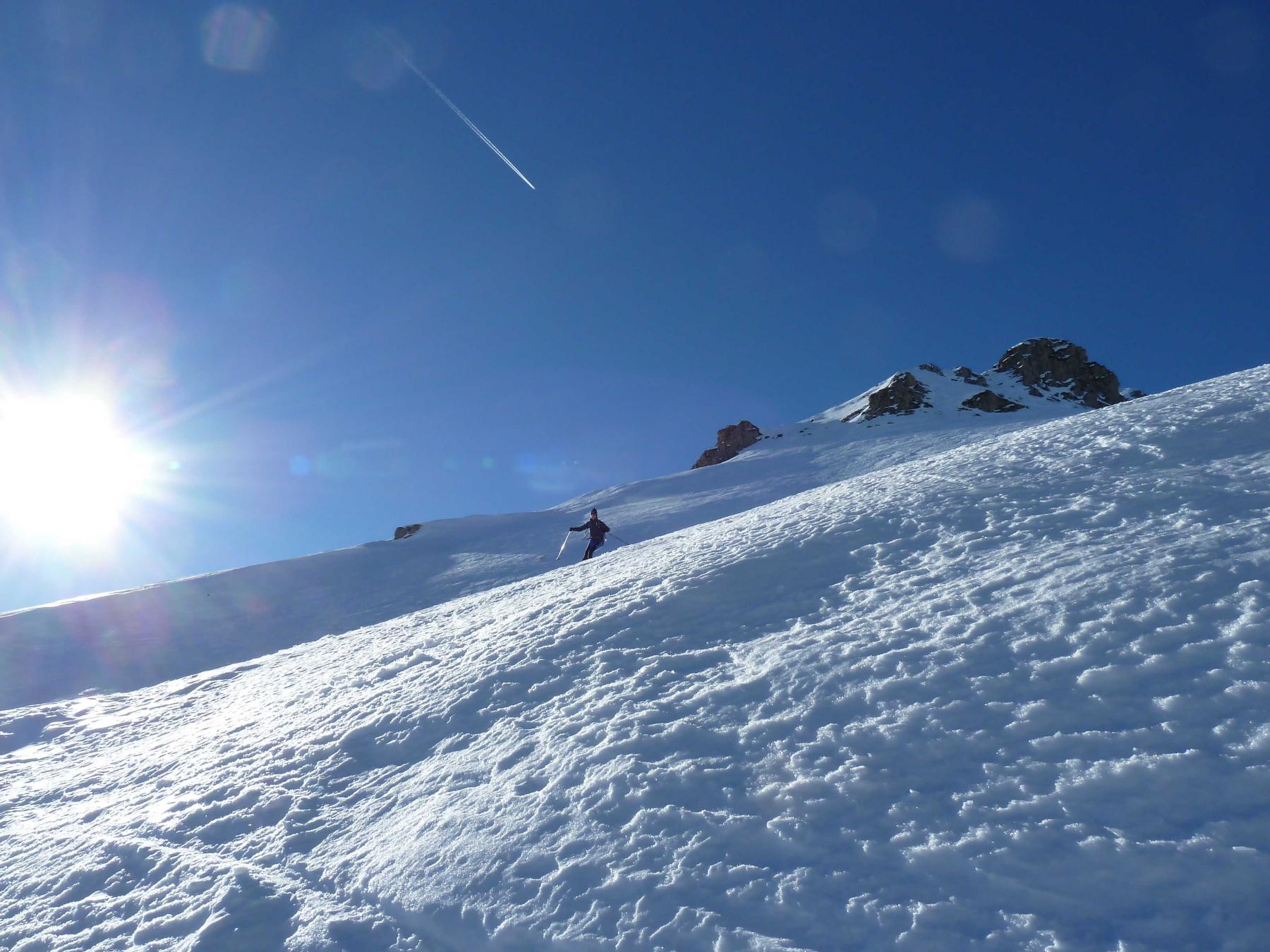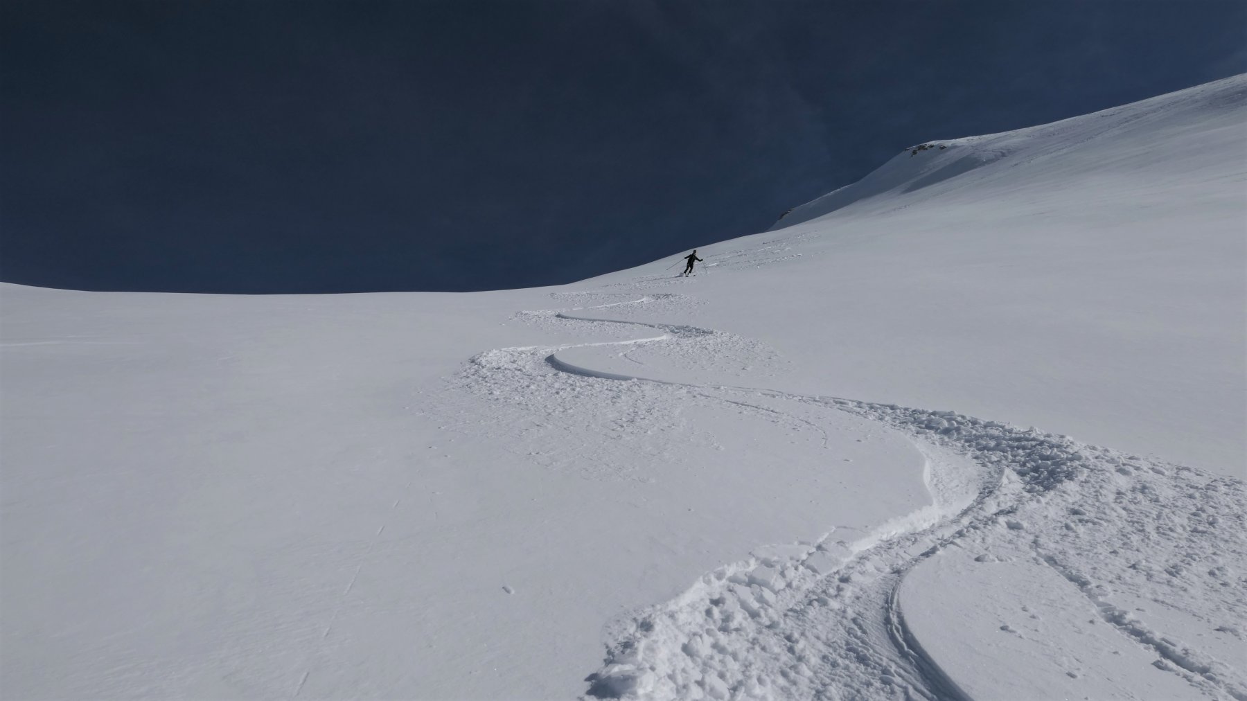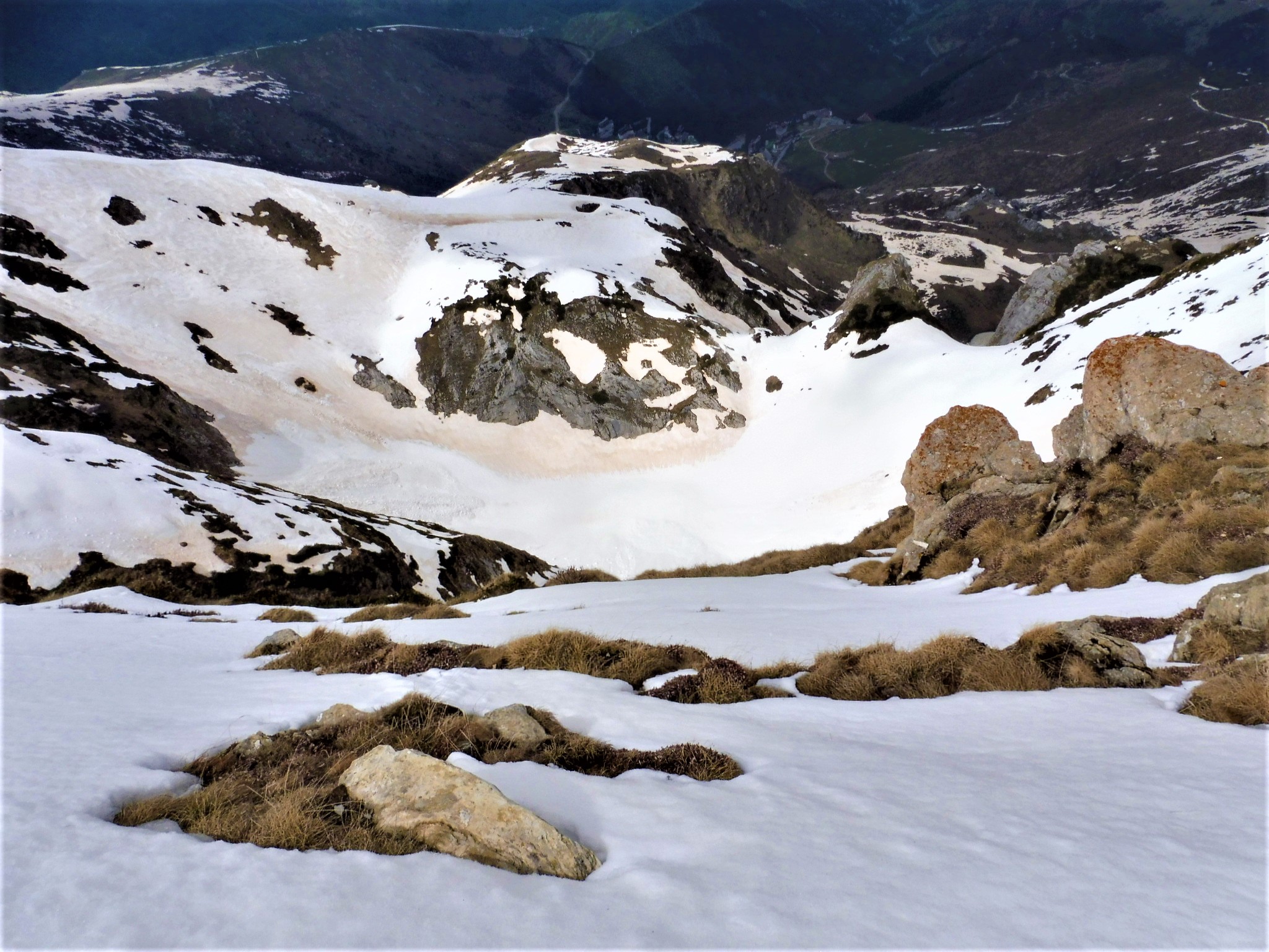 per la discesa ci sono molte varianti che vanno scelte in base all’assestamento del manto, il canalone e le varie dorsali alla sua destra o sinistra richiedono nevi ben assestate oppure si riscende dal versante di salita