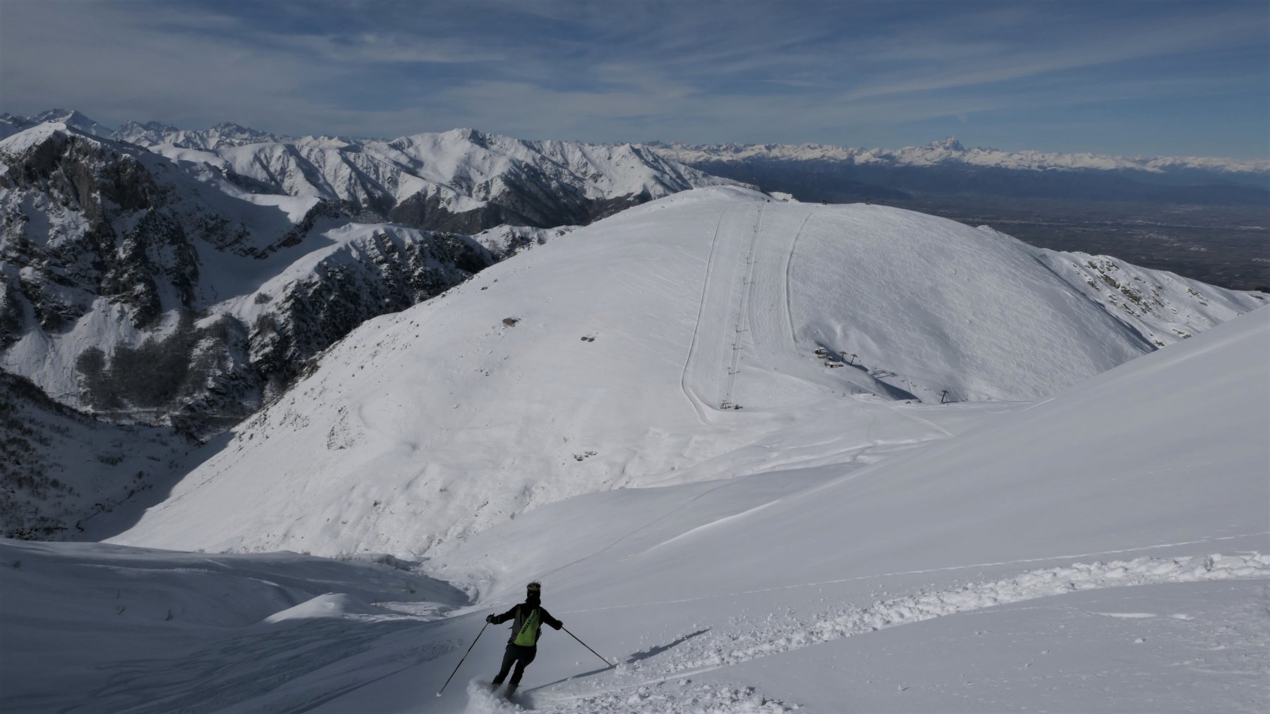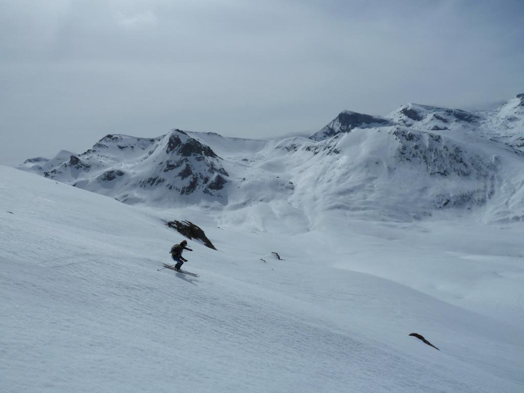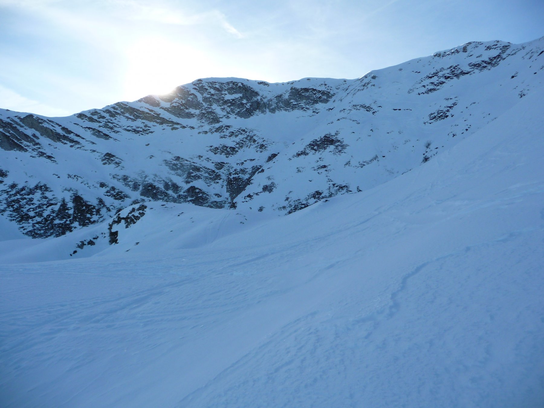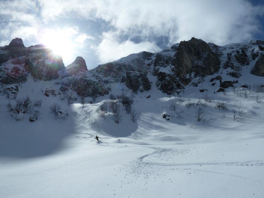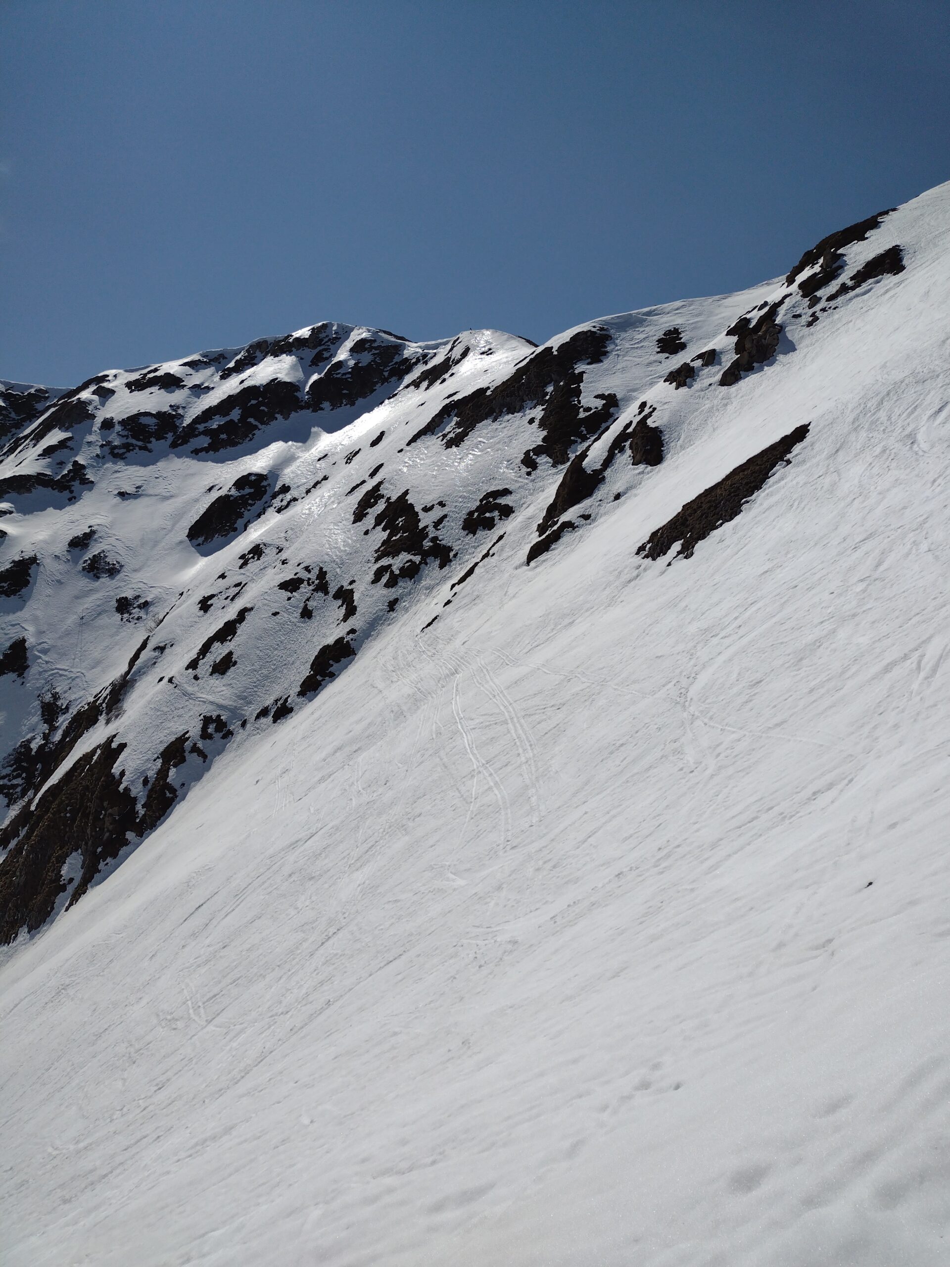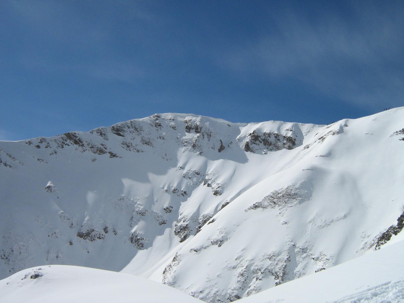per la discesa ci sono molte varianti che vanno scelte in base all’assestamento del manto, il canalone e le varie dorsali alla sua destra o sinistra richiedono nevi ben assestate oppure si riscende dal versante di salita