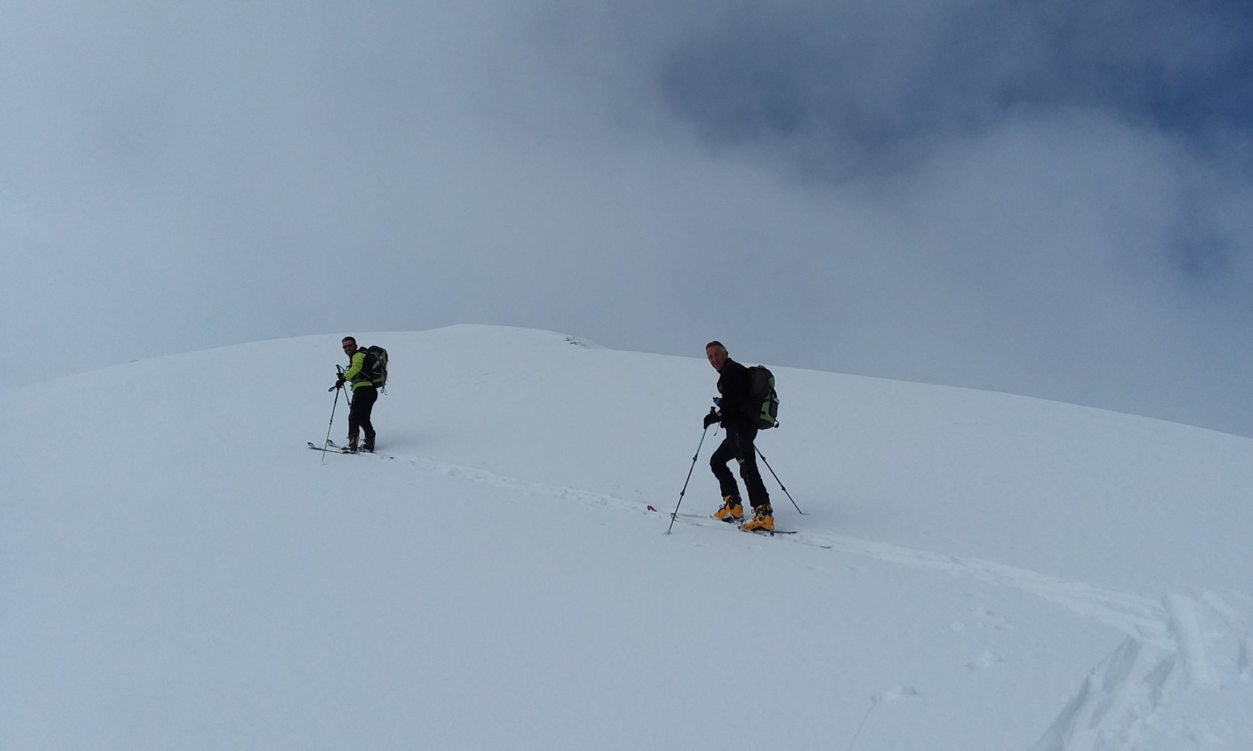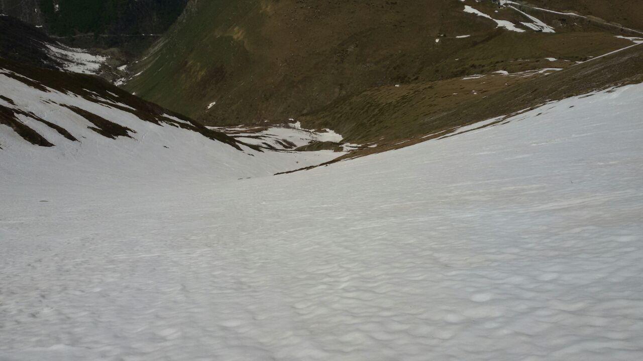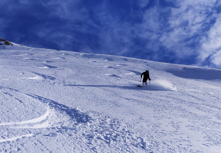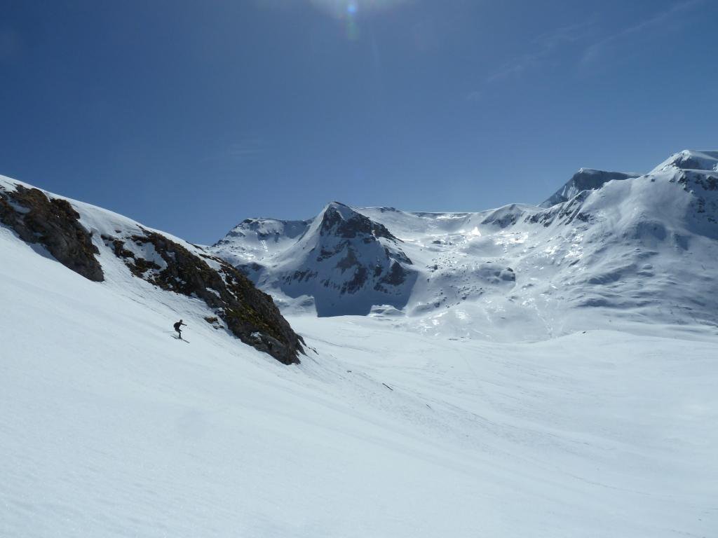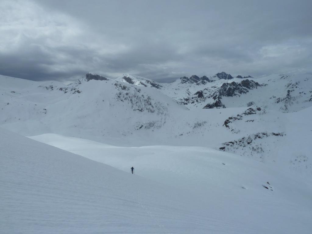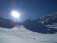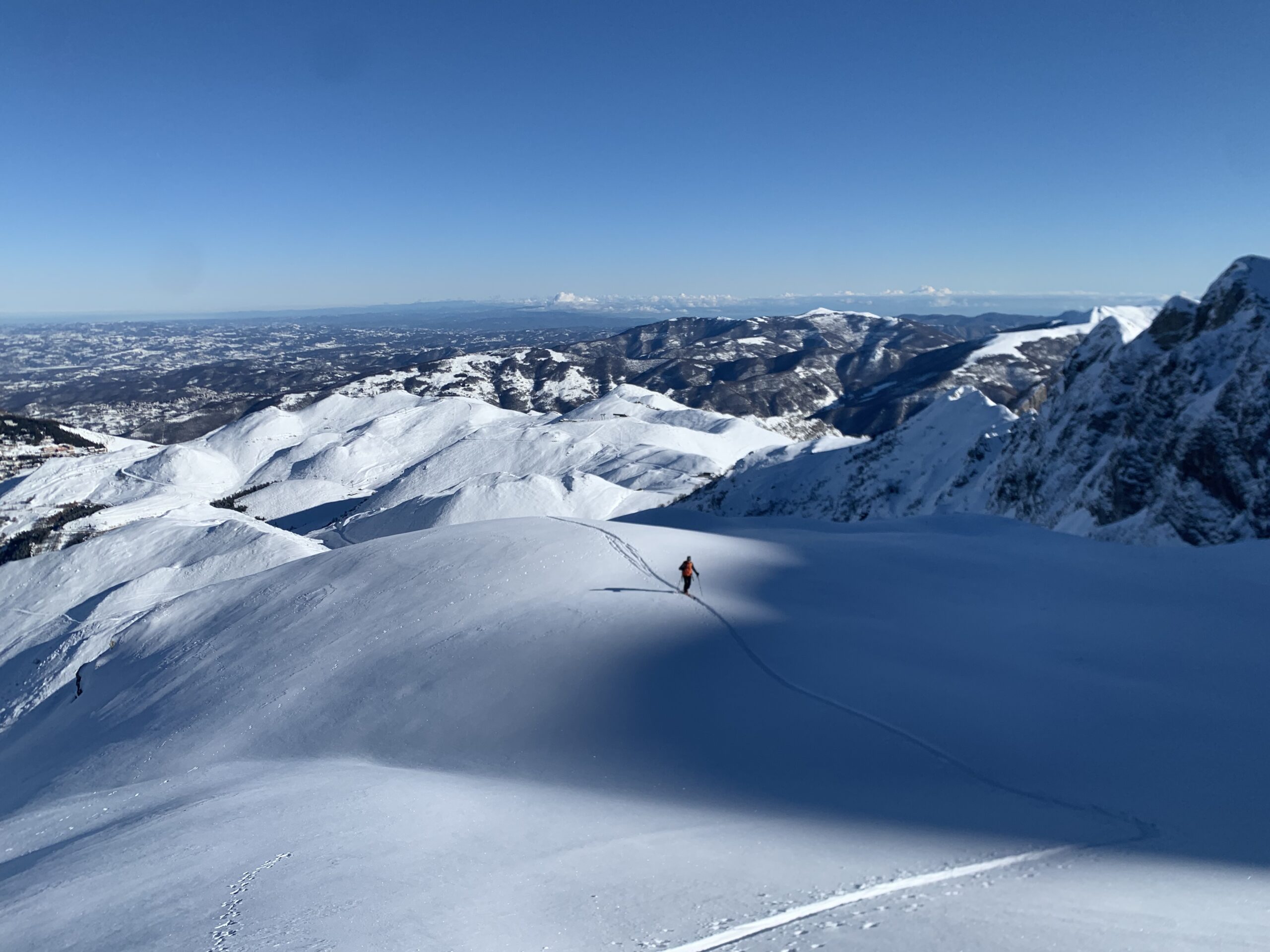 per la discesa ci sono molte varianti che vanno scelte in base all’assestamento del manto, il canalone e le varie dorsali alla sua destra o sinistra richiedono nevi ben assestate oppure si riscende dal versante di salita