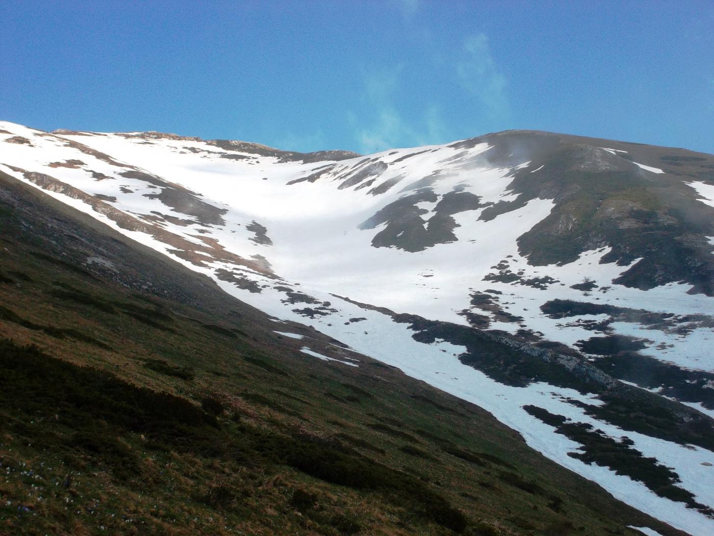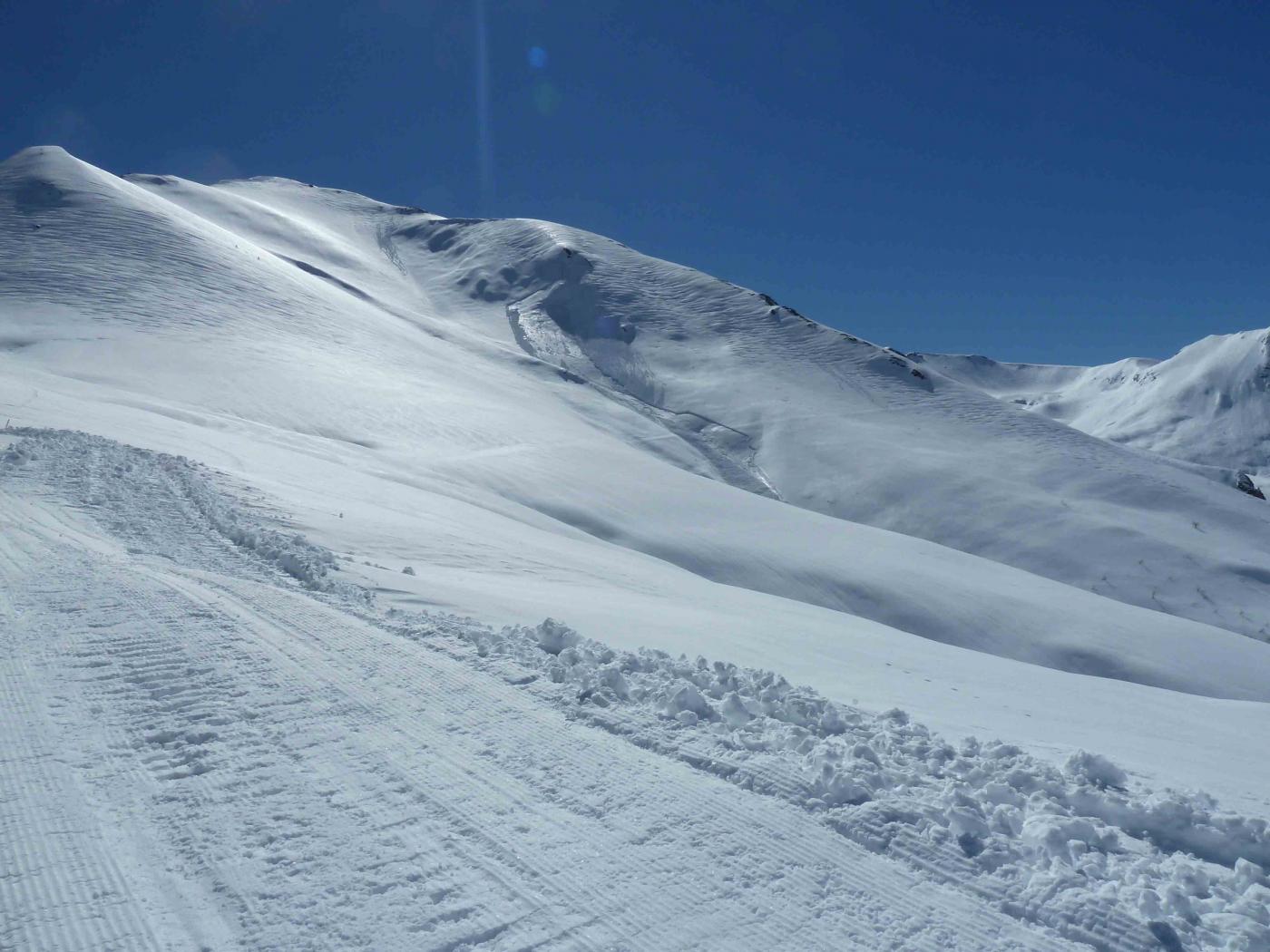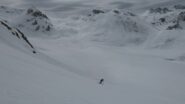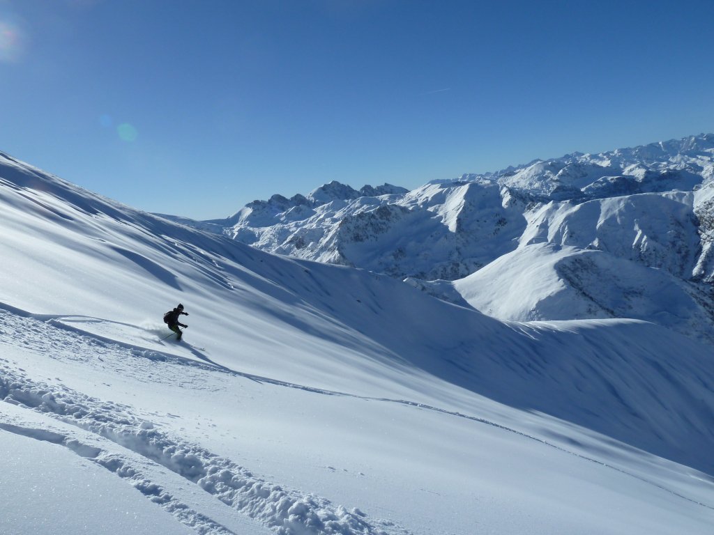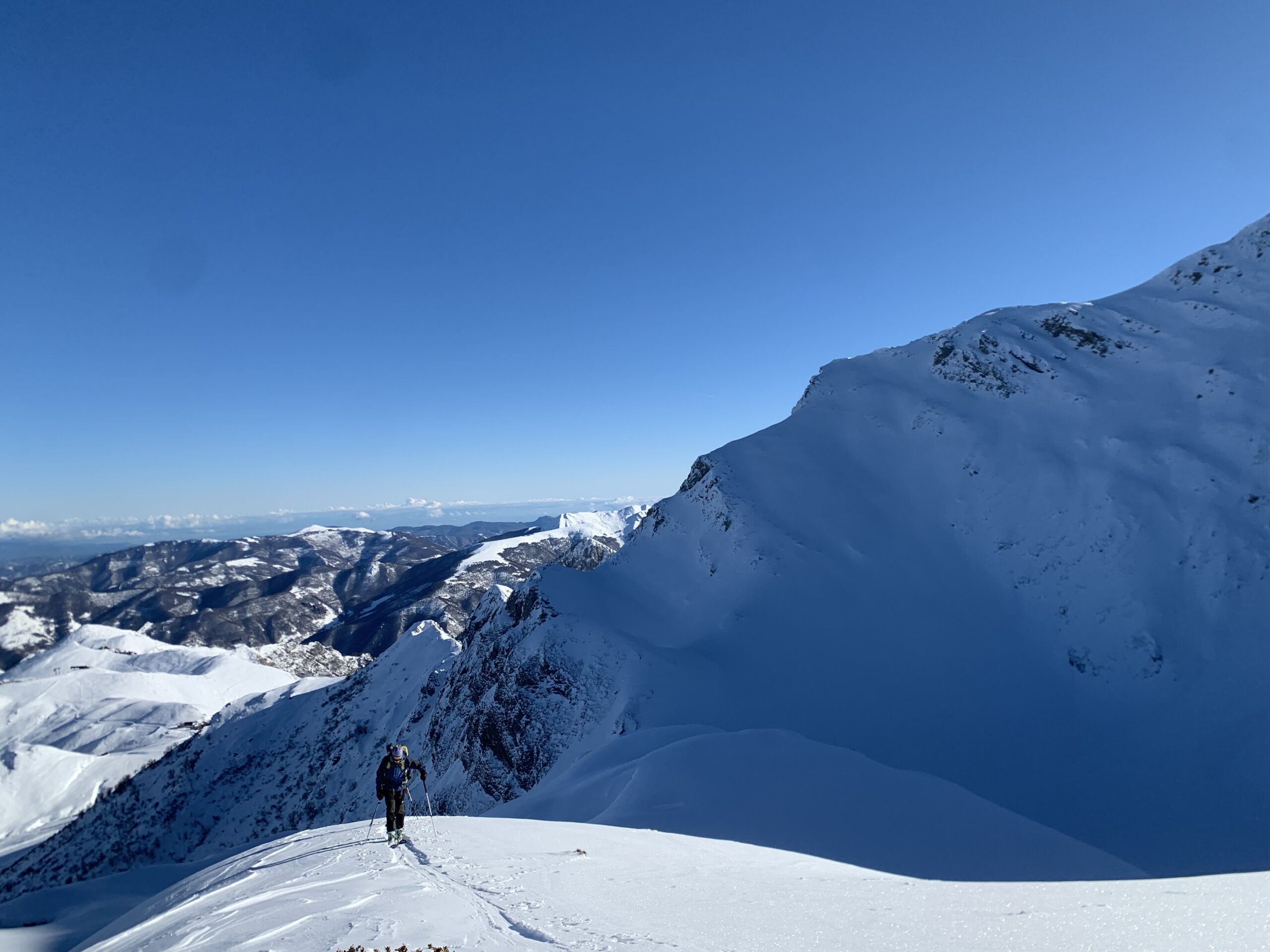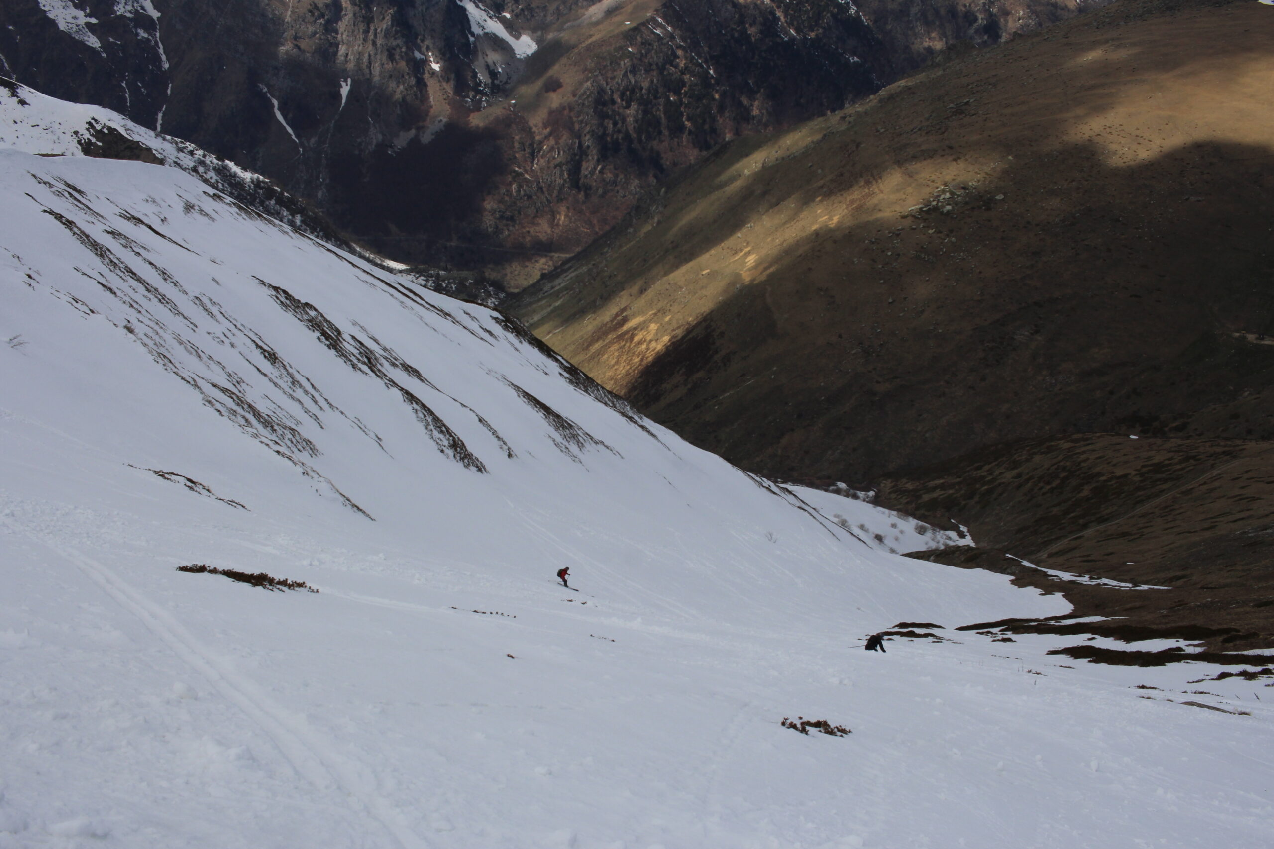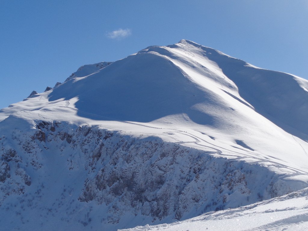 per la discesa ci sono molte varianti che vanno scelte in base all’assestamento del manto, il canalone e le varie dorsali alla sua destra o sinistra richiedono nevi ben assestate oppure si riscende dal versante di salita
