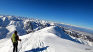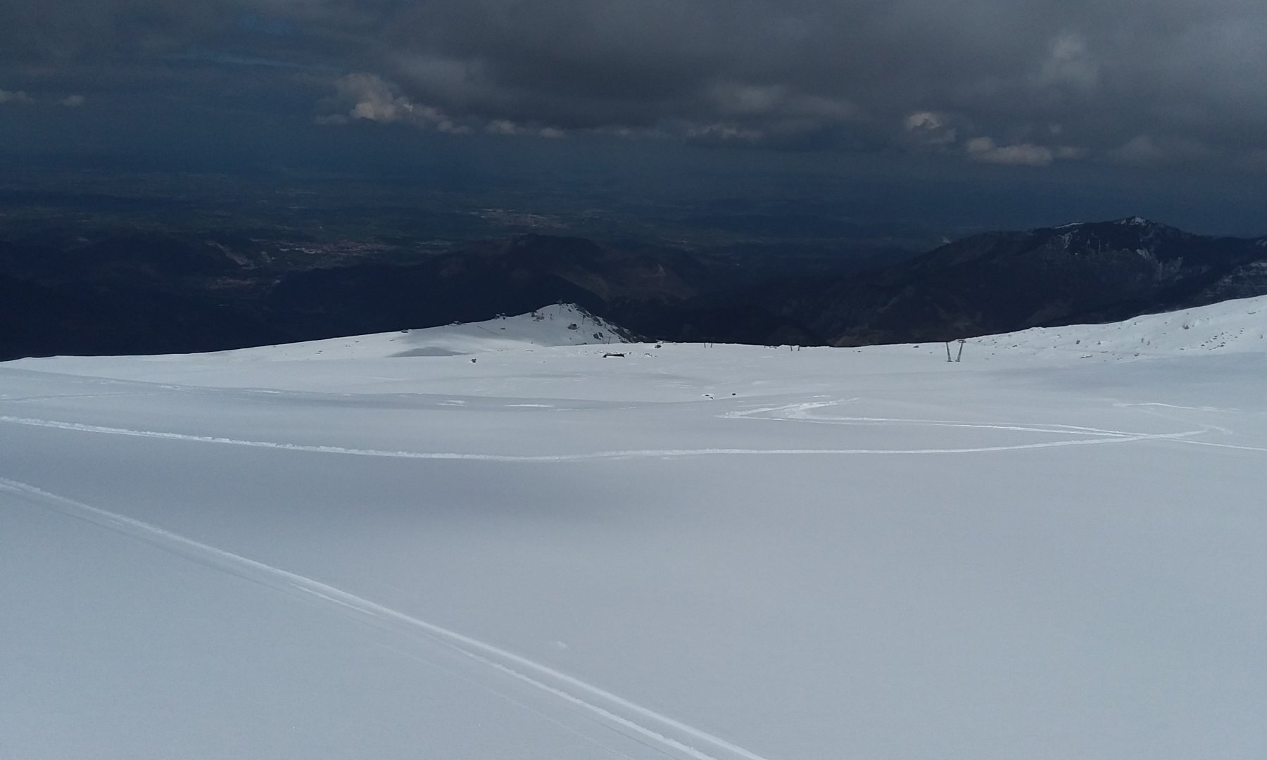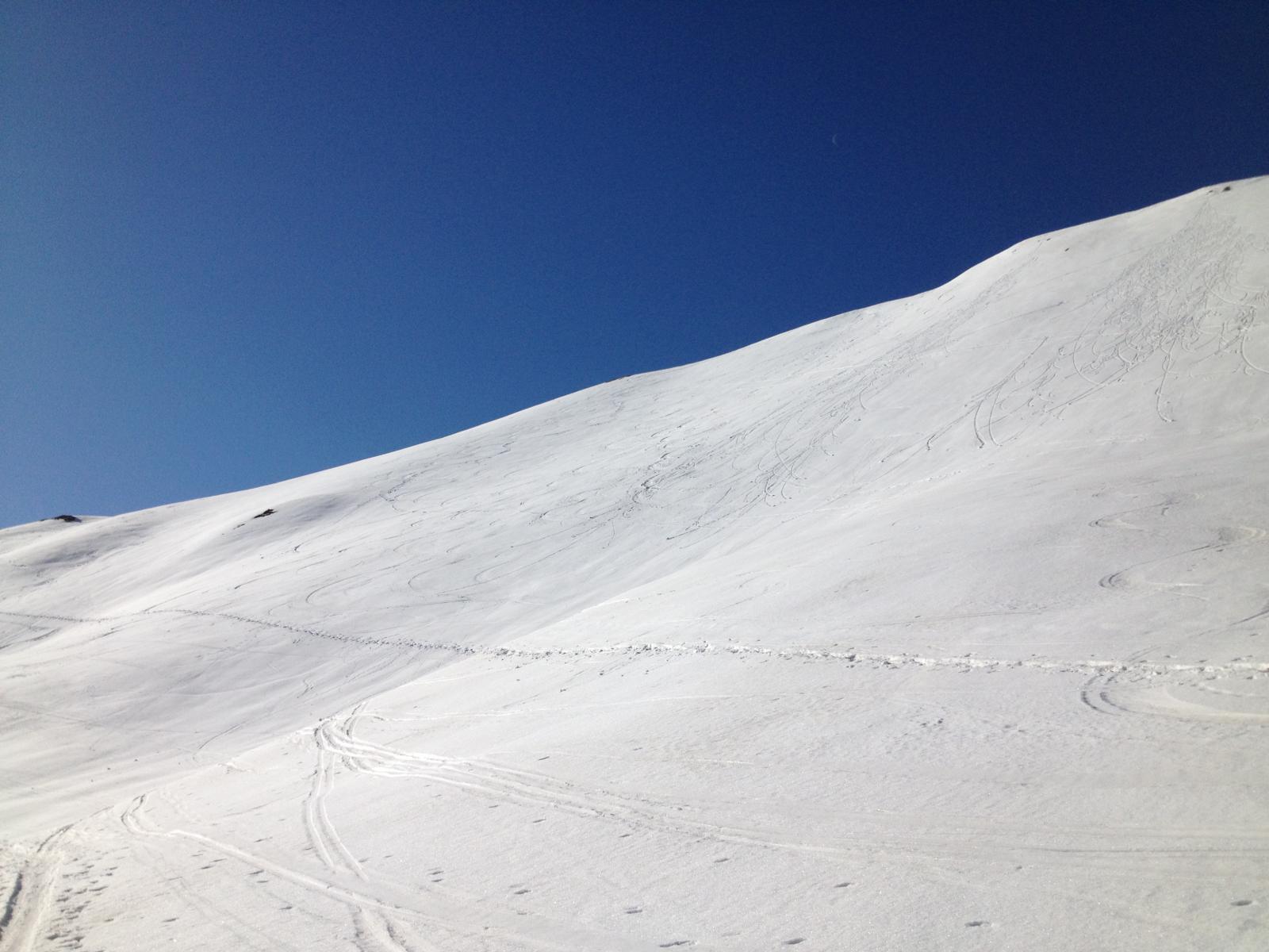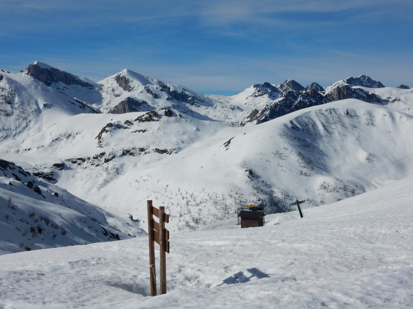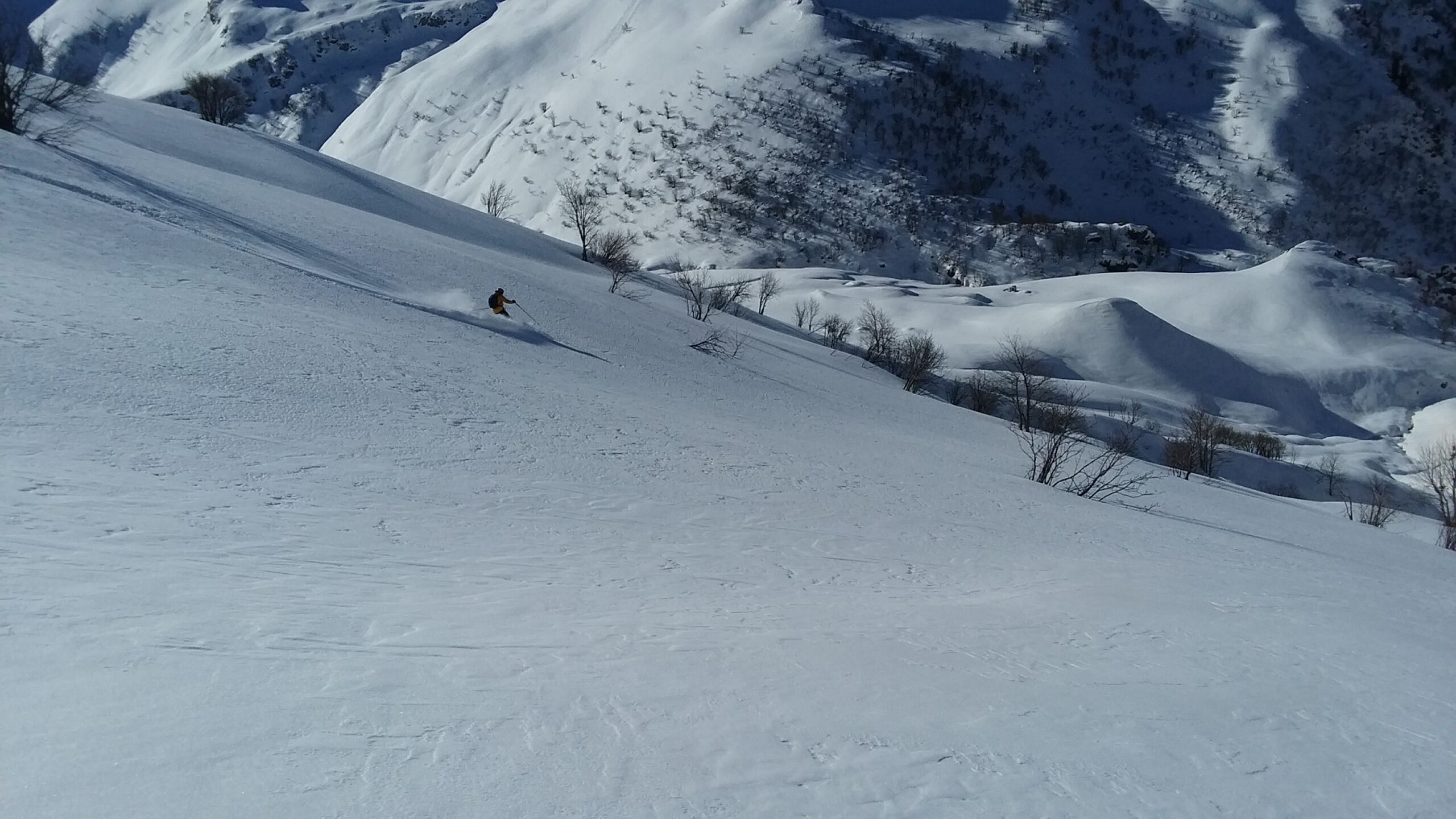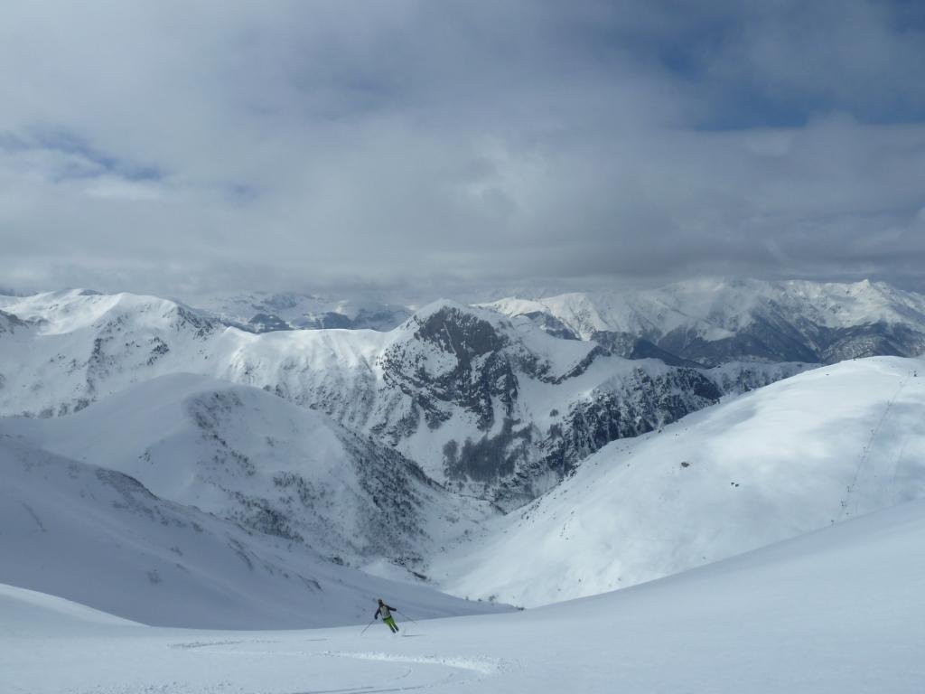 per la discesa ci sono molte varianti che vanno scelte in base all’assestamento del manto, il canalone e le varie dorsali alla sua destra o sinistra richiedono nevi ben assestate oppure si riscende dal versante di salita