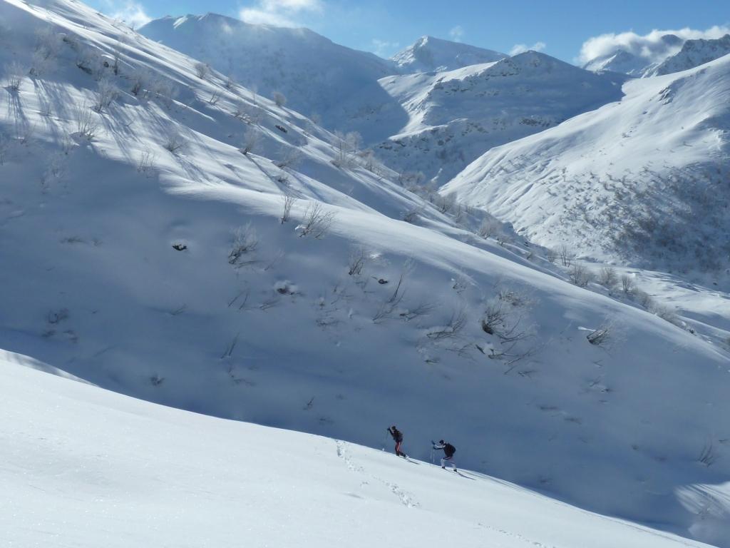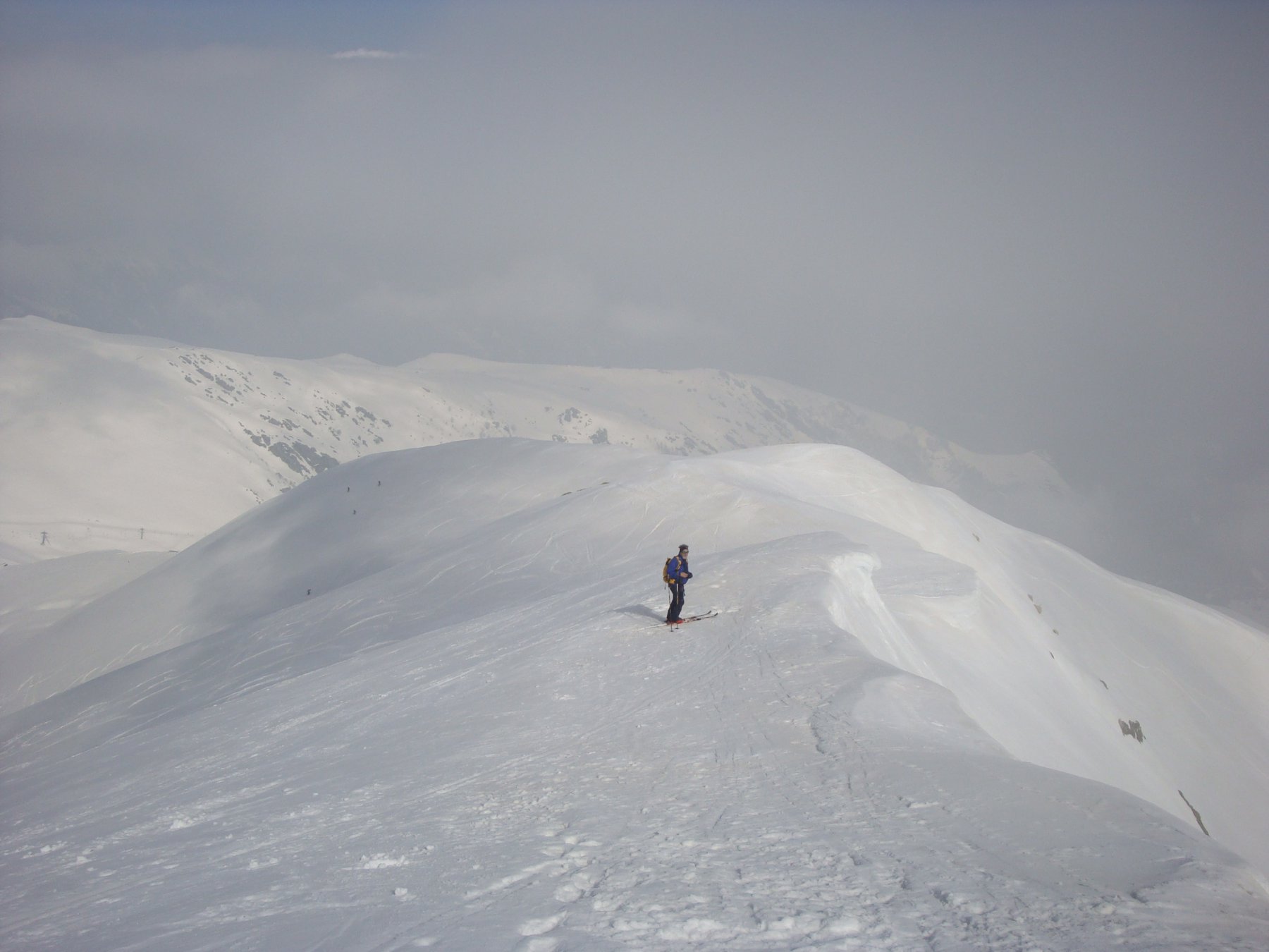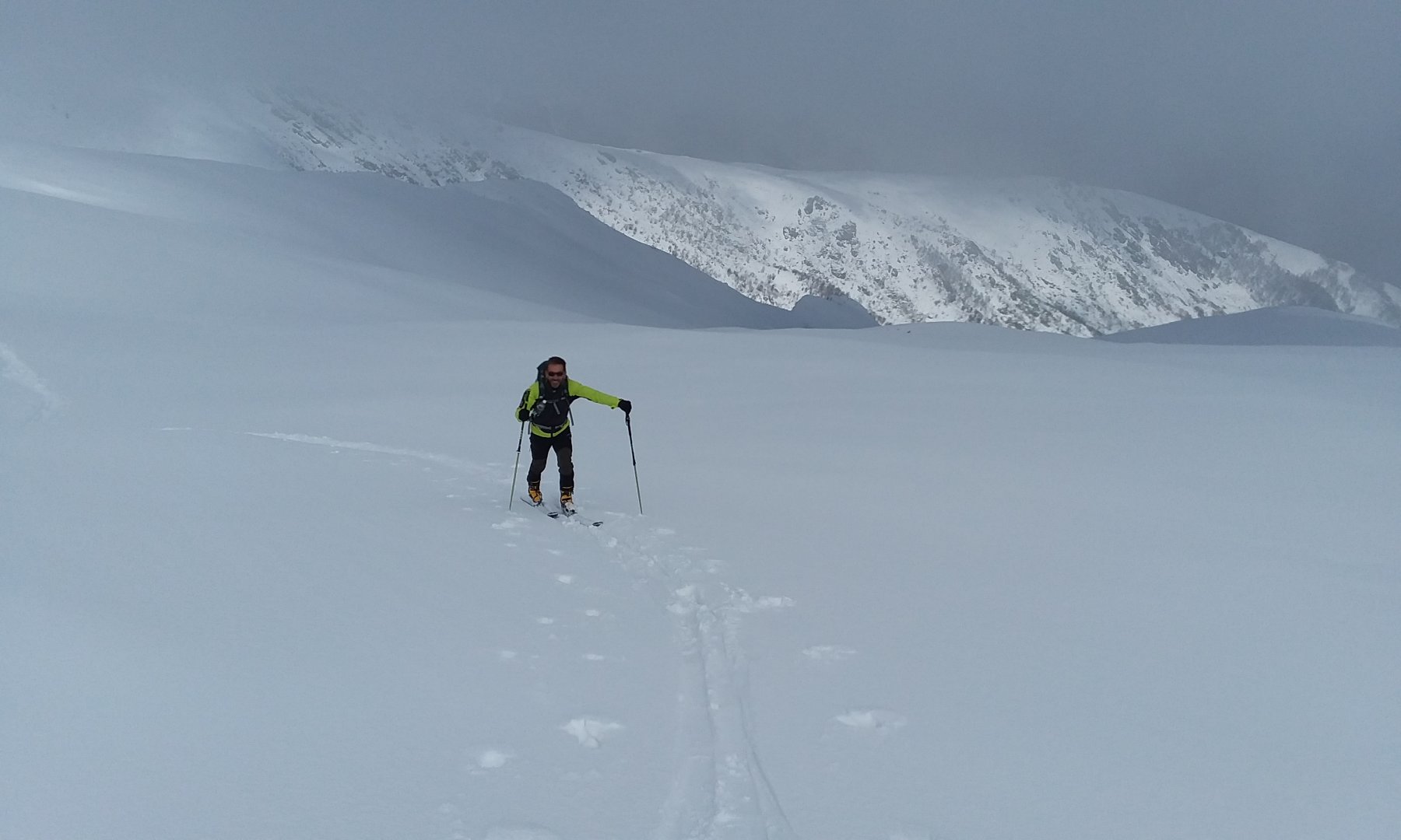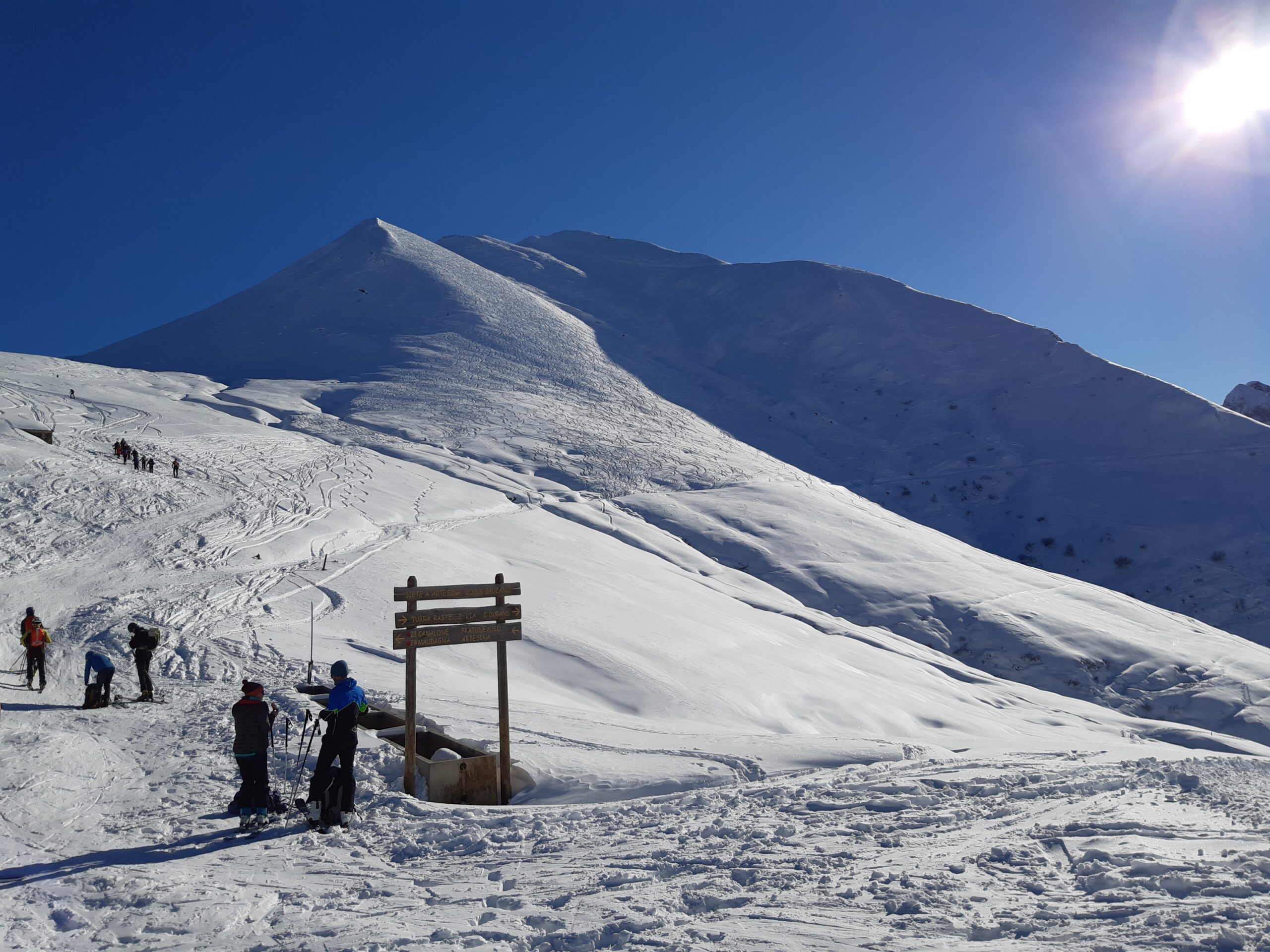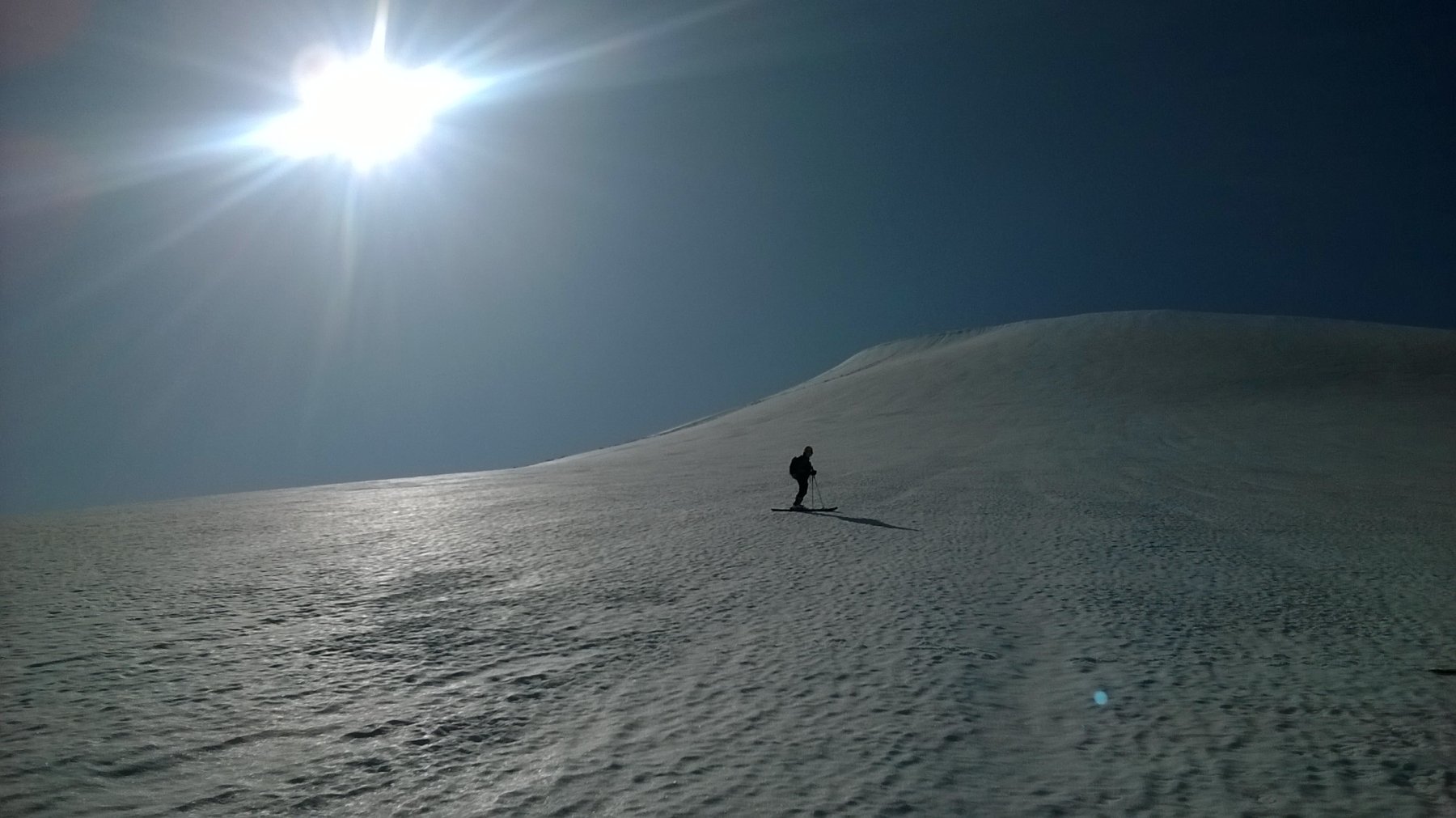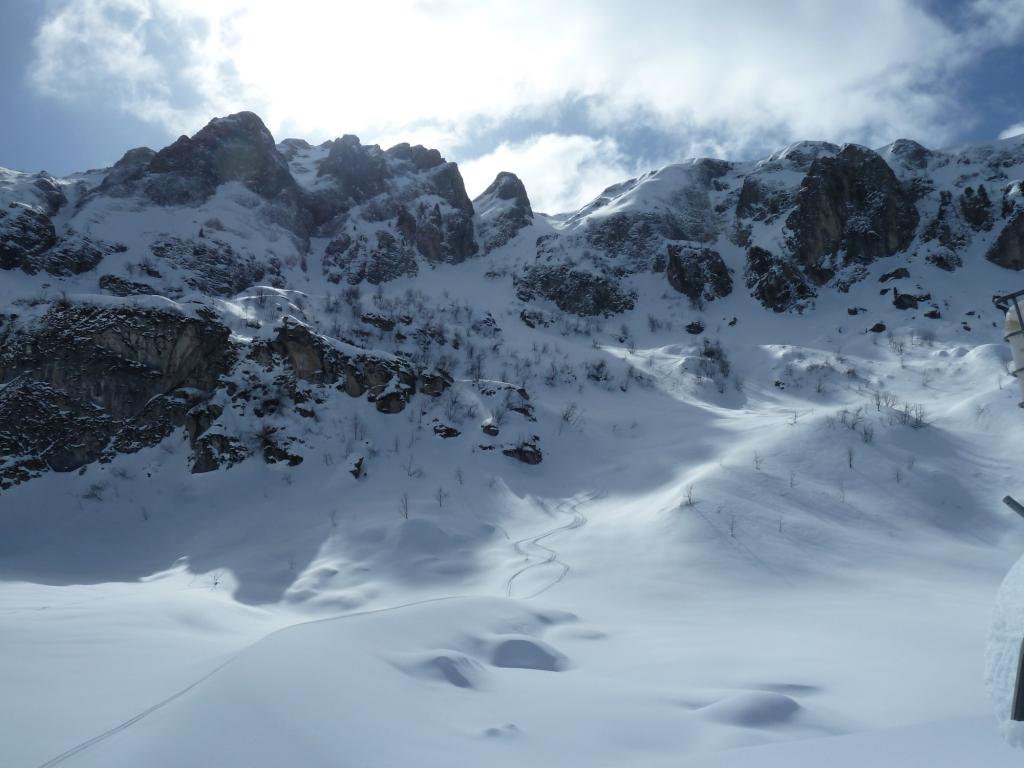 per la discesa ci sono molte varianti che vanno scelte in base all’assestamento del manto, il canalone e le varie dorsali alla sua destra o sinistra richiedono nevi ben assestate oppure si riscende dal versante di salita