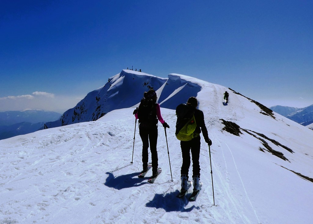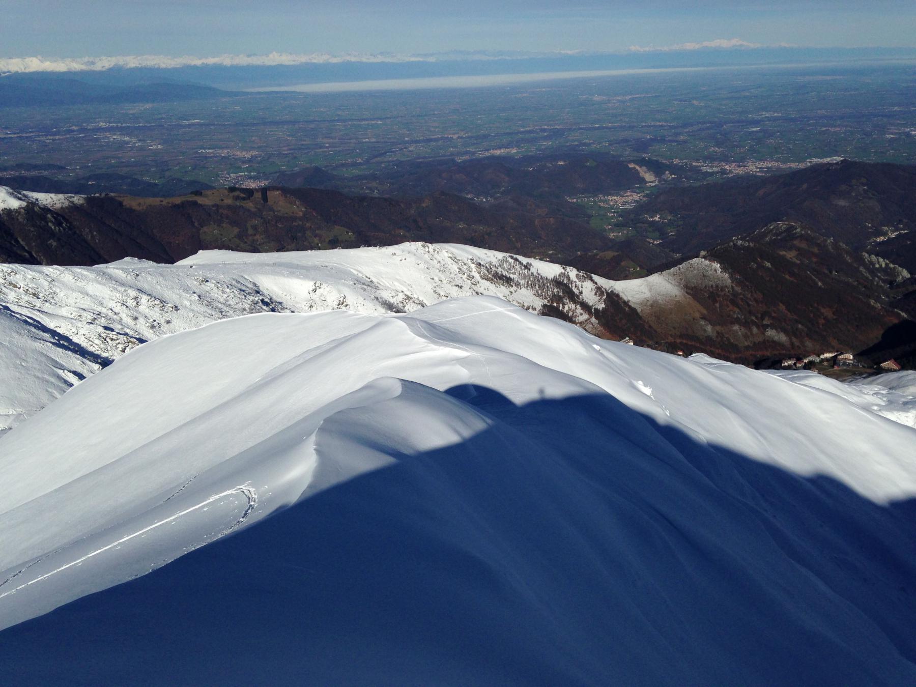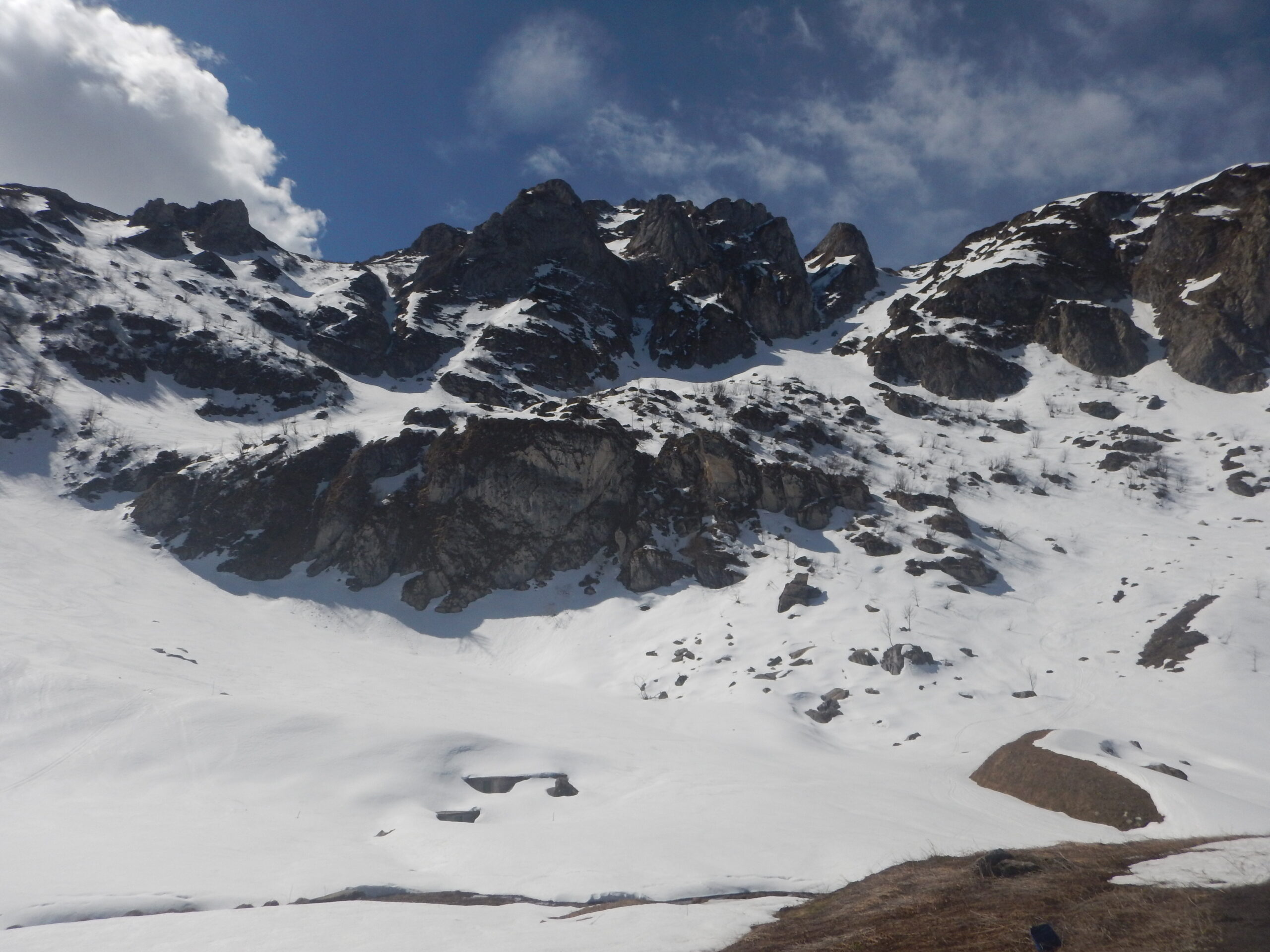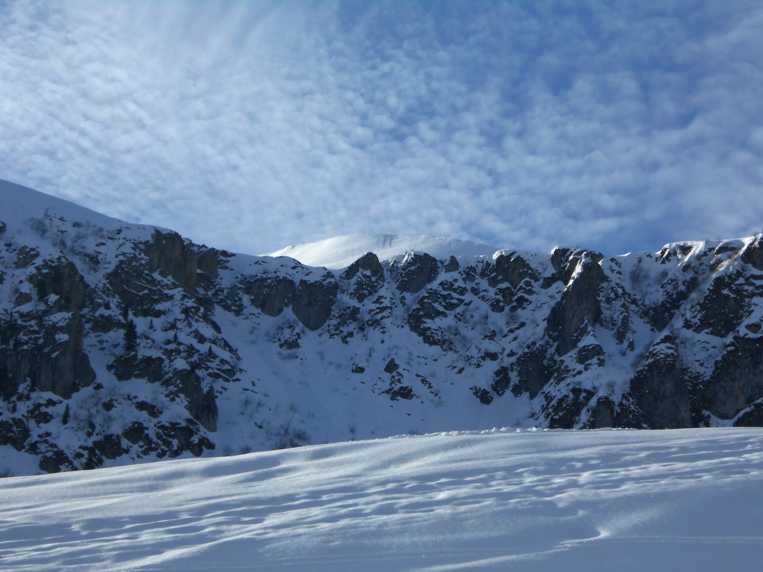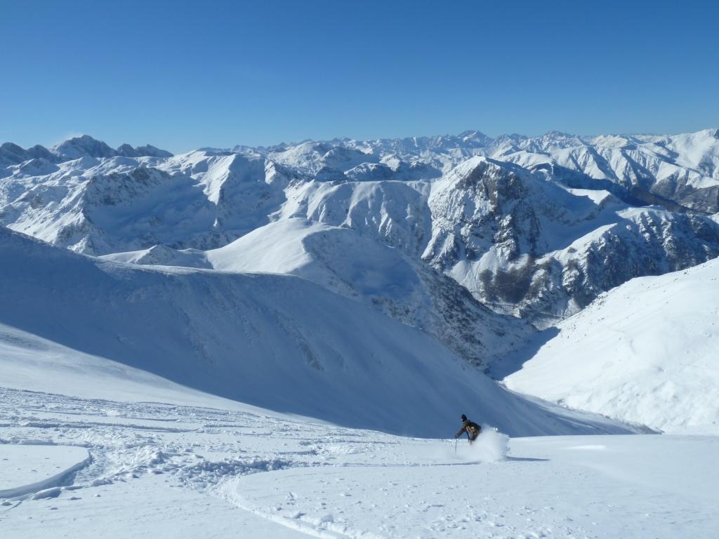 per la discesa ci sono molte varianti che vanno scelte in base all’assestamento del manto, il canalone e le varie dorsali alla sua destra o sinistra richiedono nevi ben assestate oppure si riscende dal versante di salita
