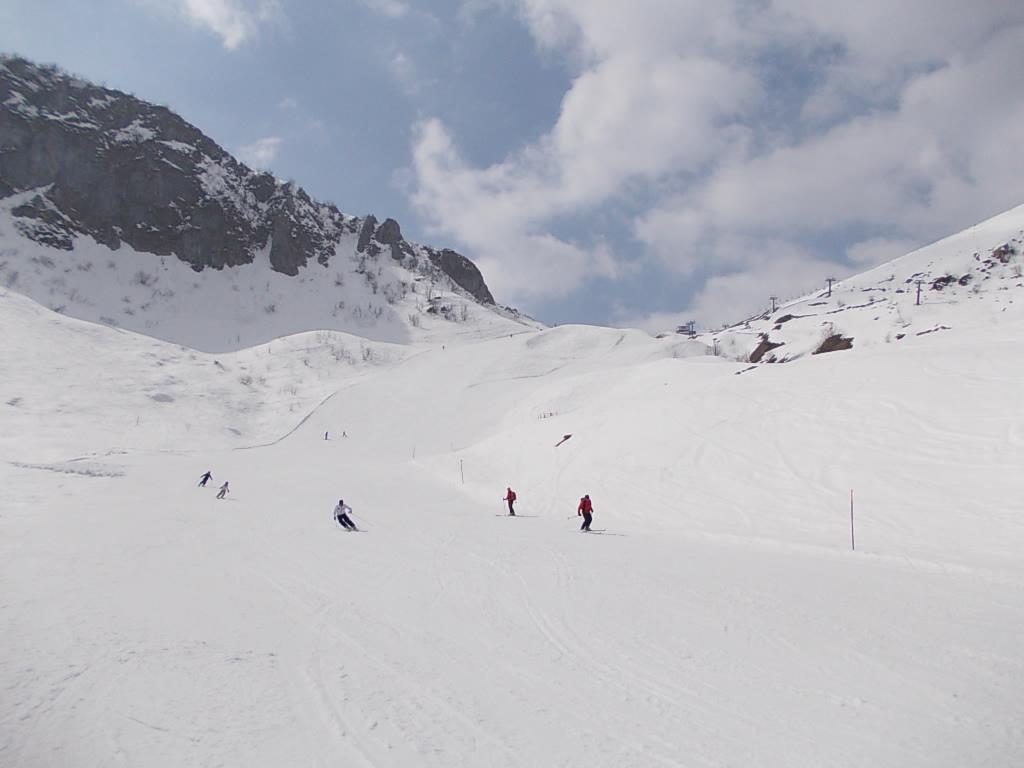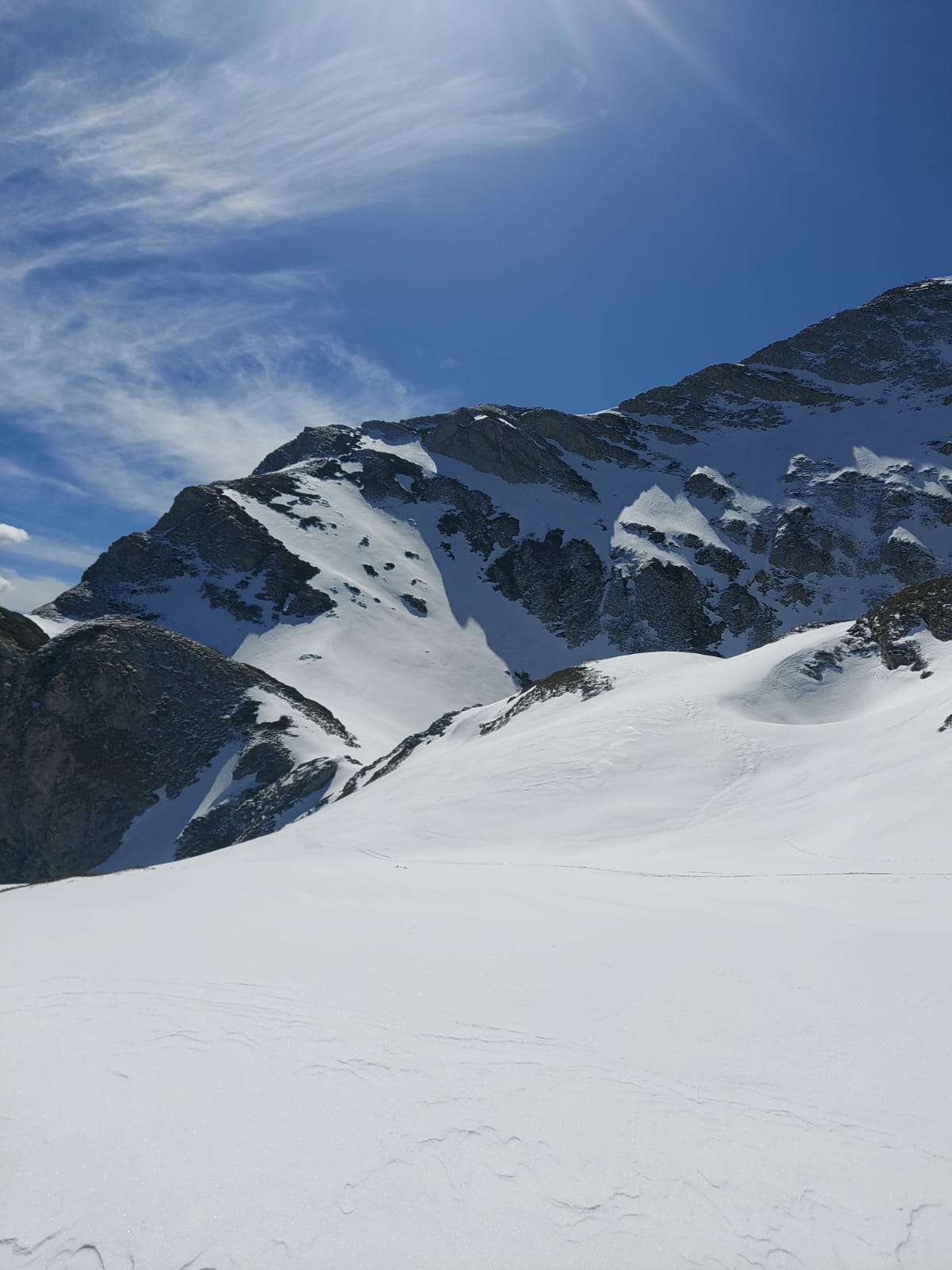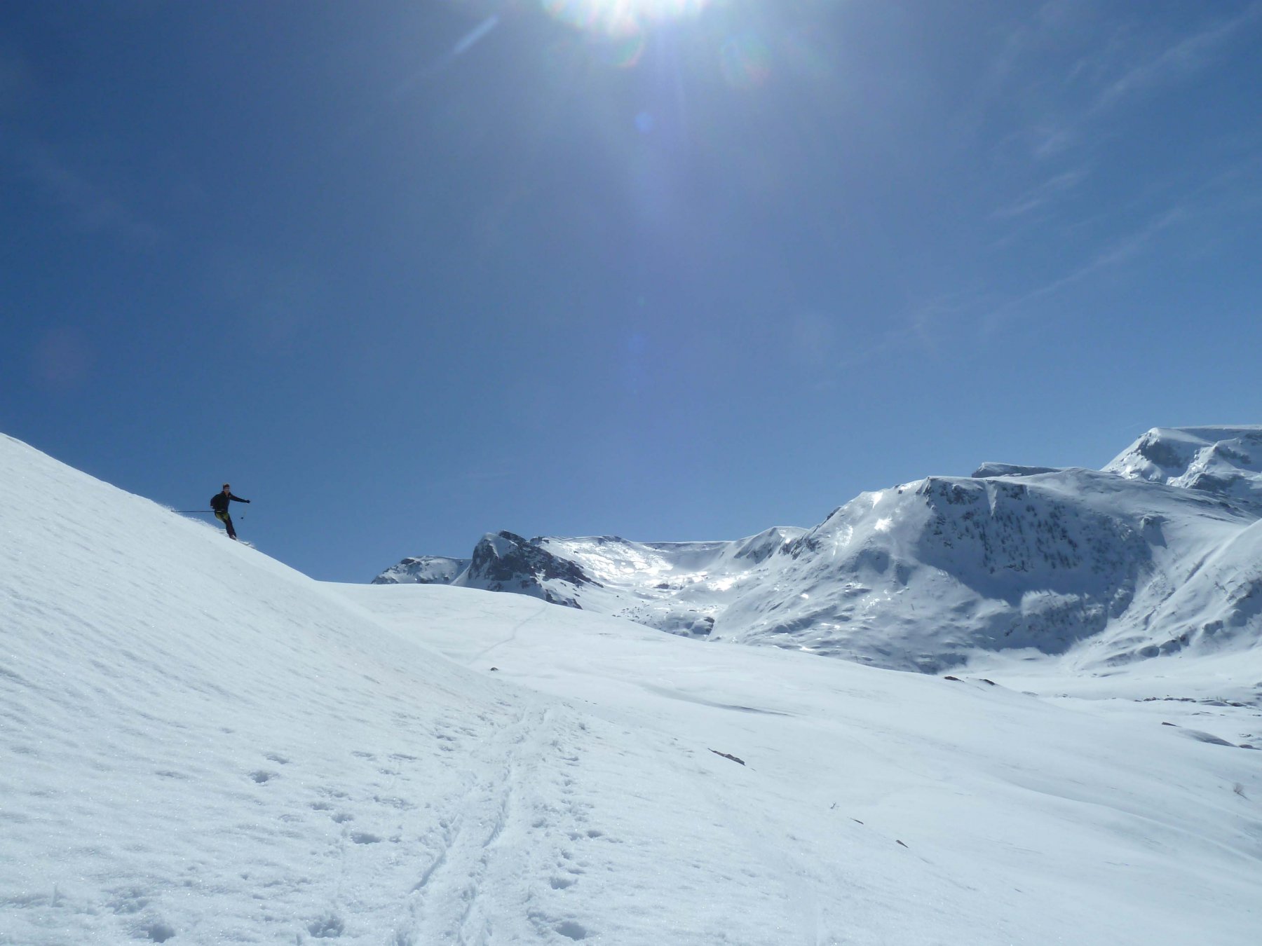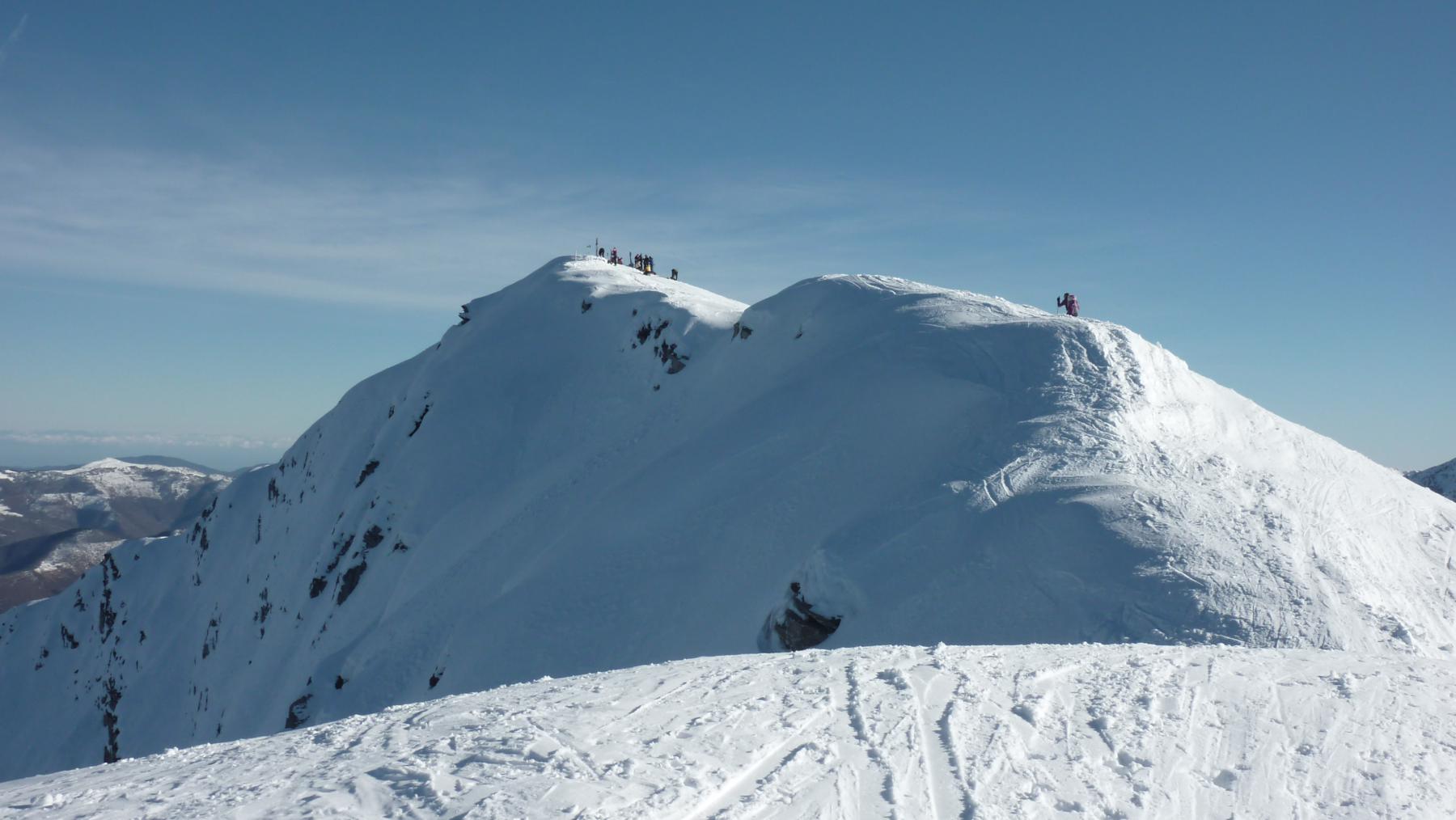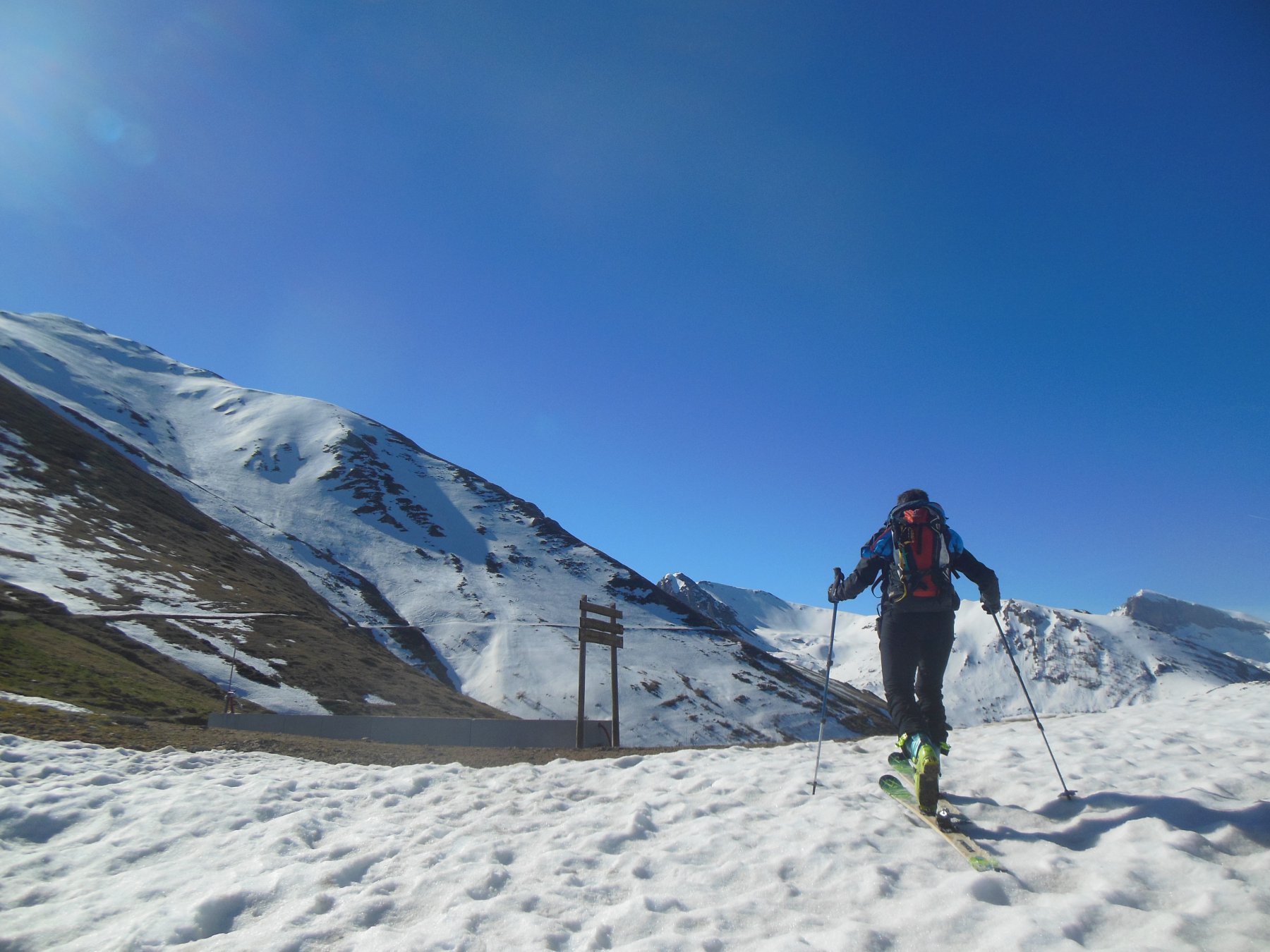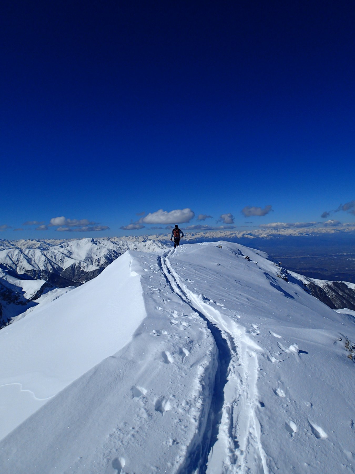 per la discesa ci sono molte varianti che vanno scelte in base all’assestamento del manto, il canalone e le varie dorsali alla sua destra o sinistra richiedono nevi ben assestate oppure si riscende dal versante di salita