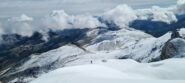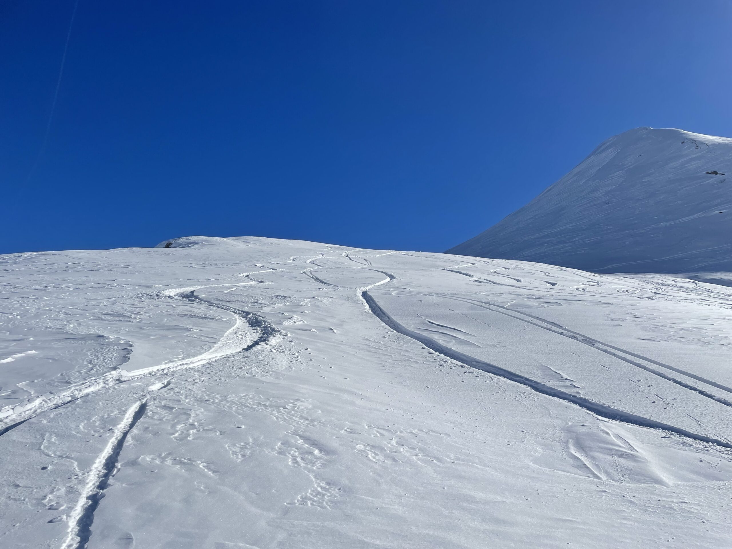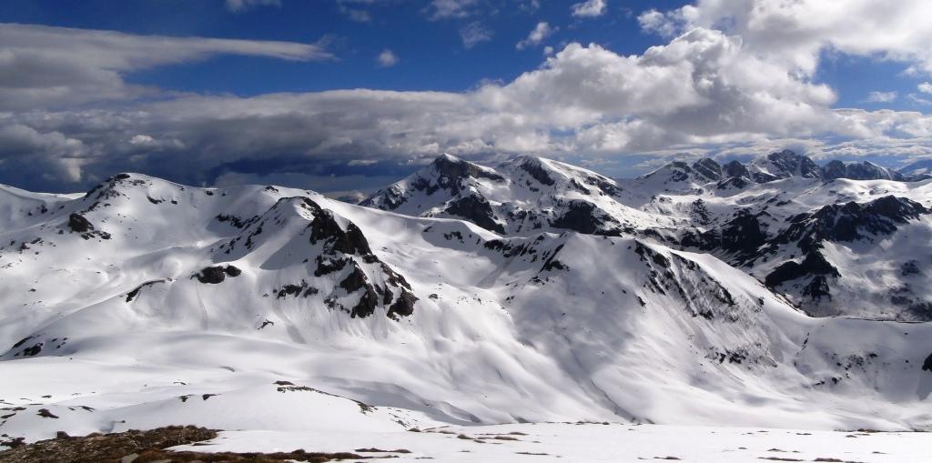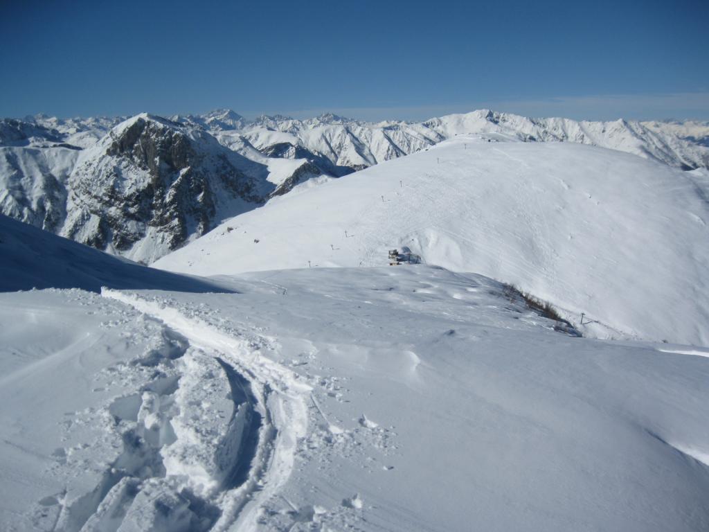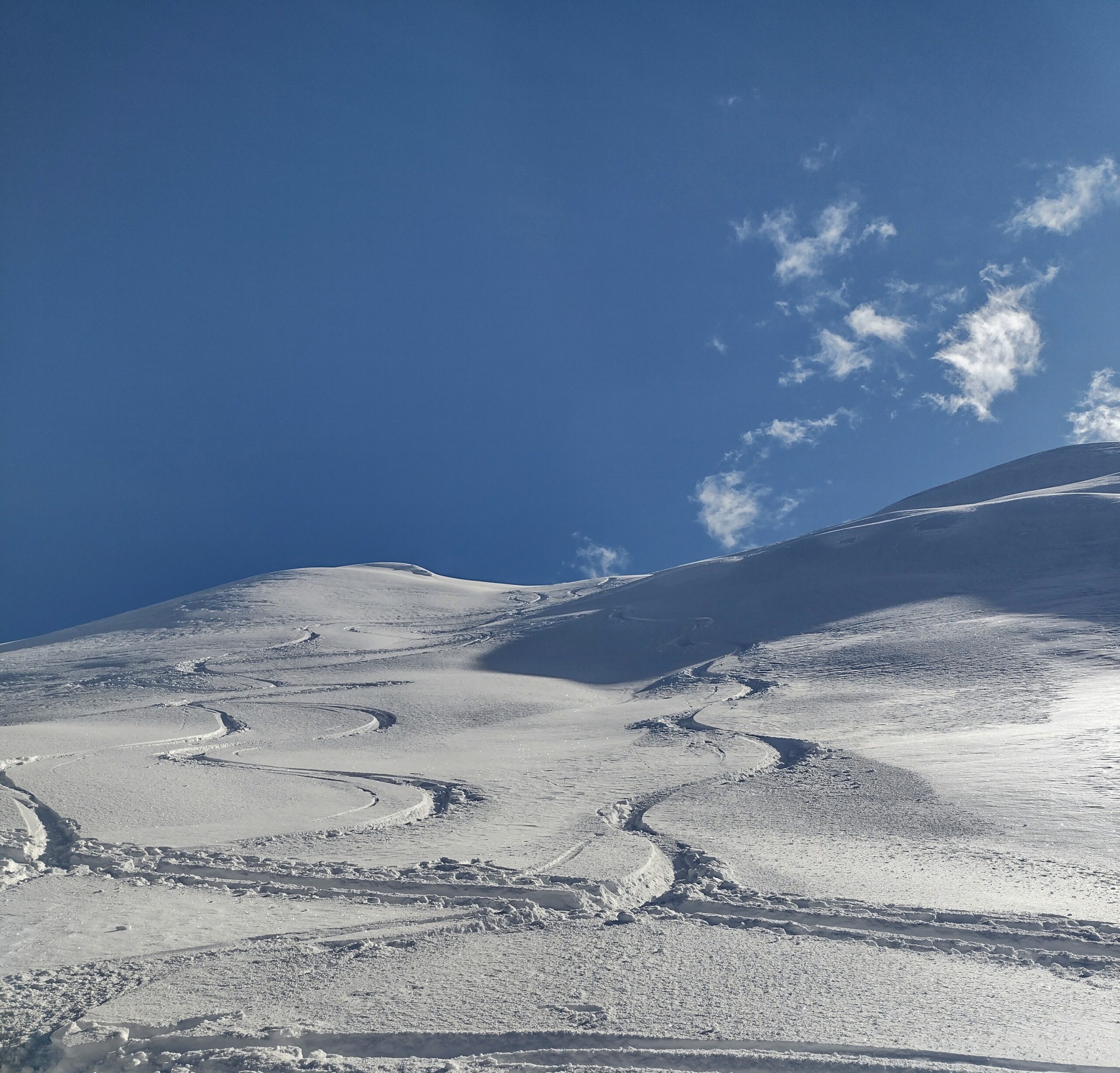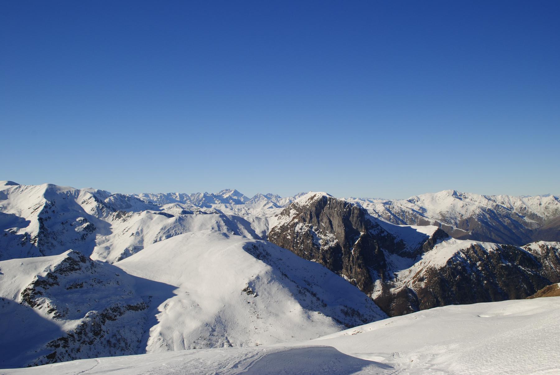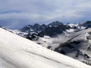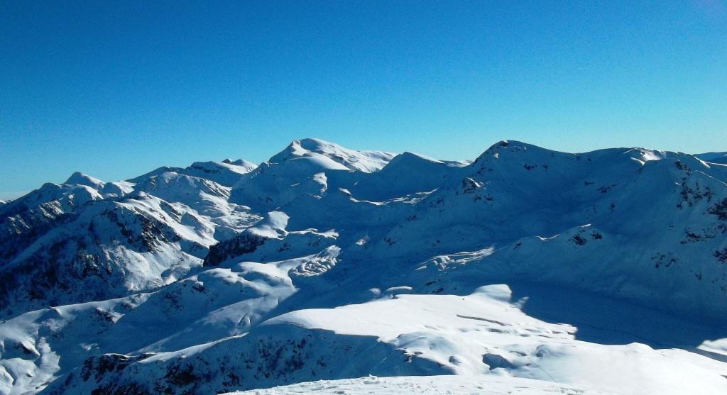 per la discesa ci sono molte varianti che vanno scelte in base all’assestamento del manto, il canalone e le varie dorsali alla sua destra o sinistra richiedono nevi ben assestate oppure si riscende dal versante di salita