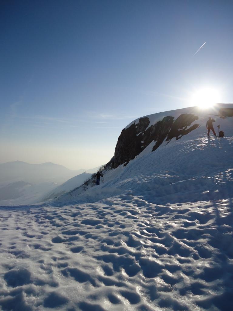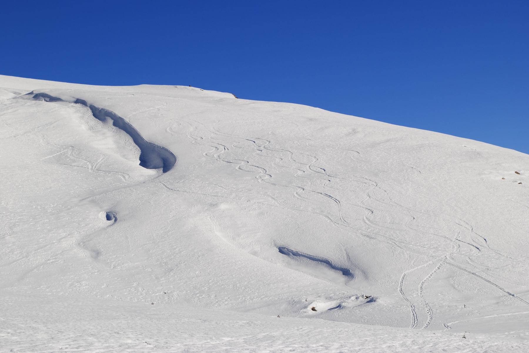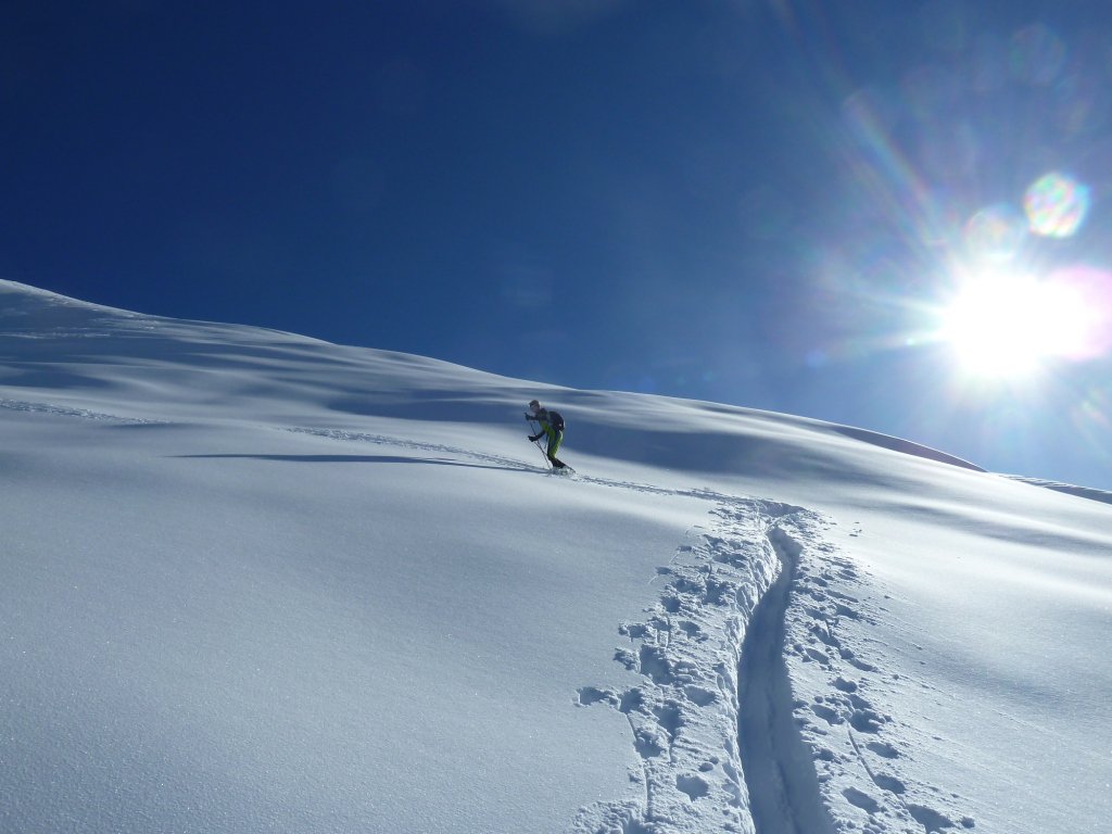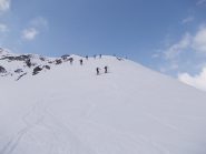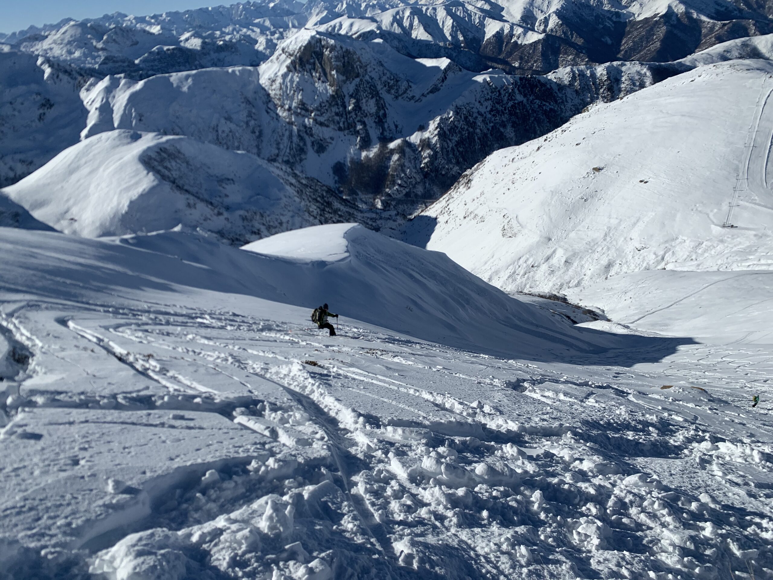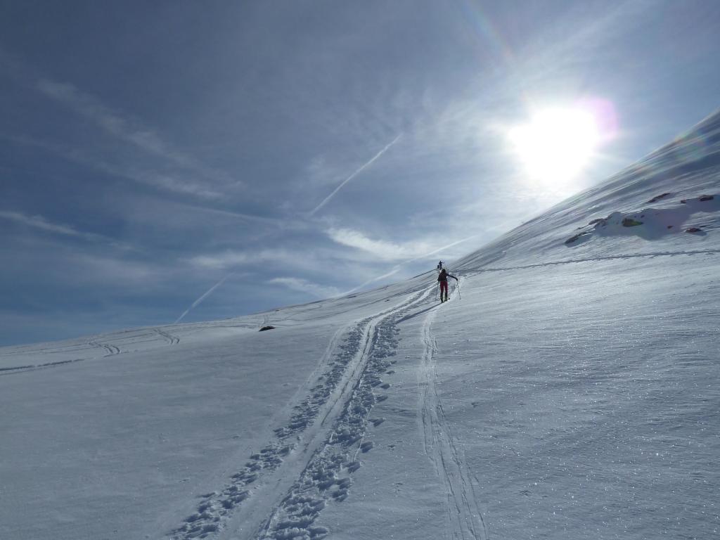 Si piega a sinistra e si risale la dorsale in massima pendenza ed entrando in parte nel canalone solo se la neve è assolutamente sicura.