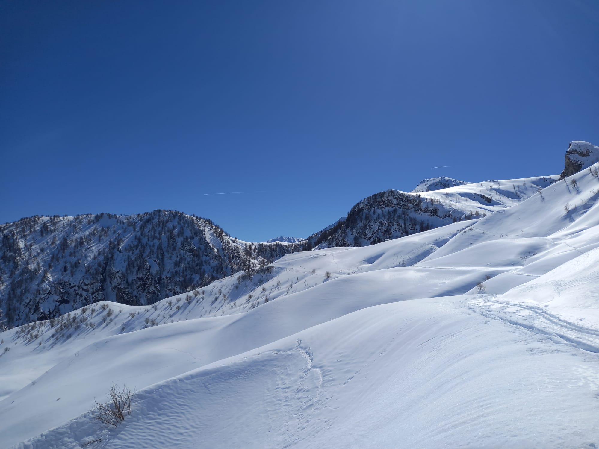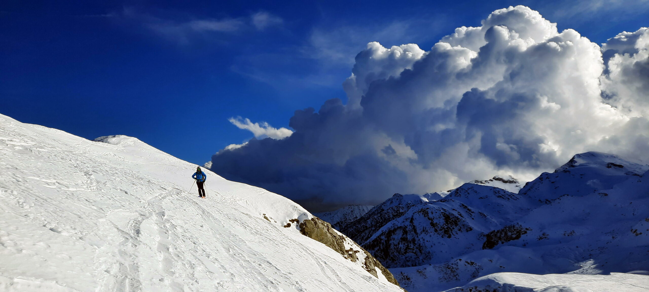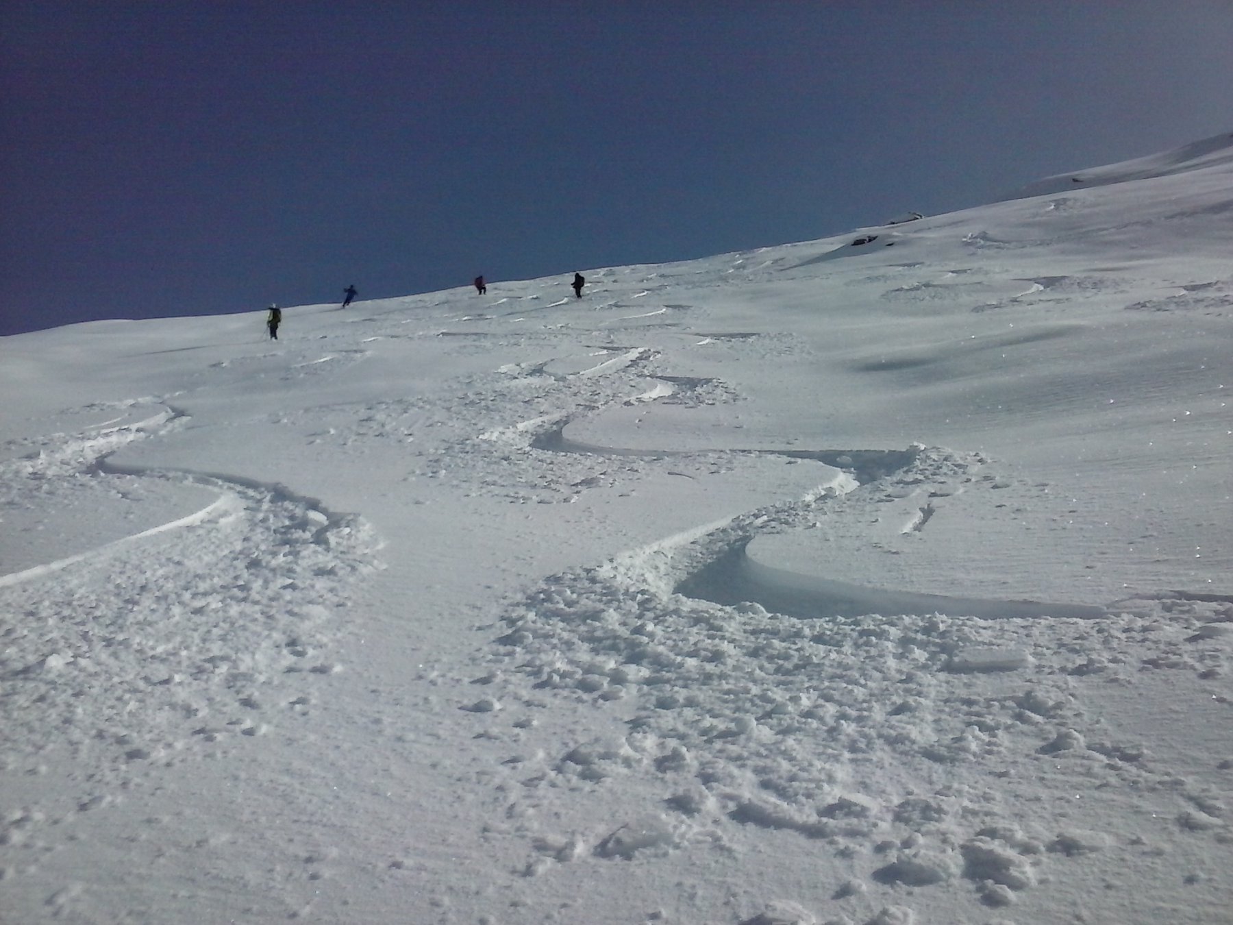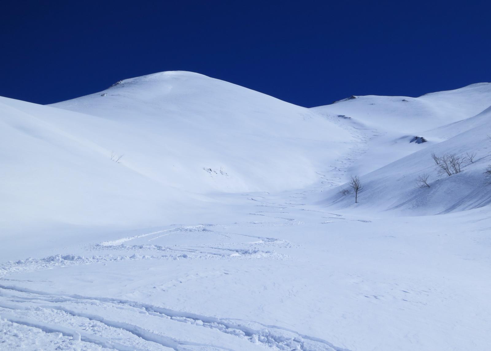 Si piega a sinistra e si risale la dorsale in massima pendenza ed entrando in parte nel canalone solo se la neve è assolutamente sicura.