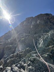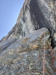 Via impegnativa che non regala niente, ma che ti fa sentire davvero in un altro mondo. Nei tiri facili, se non si vedono spits, seguire l’istinto e andare sul facile porta sempre alla sosta; nel primo 6a+ lo spigolo si supera andando a sinistra e poi si deve risalire il diedro prima di arrivare alle lame. Per il resto la via è abbastanza evidente e descritta bene sulla relazione. Sui tiri di 5c si deve assolutamente integrare, friends secondo me obbligatori su quasi tutta la via. Meglio essere un po’ più pesanti e portare molti rinvii così da poter allungare le protezioni, o portare direttamente gli slungoni. Le soste al momento sono tutte collegate. Il 7a per me lo vale tutto il grado 😅 Jack punta sul 6c+, invece i tiri dopo, data la stanchezza, si fanno decisamente sentire… soprattutto l’ultimo (guardate bene i commenti qui perché teo ha scritto dei gradi più giusti: l’ultimo tiro non puó essere meno di 6a), ma sono così belli e continui che lo sforzo si deve fare!! Contare comunque molte ore per stare tranquilli 😊