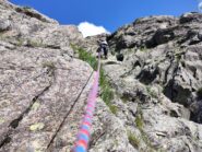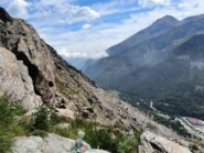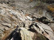b) andare a destra e portarsi su "labirinto verticale" e per esso scendere (catene e corde fisse nei punti più esposti, al fine di consentire una discesa sicura anche in caso di maltempo)
