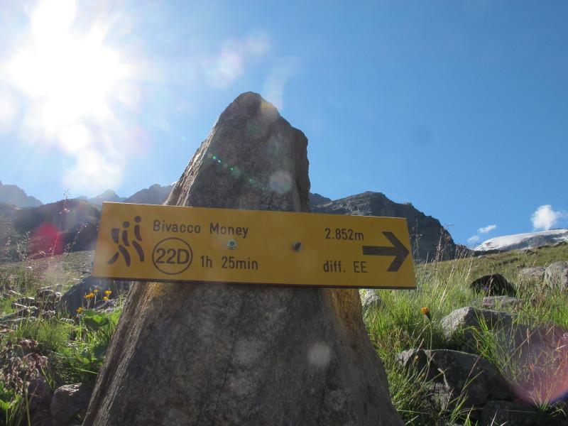 Discesa sul medesino percorso fino all’incrocio del sentiero 22 D che porta all’alpe Money prima e successivamente ,con alcuni sali-scendi, all’incrocio coi sentieri 22E (bivacco Martinotti) e 22 F (bivacco Borghi).