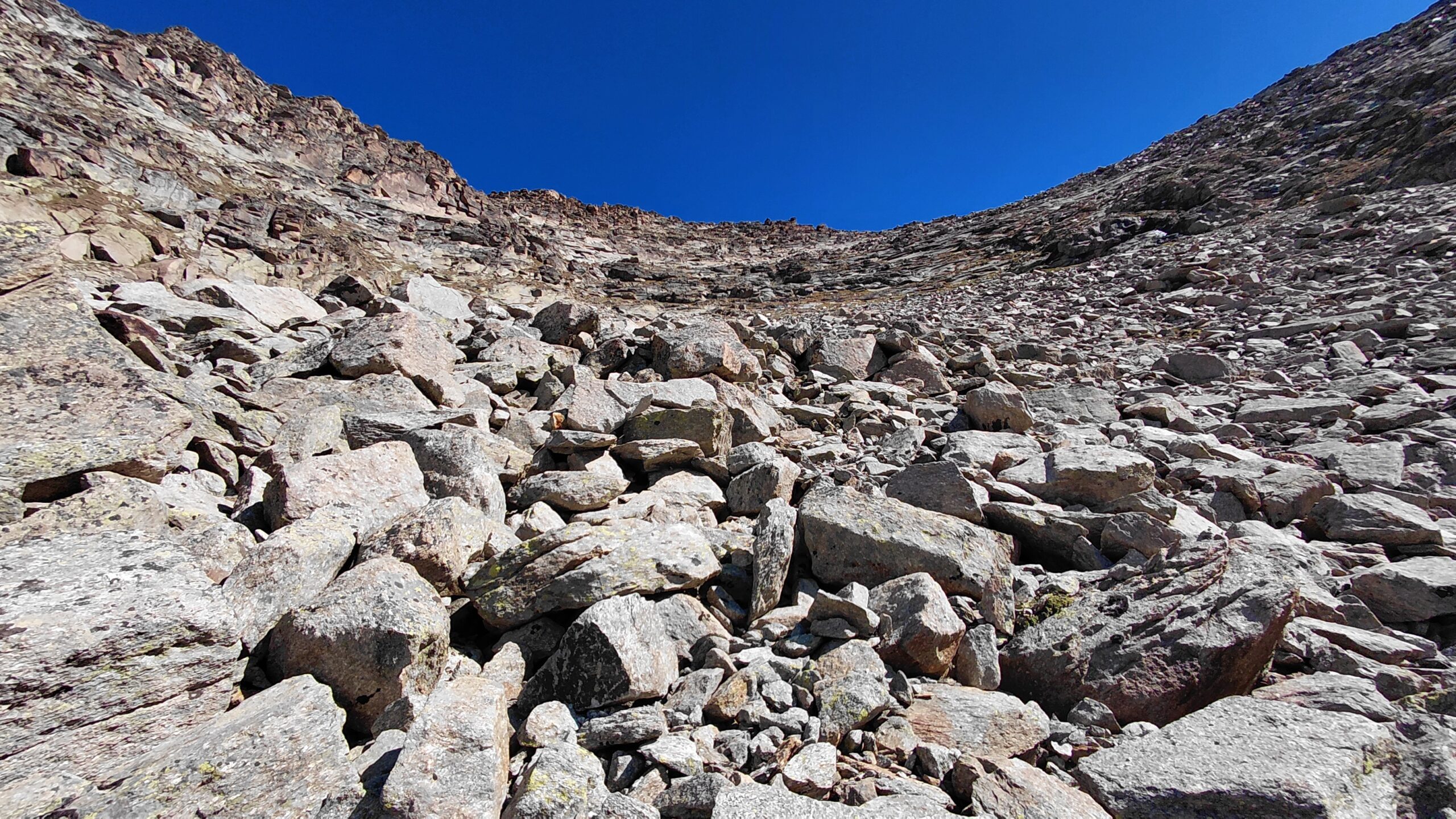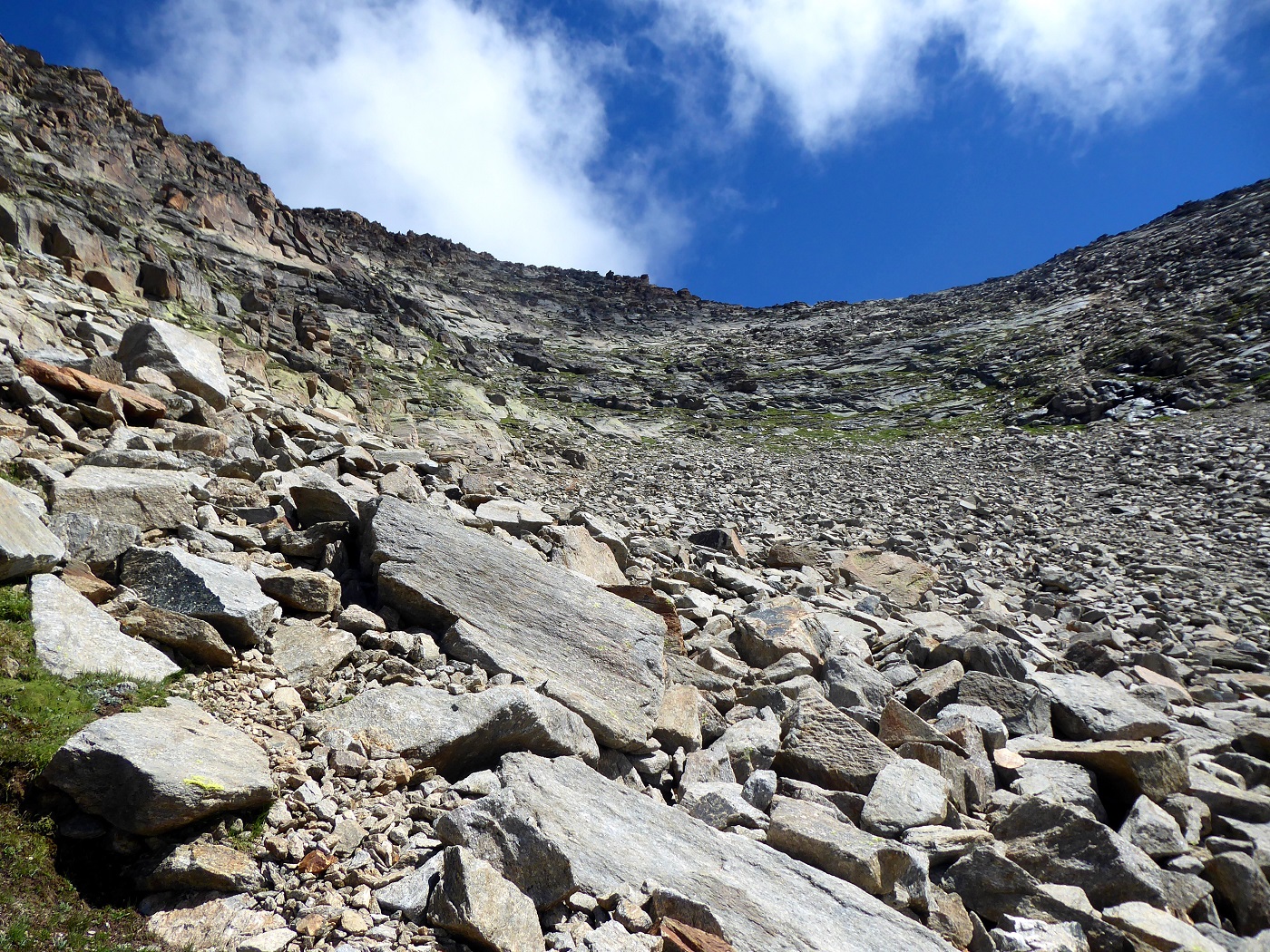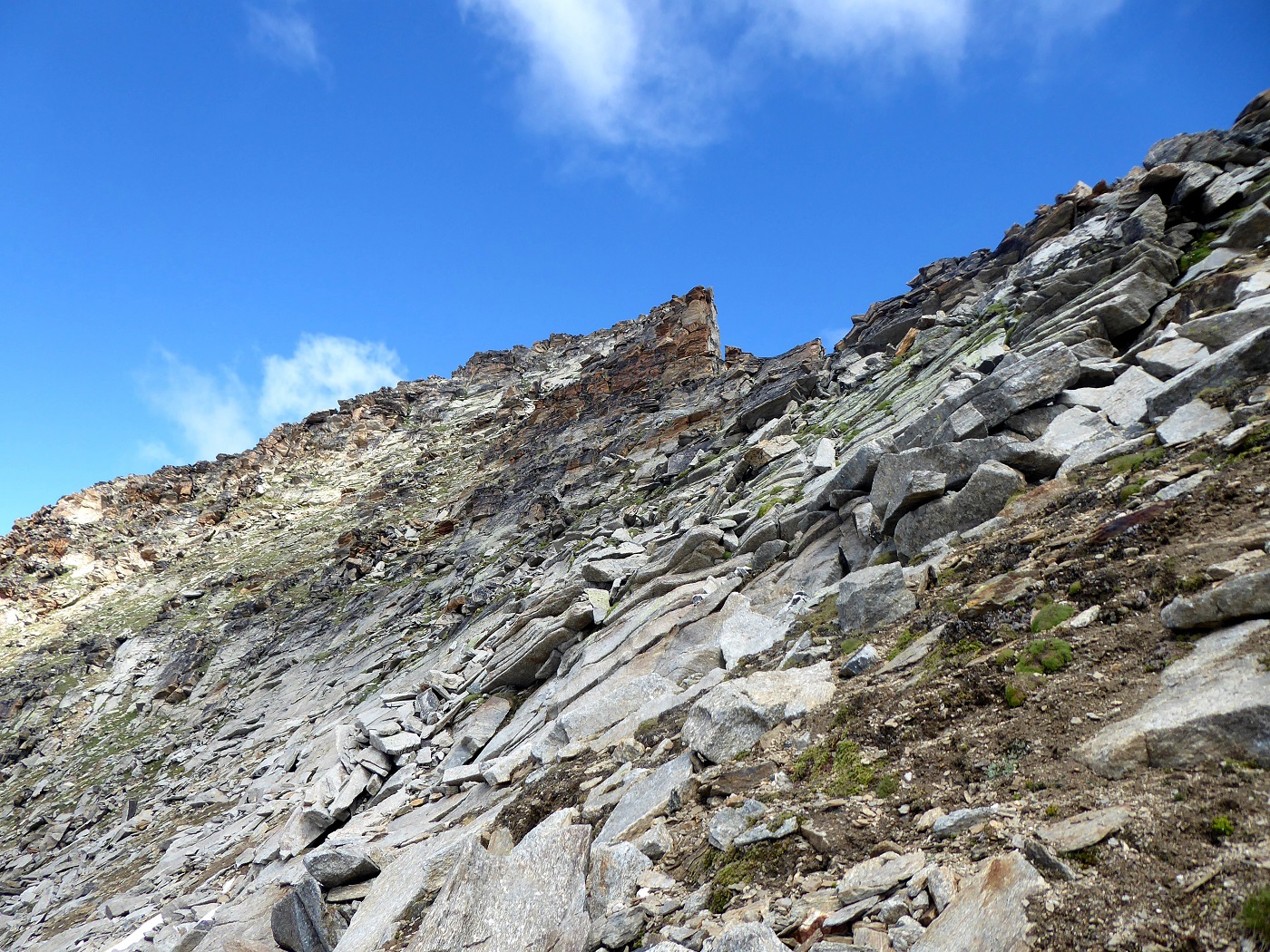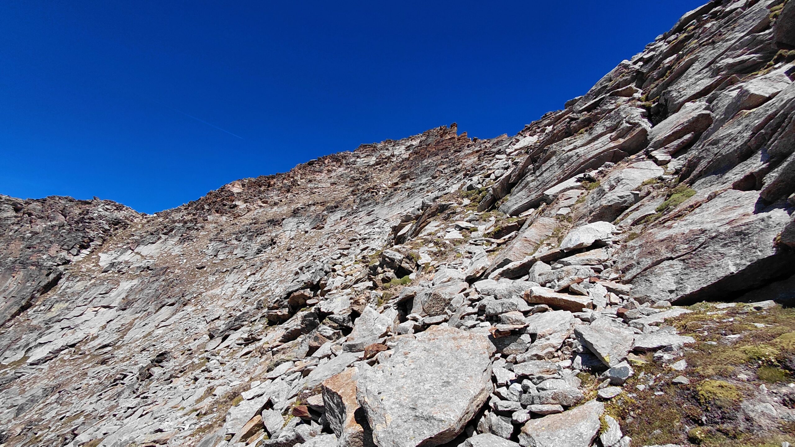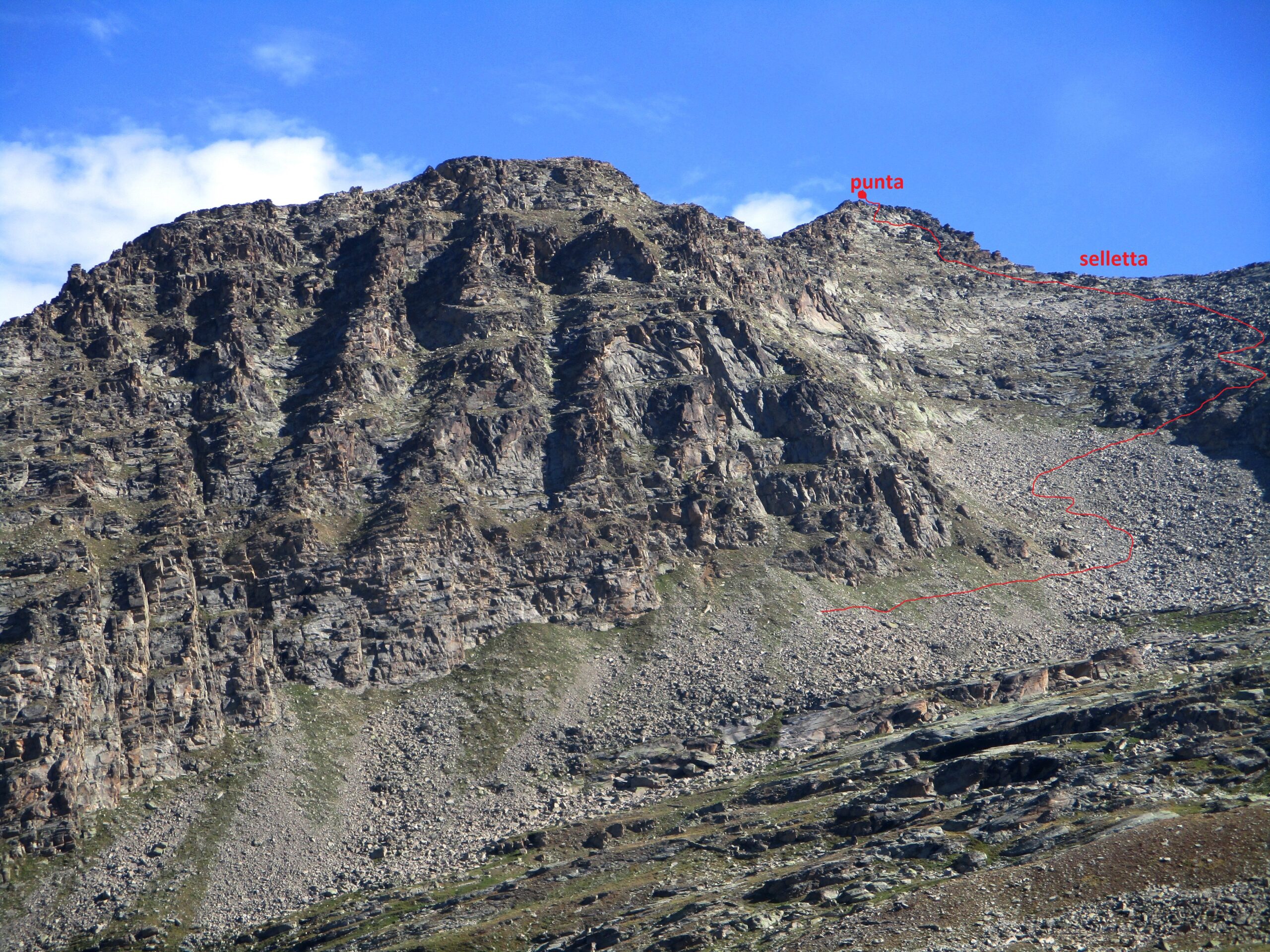 Occorre salire verso il lato dx della montagna, facendosi strada tra iniziali cenge e poi per terrazzini con diverse pietraie e sfasciumi da superare, dirigendosi verso la cresta SE e quella che sembra una selletta.