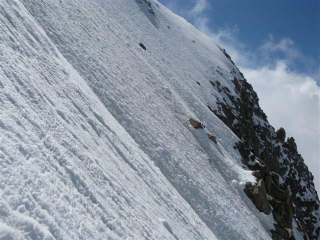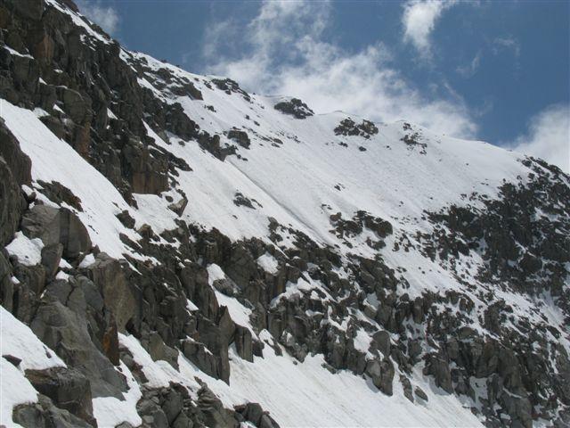 Gita assolutamente da non sottovalutare nonostante il modesto dislivello. Tentata la normale dal bivacco carpano siamo arrivati 100m sotto la vetta e poi abbiamo dovuto ripiegare perchè la neve stava smollando troppo rapidamente. Itinerario ben più difficile di quanto riportato, secondo me è almeno PD: innanzi tutto non c’è più lo scivolo di neve che raccorda il bacino glaciale di Rocciaviva con i pendii superiori, ma occorre superare una fascia di rocce rotte (II) oppure risalire un tratto del canale che porta al colle della Pazienza e poi compiere un lungo traverso verso destra. Inoltre i pendii superiori sono molto ripidi (almeno 40°).