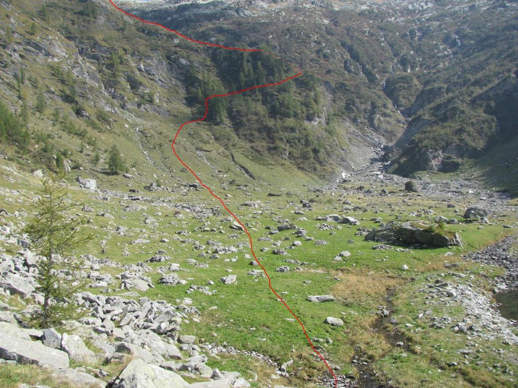 Giunto ai piedi di alcune placche scure e bagnate, a destra inizia una traccia di sentiero che risale un breve canalino , piega a destra e si infila fra le drose e taglia con percorso pianeggiante la barriera rocciosa (esposto), risale a sinistra sopra il dosso erboso-boschivo posto sopra il torrente da un lato ed il piano dall’altro. Salire il pendio con un leggero traverso in salita verso destra puntando alla base della parete rocciosa di Cima D’Arlens dove si intercetta il sentiero per il Colle d’Arlens, della via normale. (Essendo questo percorso più diretto, dovrebbe ridurre di circa mezz’ora il tempo di salita)
