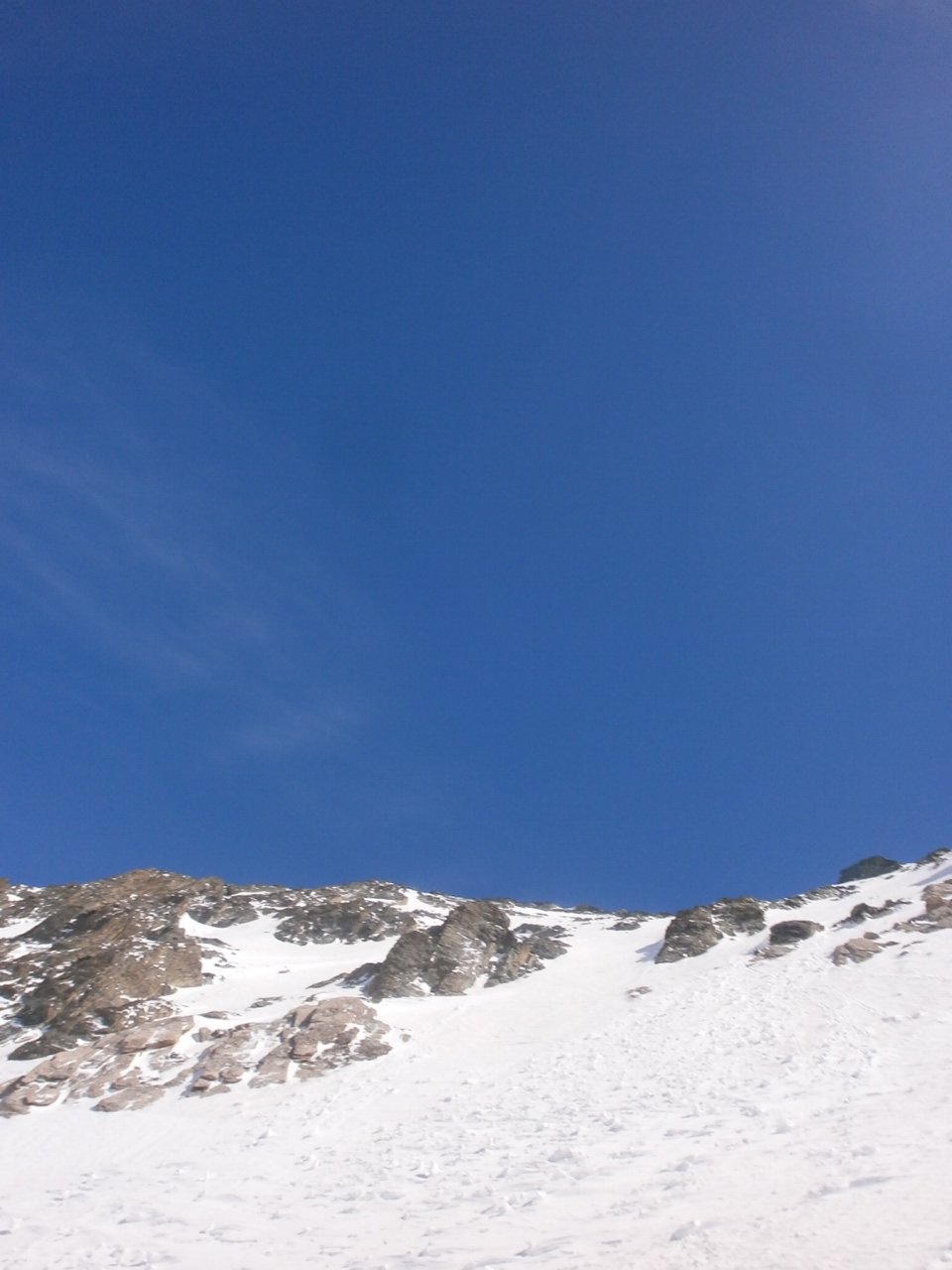 Il temporale della notte ha messo circa una decina di centimetri, con accumuli qua e la, ma niente di pericoloso su questi pendii con moderata pendenza, arrivato in punta sono sceso dalla sud-ovest, non son riuscito a partire dalla vetta in quanto manca neve, ma li ho calzati una cinquantina di metri più in basso, neve dura data la quota e per il forte vento freddo ma con ottimo grip per le lamine.