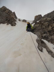 Meteo un po’ instabile che però ci ha permesso la salita. Giunti a Pian dell’olio, nuvole e nebbia sbarravano la vista sul Mongioie, ma abbiamo continuato e dopo il Bocchin dell’Aseo la visibilità è nettamente migliorata. Poco dopo le 9 eravamo nel canale che si presentava in neve marcia; questa volta non abbiamo sbagliato e dalle prime rocce abbiamo svoltato a sx, fondamentalmente proseguendo su neve sempre in quella direzione fino a incrociare una selletta nevosa dove abbiamo trovato 2 chiodi con cordino. Si svolta leggermente a dx e ci si immette in un canale nevoso che porta in cresta. Presenza di cornice in uscita. Sul versante nord la neve non scarseggia, ma le temperature sono un po’ alte.