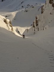 Il canale-camino con masso incastrato si raggiunge ottimamente con neve durissima, l’abbondante neve agevola il passaggio dello stesso (anche se attorno è un pò farinosa).