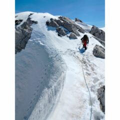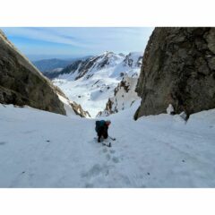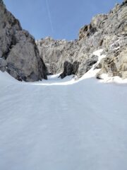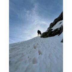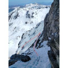 Partiti da viozene, Raggiunto bocchin d’aseo, quota neve dai 2000m, per nostra fortuna un pelo di rigelo c’è stato quindi era portante. Traversato poi verso la parete nord e imboccato il grande conoide, impossibile sbagliarsi, neve ottima nel canale, ma appena siamo arrivati sotto le rocce strampiobianti di cui cita la relazione siamo rimasti un po’ insospettiti perché le condizioni non ci sembravano ottime e quindi a naso abbiamo preso la rampa di sinistra, ben innevata doppiato la spalla e usciti in parete. Individuato poi dove era la biancardi abbiamo traversato legandoci verso destra in alto a quota 2530m, su Roccia non buonissima, un po’ pyscho, (vedi foto allegata) riuscendo a proteggerci fino ad incontrare il diedro camino con il masso incastrato, da lì in cima, buone condizioni, il passo del masso incastrato è pulito ma la restante parte è su buona neve portante. Discesa dalla normale e poi ritorno alle macchine contenti e soddisfatti. Con noi avevamo tutto, nut ( molto utili) friend, chiodi martello.