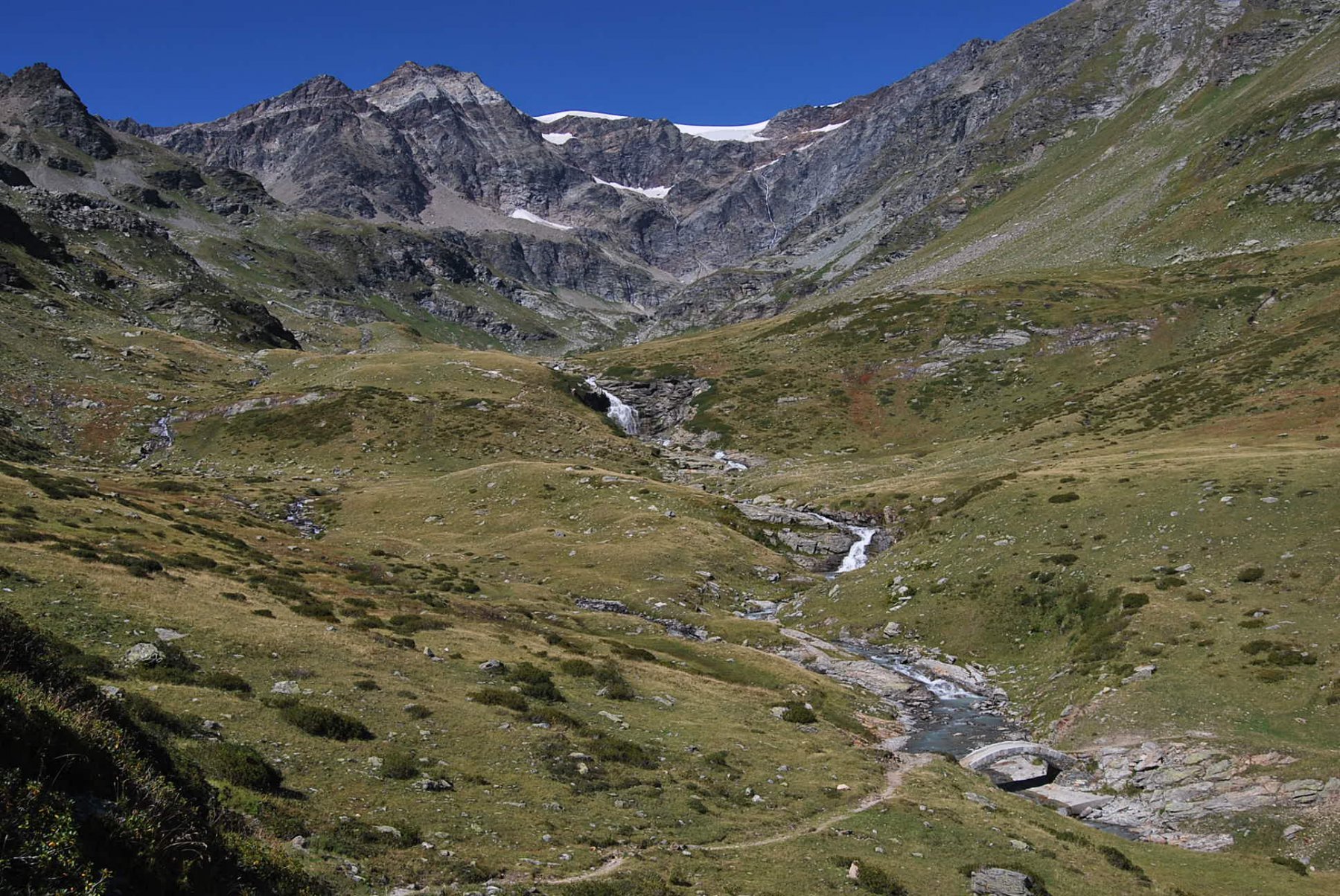 Dal colle inizia ora la discesa sul versante italiano sull’evidente sentiero n. 13 che, passati i ruderi di un vecchio fabbricato militare, scende a fondo valle, attraversa il torrente di S. Grato su un ponte e si innesta sulla sterrata ove vi sono gli alpeggi di Revera Superiore. Proseguire sulla sterrata fino agli alpeggi di Grande Alpe, arrivando in breve al bivio sulla strada asfaltata del lungo lago. Si segue ora la strada asfaltata fino a Bonne; all’inizio del villaggio scendere lungo la strada lastricata ad incontrare (indicazioni) il sentiero 22 che, tagliando i tornanti, scende al capoluogo Valgrisenche.