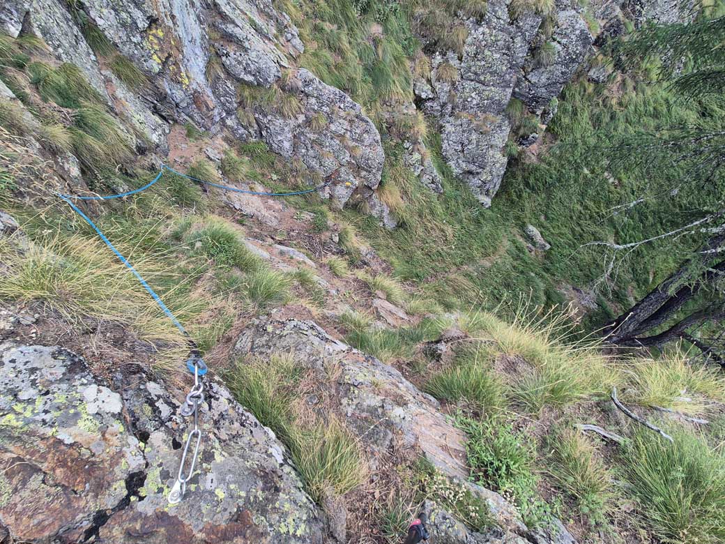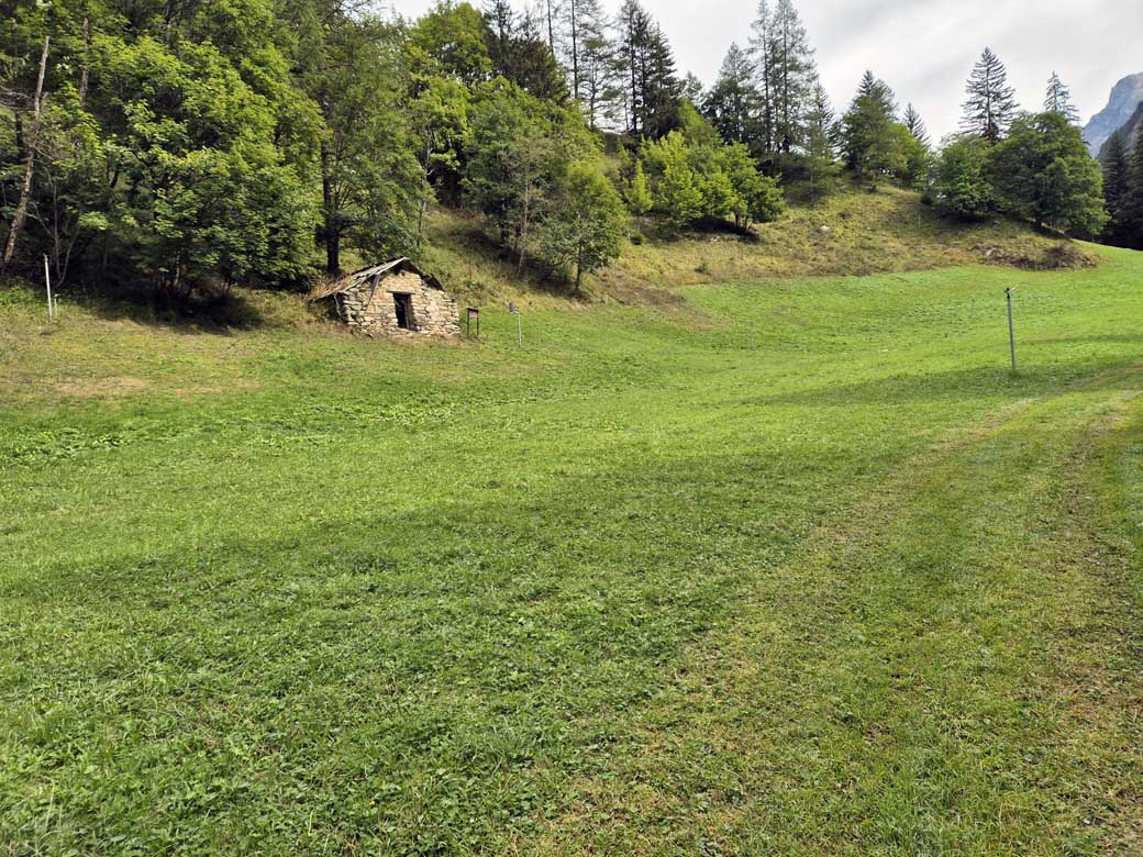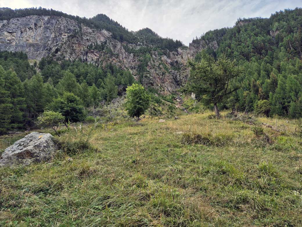 Il sentiero invece prosegue a sinistra poco prima dell’alpeggio, entrando subito nella fitta pineta, e sale in buona pendenza con numerose serpentine. Quando il bosco inizia ad essere meno fitto ed i larici prendono il posto dei pini, si arriva di fronte ad una zona più impervia, tra piccole barriere rocciose che si superano tramite dei canalini erbosi privi di difficoltà, spostandosi via via verso nord.
