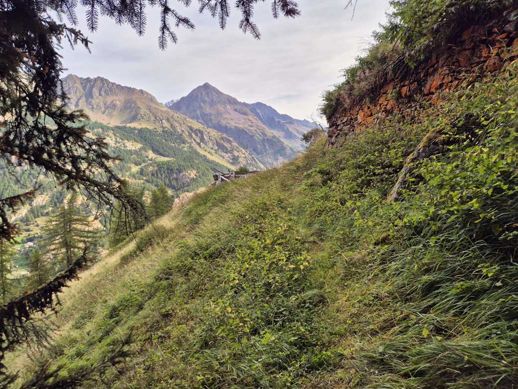 Di tanto in tanto si hanno delle belle vedute panoramiche sulla media Valpelline; il sentiero raggiunge, sempre ripido, una seconda zona rocciosa, dove si incontra un breve passaggio leggermente esposto attrezzato con una corda fissa ed un piolo metallico. Superato l’ostacolo la marcia torna più semplice, ancora ripida per un tratto fra larici secolari, finchè la pendenza termina ed inizia un lunghissimo traverso.