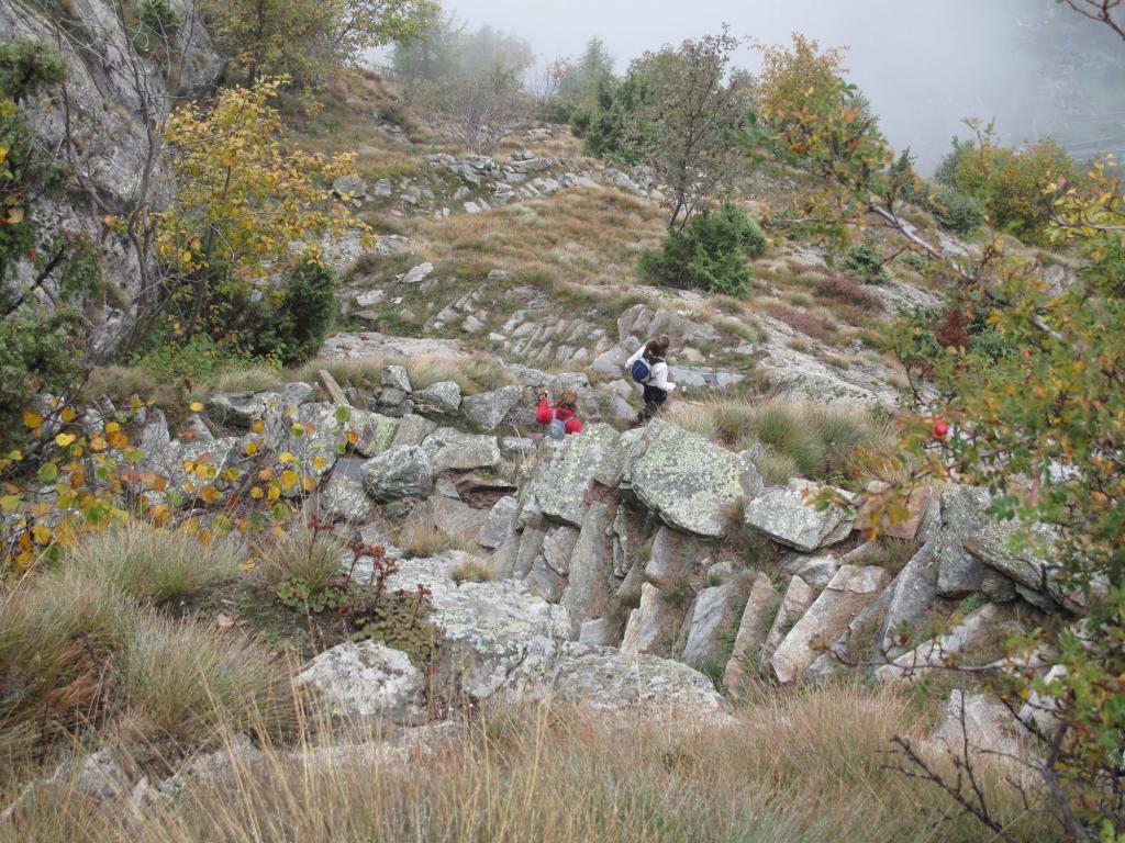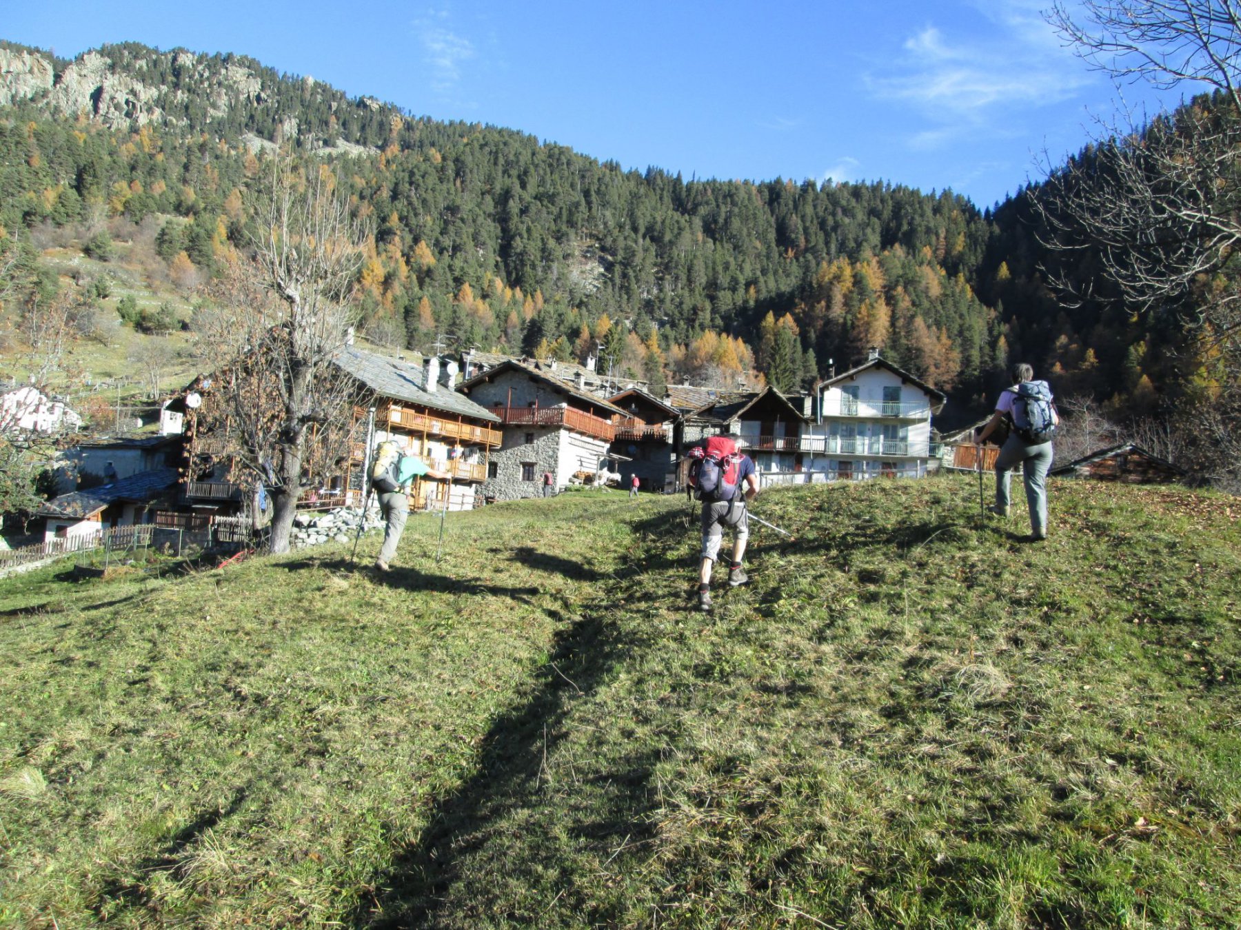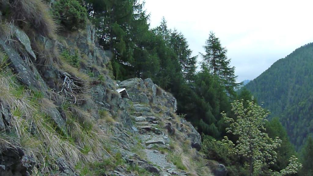 Il sentiero passa esattamente dietro la casa a piu’ piani e prosegue subito in piano, per poi attraversare verso sud nel bosco, salendo ripido, con l’aiuto di svariate centinaia di gradini, ricavati su cenge, a volte aeree sulla valle sottostante; salire i numerosi tornanti fino a raggiungere una bella vasca dove zampilla una fonte; dopo cinque minuti si arriva all’aereo villaggio di Barmelle ed alla sua chiesetta; ampie vedute sulla bassa e alta val di Champorcher.