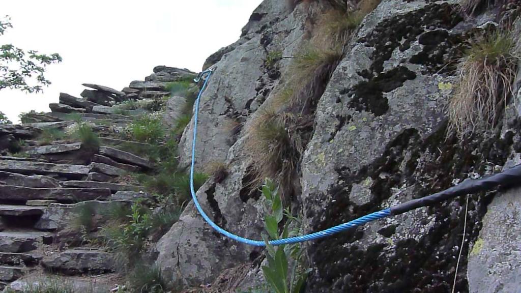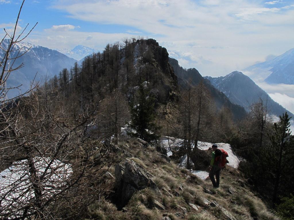 Panorama ampissimo. Dalla croce scendere sul versante nord fino al sentiero che lo attraversa e seguirlo verso sinistra; e’ semplice, ma scende molto, e in alcuni punti e’ ripido; le pietre, per il fatto di essere rivolto a nord, sono bagnate e scivolose.