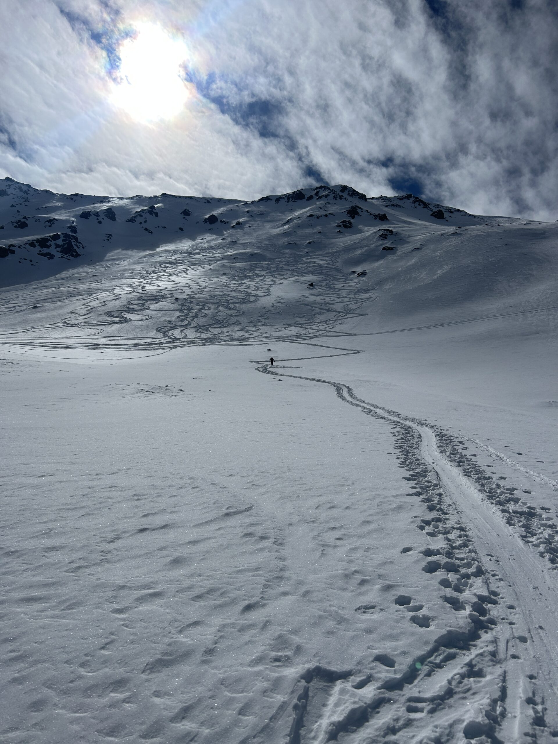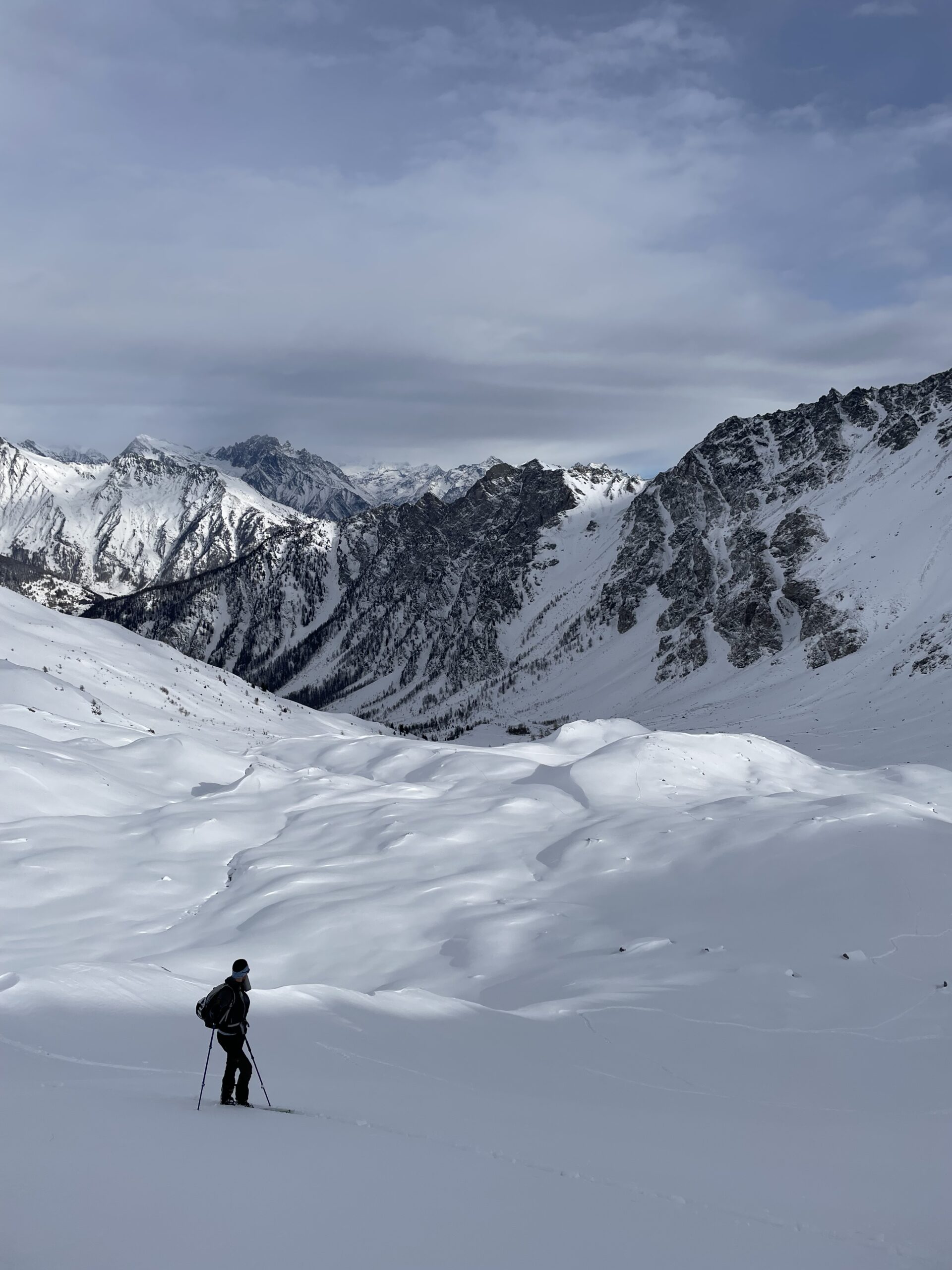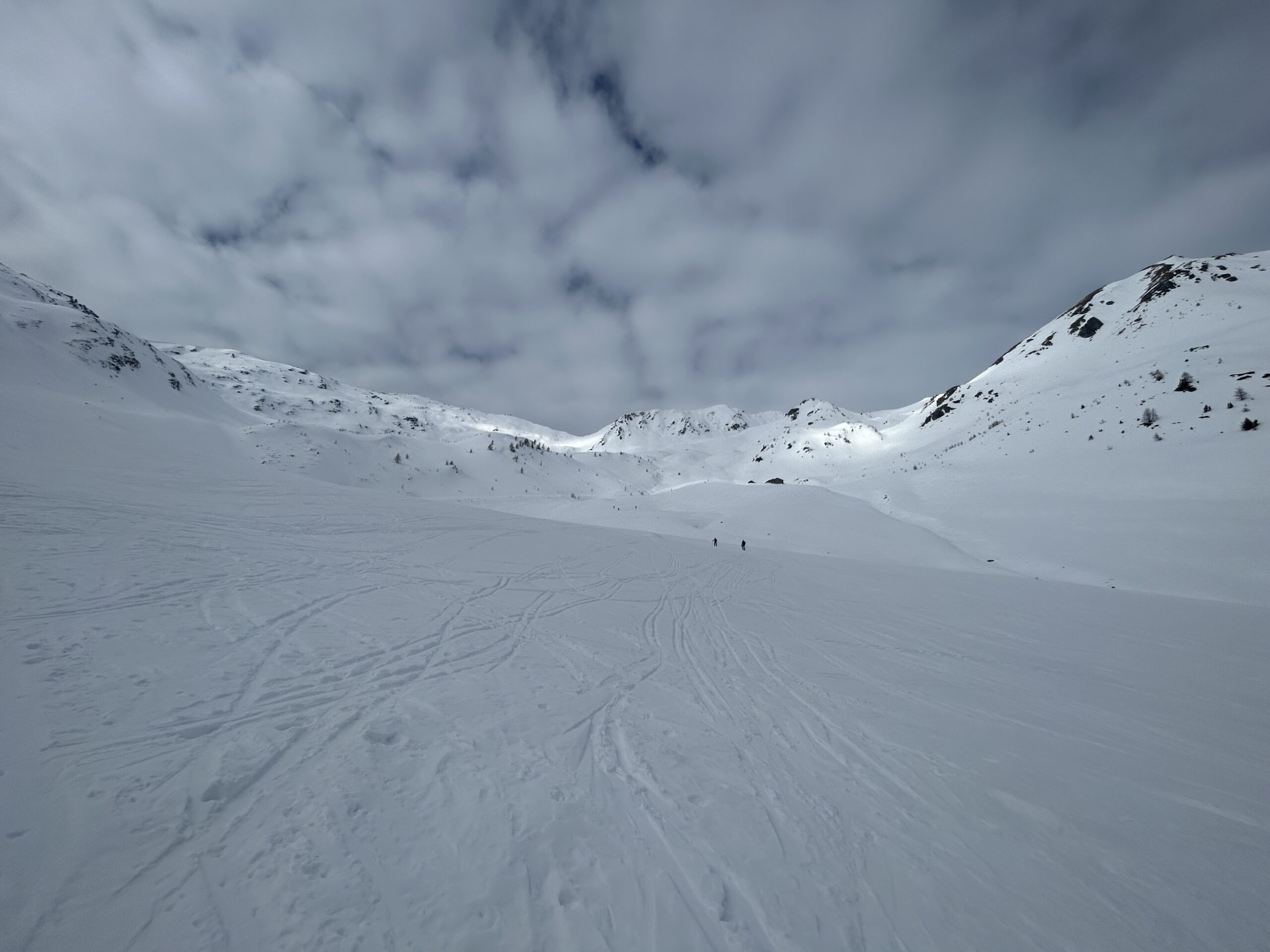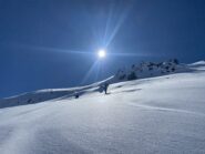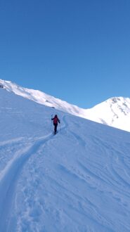 L’itinerario percorre alcuni tratti soggetti a distacchi valanghivi nella zona dove si lascia il classico percorso del Flassin in particolare nel canale che conduce al colle.