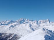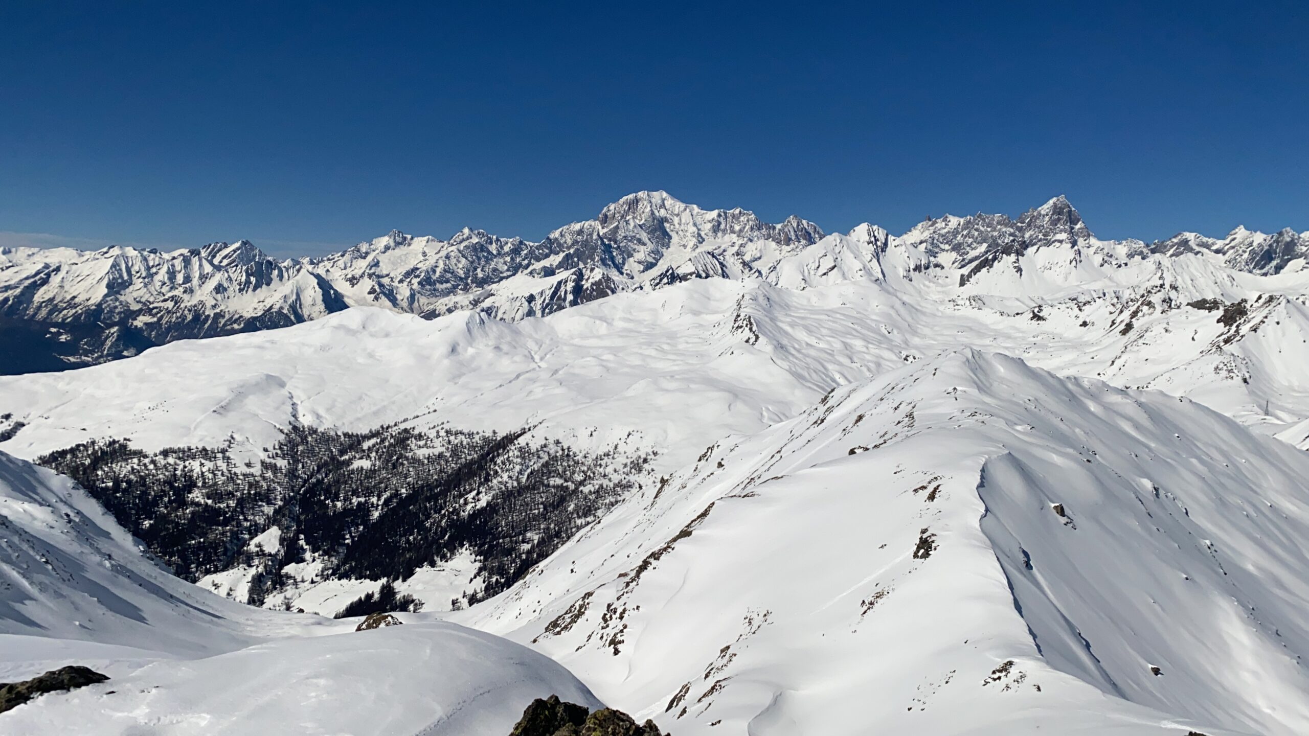 Dalla vetta ci si riporta al colle godendosi appieno della vista sul non lontano massiccio del Monte Bianco.