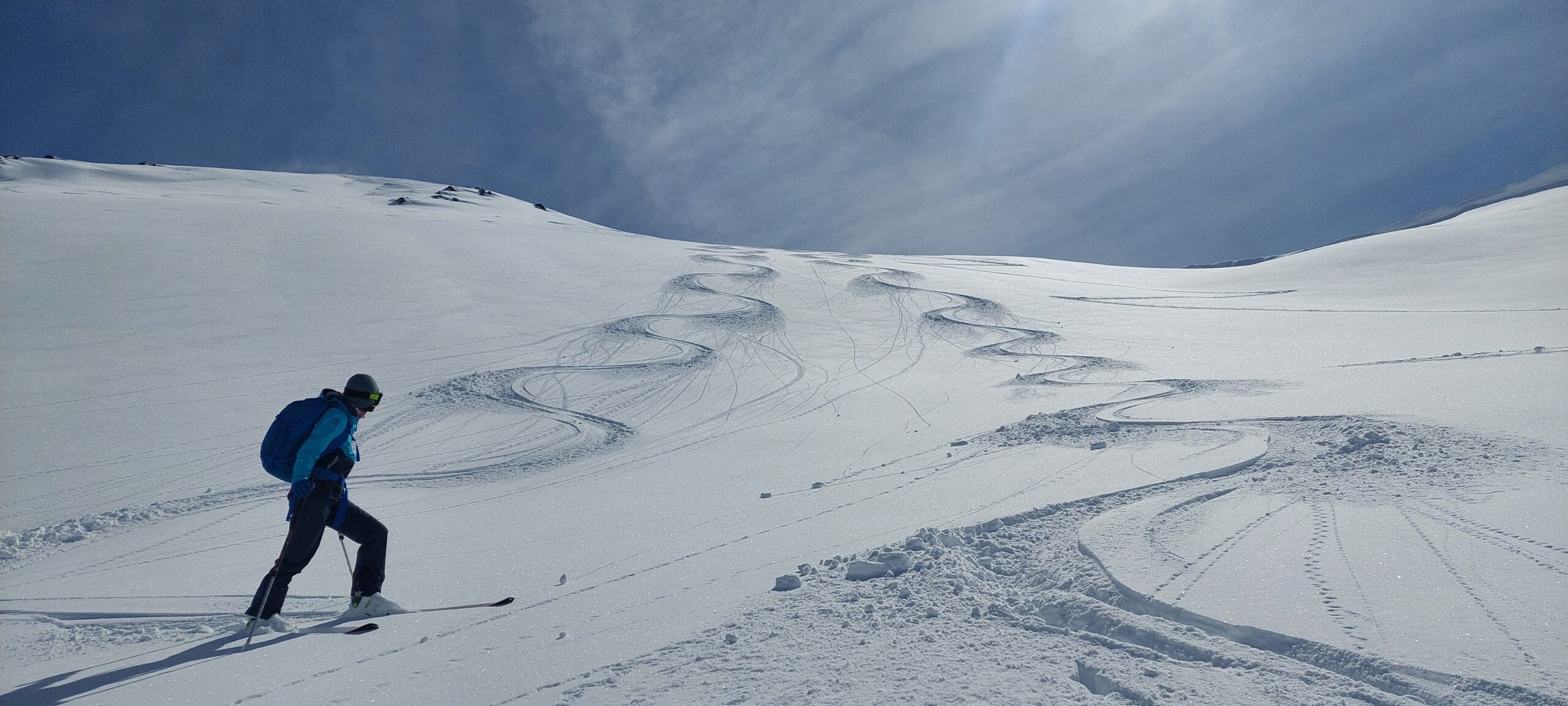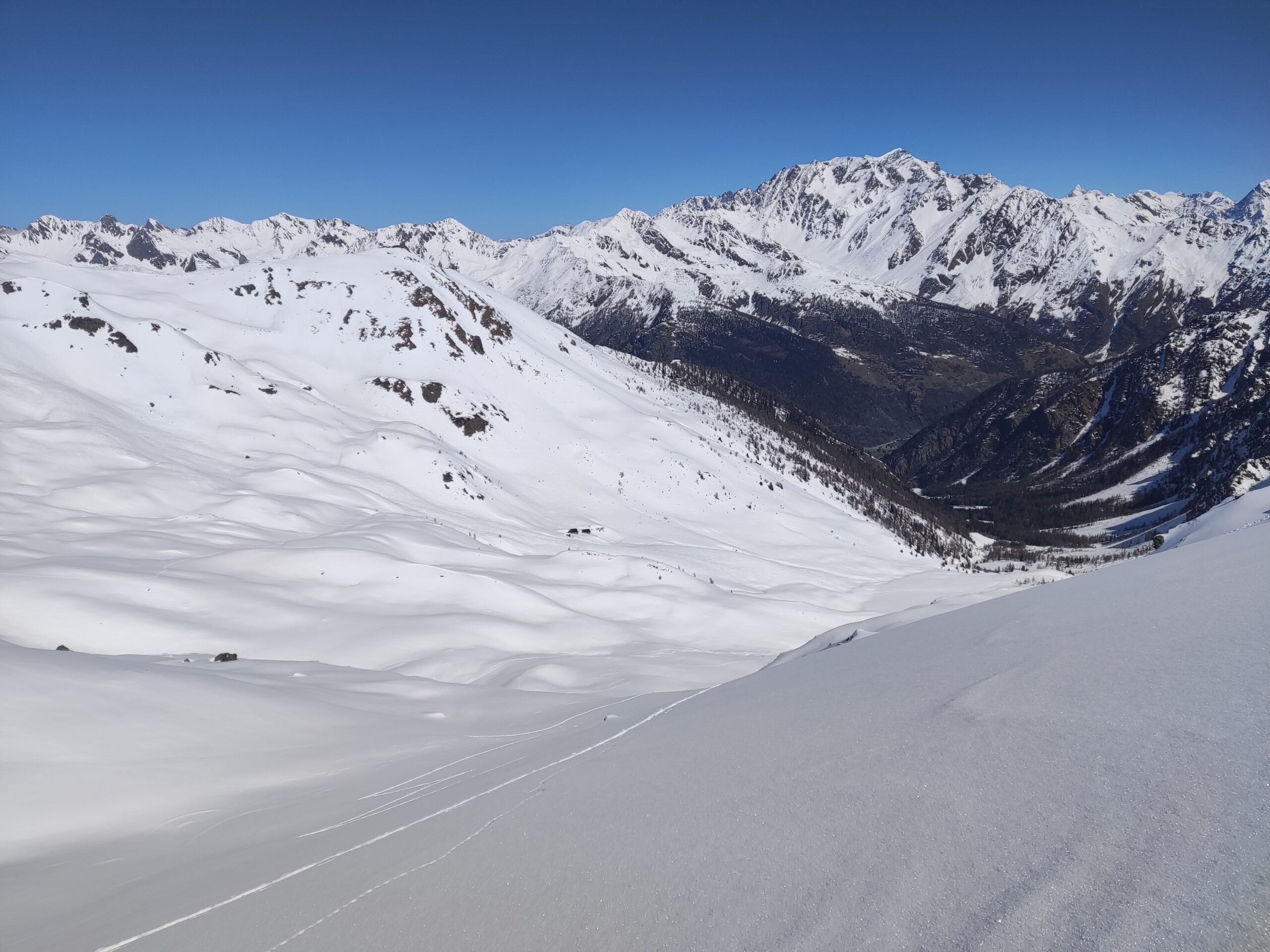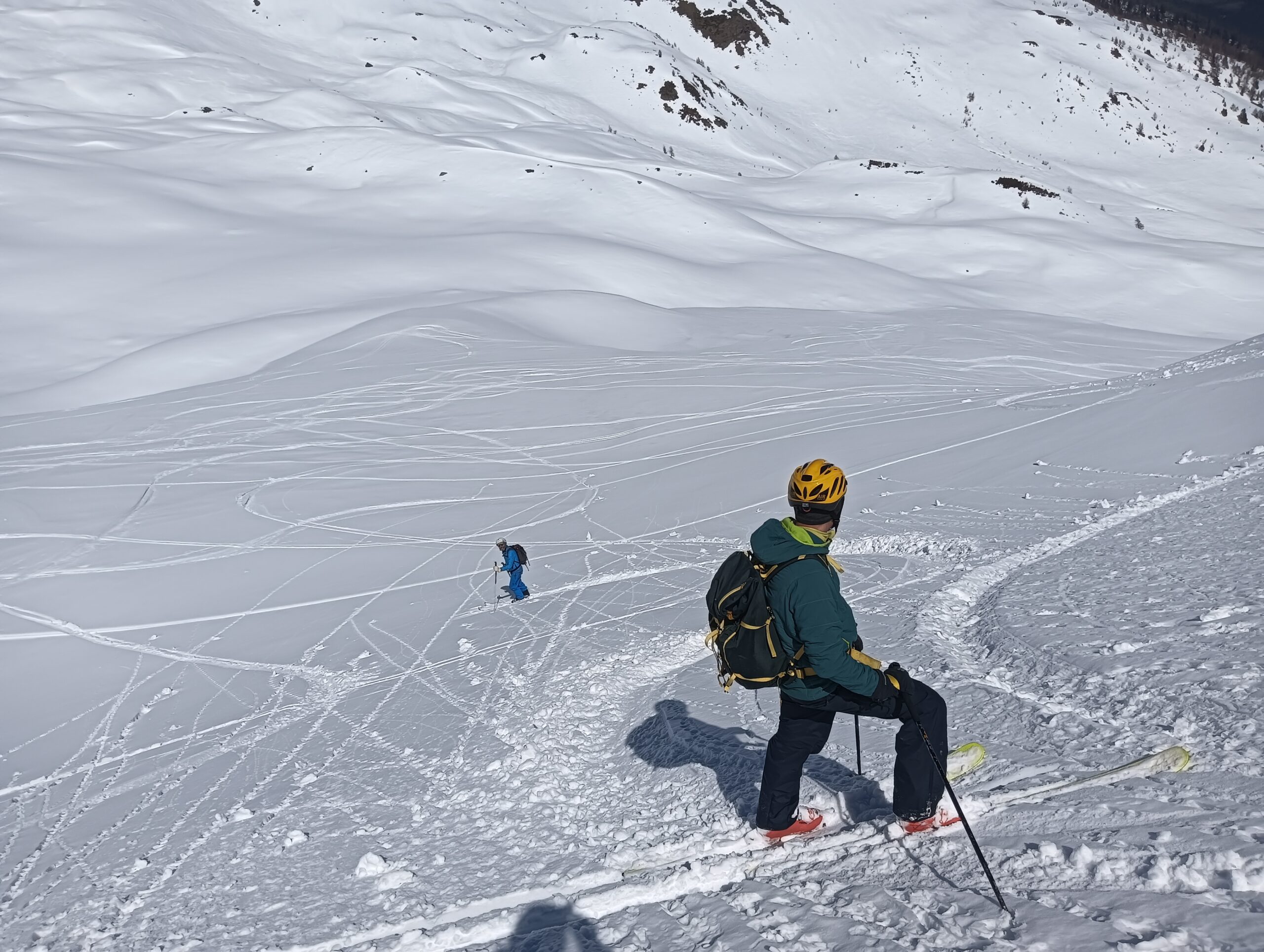 La discesa avviene sulle tracce di salita senza particolari obblighi di percorso sino al parcheggio.