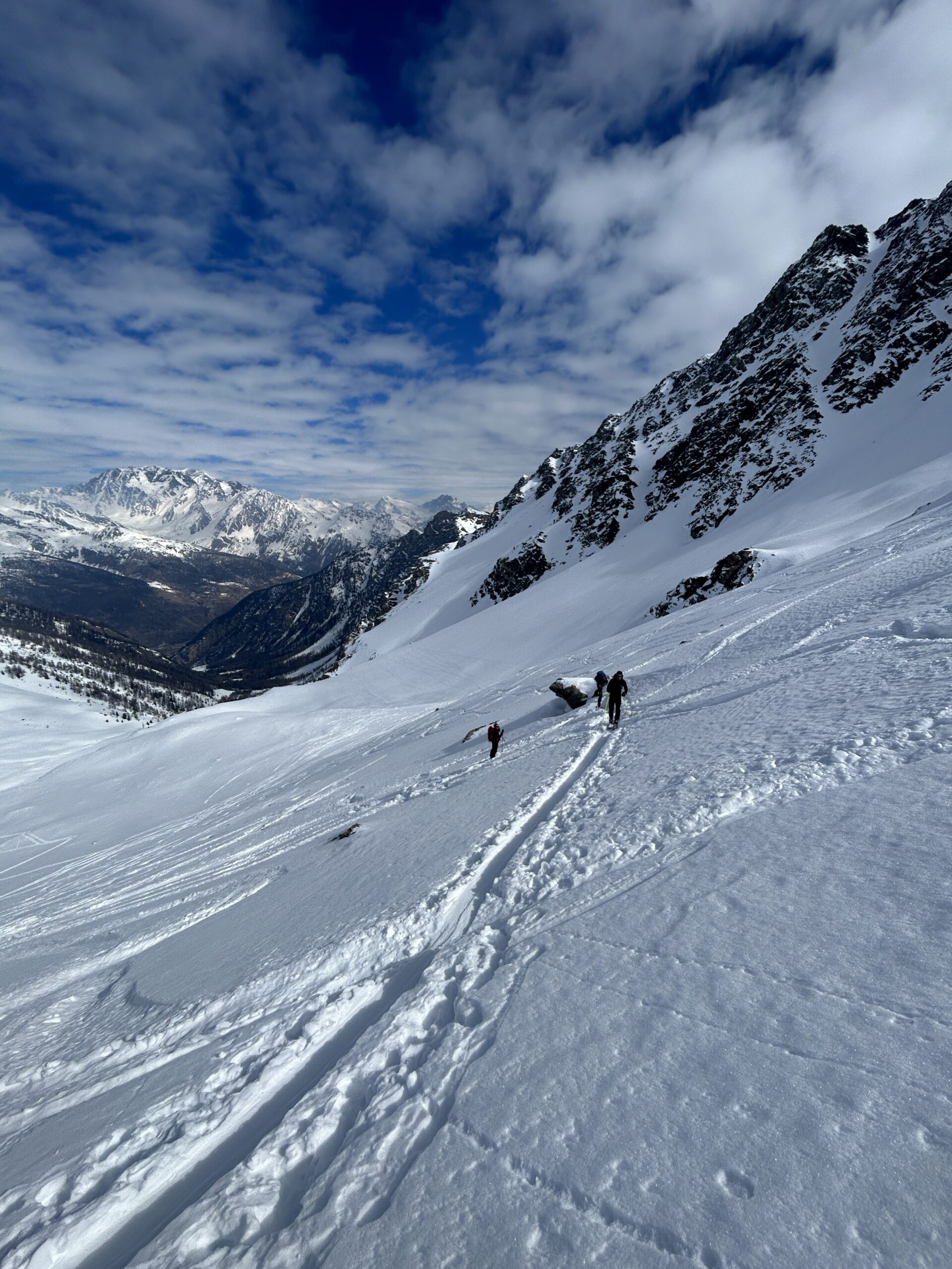 Attorno ai 2.450m la pendenza aumenta, con una serie di svolte si supera un ampio canalone e si raggiunge il Col Vertosan (2.698m).
