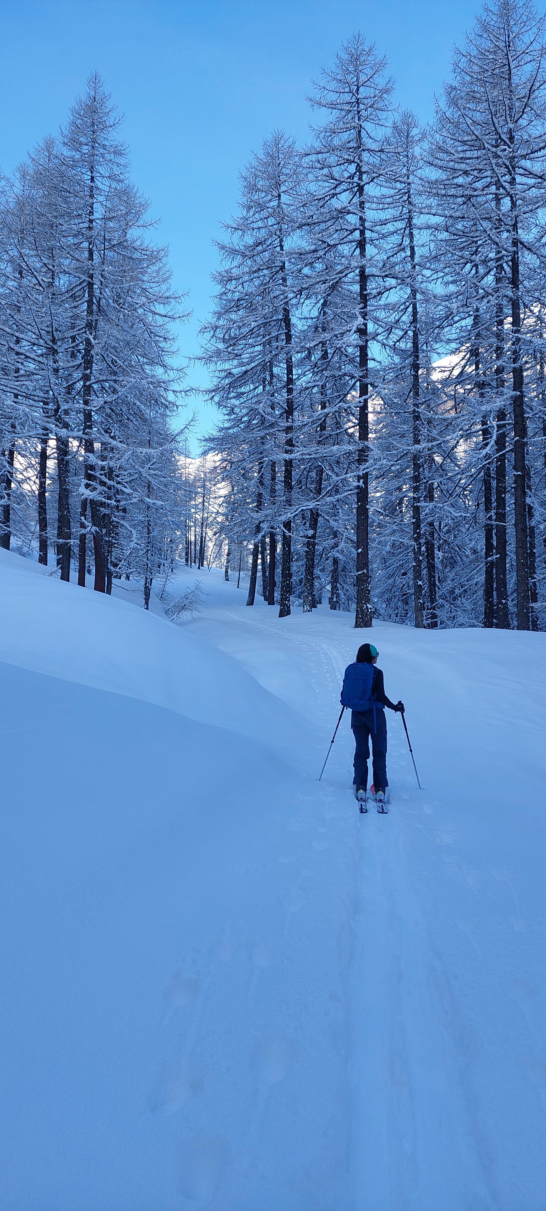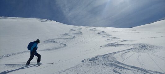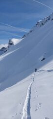 Abbiamo seguito un ottima traccia di 3 ragazzi,fino a quota 2350,poi ho tracciato io fino in punta,nella parte alta del canale ho sentito qualche assestamento,neve fresca dai 10 cm nella parte bassa fino ai 30 cm nella parte alta.