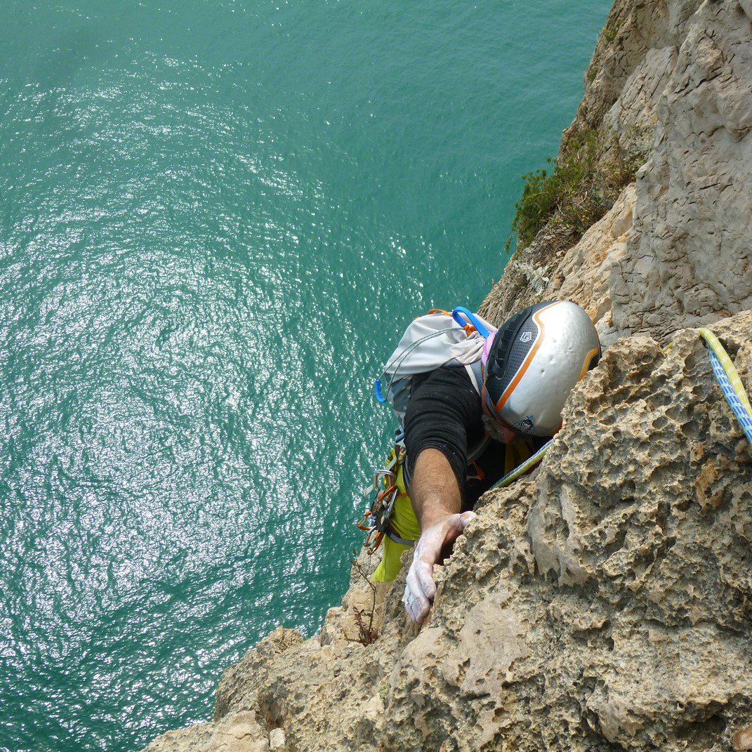 Il primo tiro è unto, bisunto e pieno di salsedine..ma ben chiodato, come il resto della via che è..SPETTACOLARE per ambiente ed esposizione. Un bel viaggio, sicuramente unico nel genere con due vertiginose doppie che depositano a pochi metri dall’acqua.