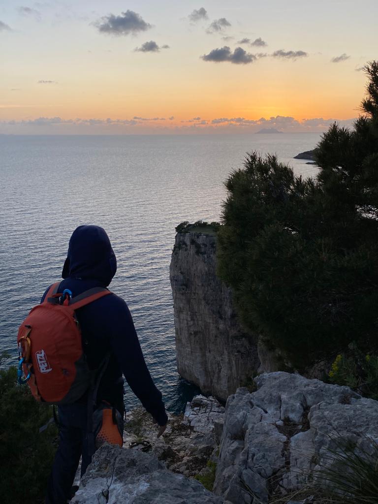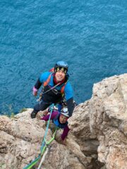 Con due doppie da circa 50 metri dalla via dei camini si scende a pochi metri dal mare su comodi cordoni,si traversa qualche meteo a dx dove si sosta per partire.