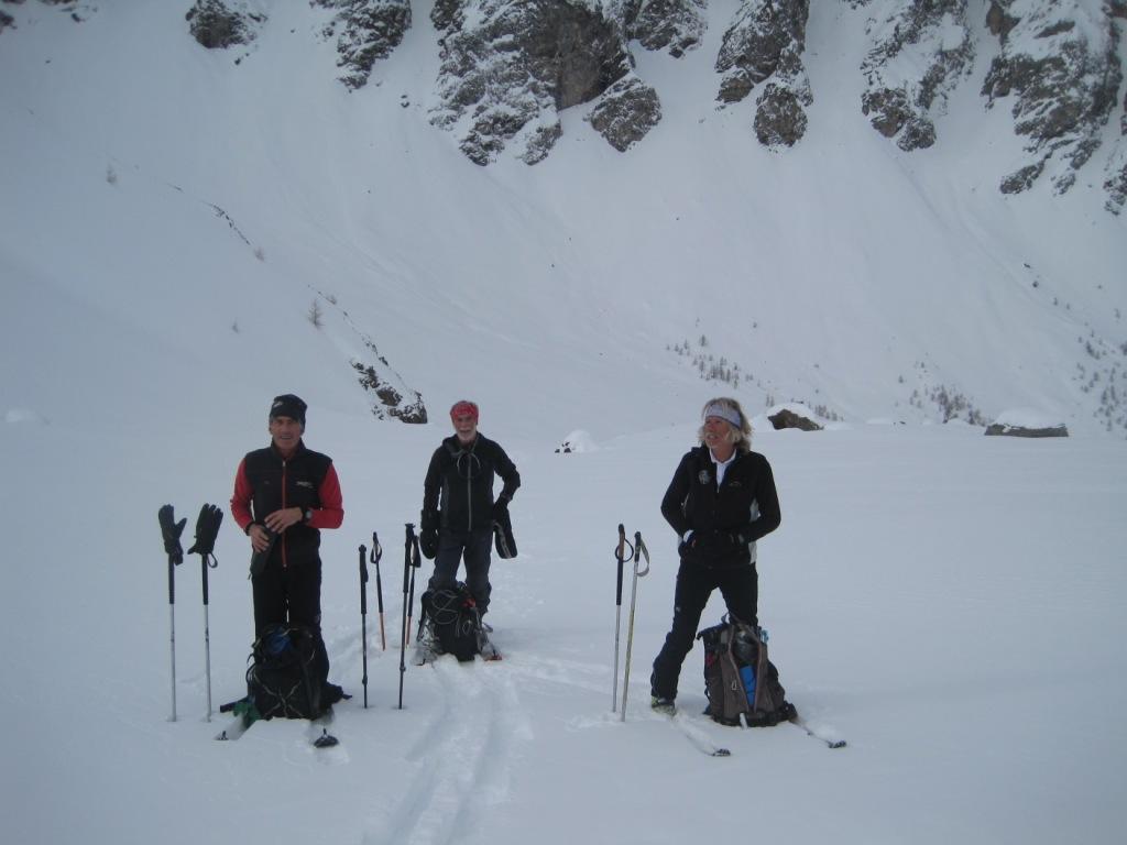 30-40 cm di farina lungo tutto il vallone. Poco prima del gendarme bifido del colle svoltati a dx e ci siamo portati alla base del primo canale dove abbiamo lasciato gli sci. Troppo carico il pendio che porta al canale più a destra che consentirebbe di alzarsi di più.