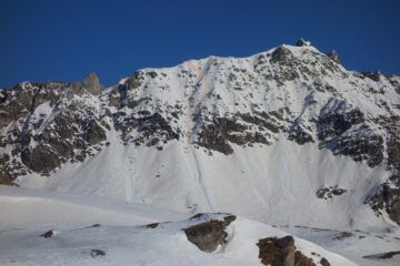 Dopo aver risalito il conoide si calzano i ramponi e si risale il canale con pendenze costanti sui 40° e qualche tratto molto breve più ripido.