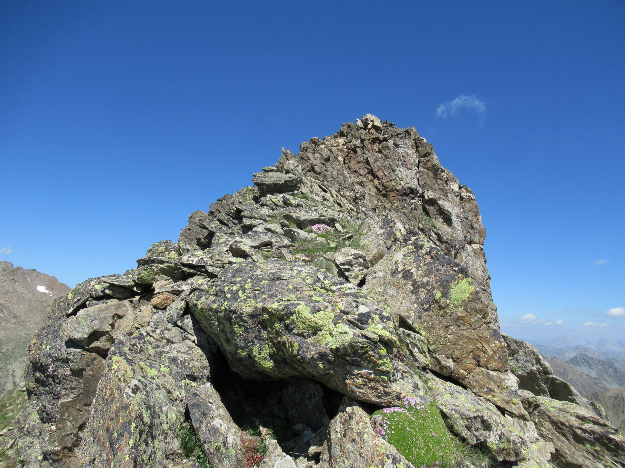 Abbiamo raggiunto il Rifugio Zanotti e ancora all’ombra, abbiamo proseguito la salita per raggiungere la conca di Schiantala’ e ad attraversarla, per poi risalire il ripido canale a tratti franoso con qualche pietra precaria e ad arrivare alla Forcella, da dove siamo saliti a sx su neve e rocce subito e poi direttamente tra rocce e tracce arrivando alla Cima Est (m.2949). Subito ripartiti, abbiamo seguito la cresta e dopo l’ultimo tratto aereo con divertente arrampicata (F), eccoci anche alla Cima Ovest (m.2954) dove pranziamo e poco dopo torniamo brevemente indietro per scendere direttamente la bastionata rocciosa (F) e poi tra pietraie e residui nevosi, scendiamo l’altopiano con i suoi laghetti e con breve salita tocchiamo anche la Punta Zanotti (m.2734). Seguendo i bolli rossi, continuiamo la discesa per arrivare al bivio presso il Lago di Laris, per poi continuare come da andata verso il Rifugio Zanotti e dopo la pausa con ottimo caffe’ freddo da Gianfranco, proseguiamo velocemente e con sempre piu’ caldo ad arrivare alla macchina chiudendo la magnifica gita.