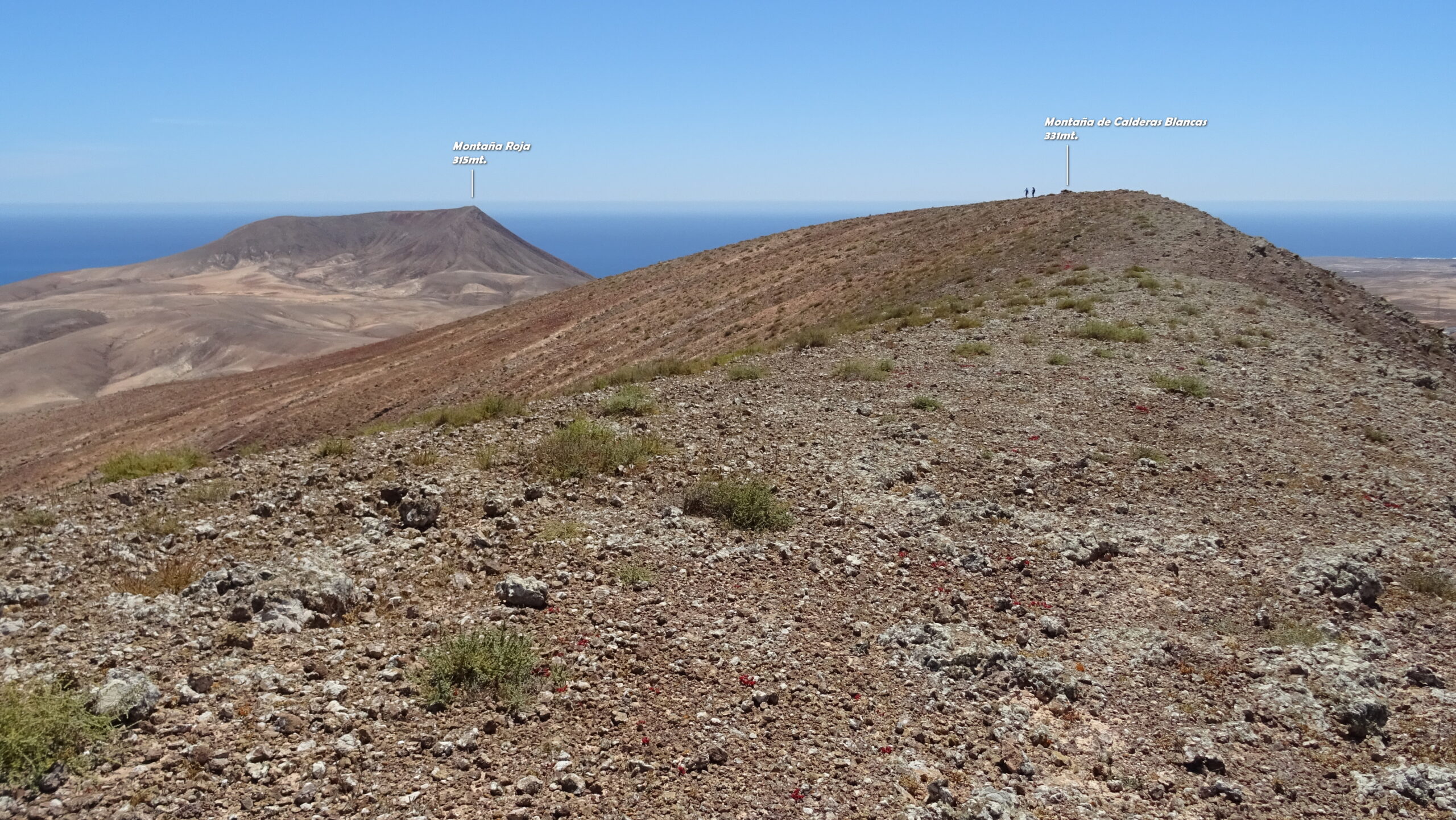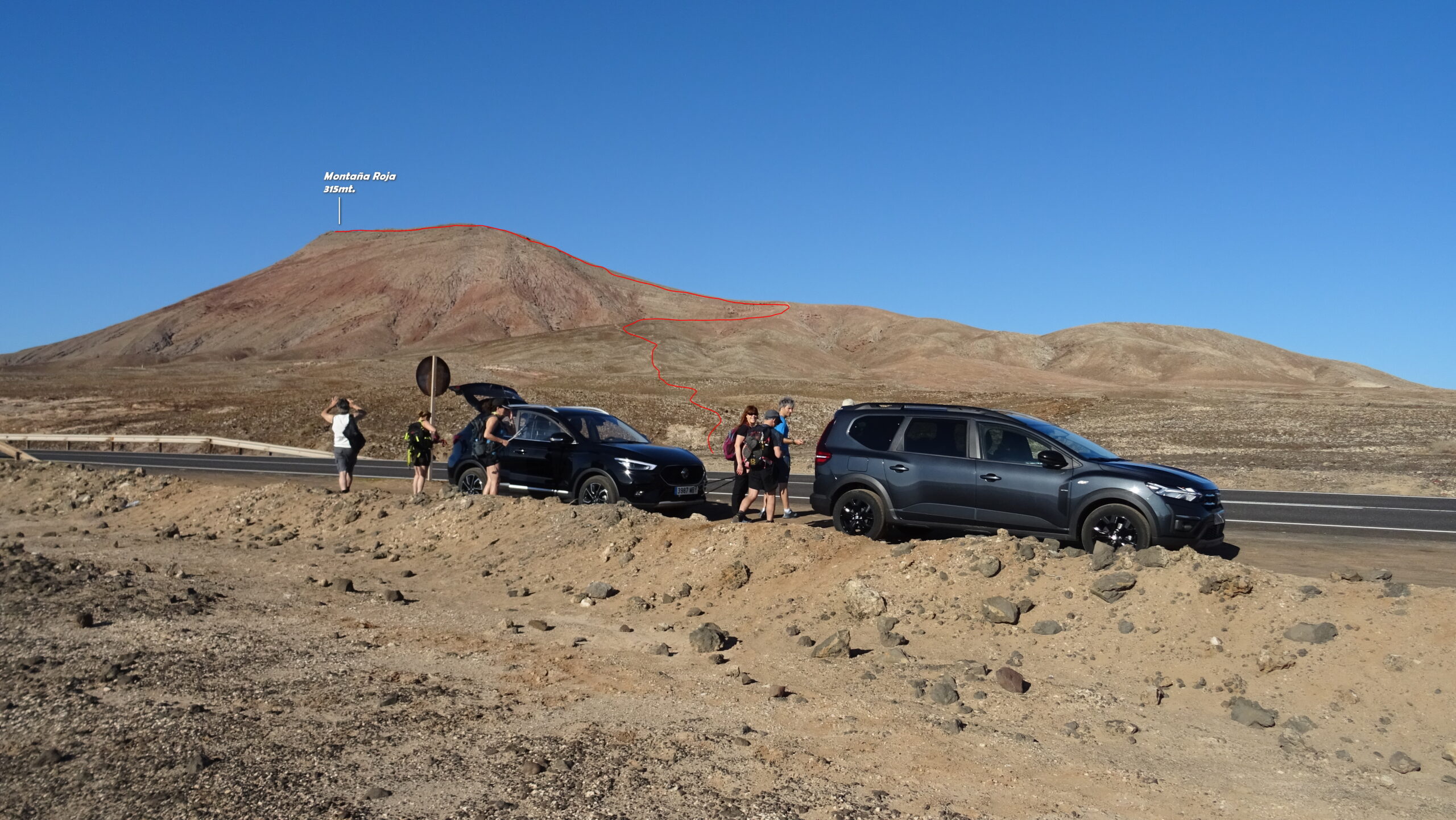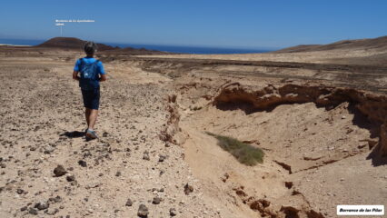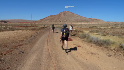 Partiti dalla strada costiera salendo alla Moñtana Roja sul sentierino che porta in cima. Tratto di discesa senza sentiero su terreno con ghiaietta simil sferica molto infida da fare con attenzione. Poi si traversa ad occhio verso la piana desertica che intercettando la strada che porta sotto i pendii della Moñtana Caiman. Salita seguendo una traccia GPS facile con tratti tra roccete vulcaniche e discesa facile su labile traccia. Tratto verso Moñtana de Calderas Blancas inizialmente su facile sterrata, poi salita e discesa fuori sentiero. Barranco de las Pilas facile ed intuitivo basta seguirlo per quasi tutta la sua lunghezza riportandosi verso il punto di partenza.