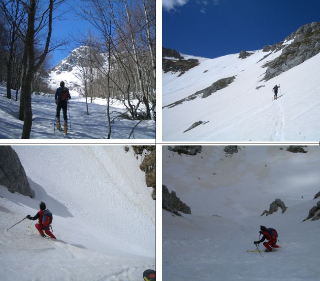 Continuare in direzione Sud-Ovest guadagnando dislivello a mezza costa,tenendosi alti nel bosco alla dx orografica di un canale.Si giunge infine, uscendo dal bosco ad una radura da valanga allungata che conduce dopo un pò all’anfiteatro sommitale.